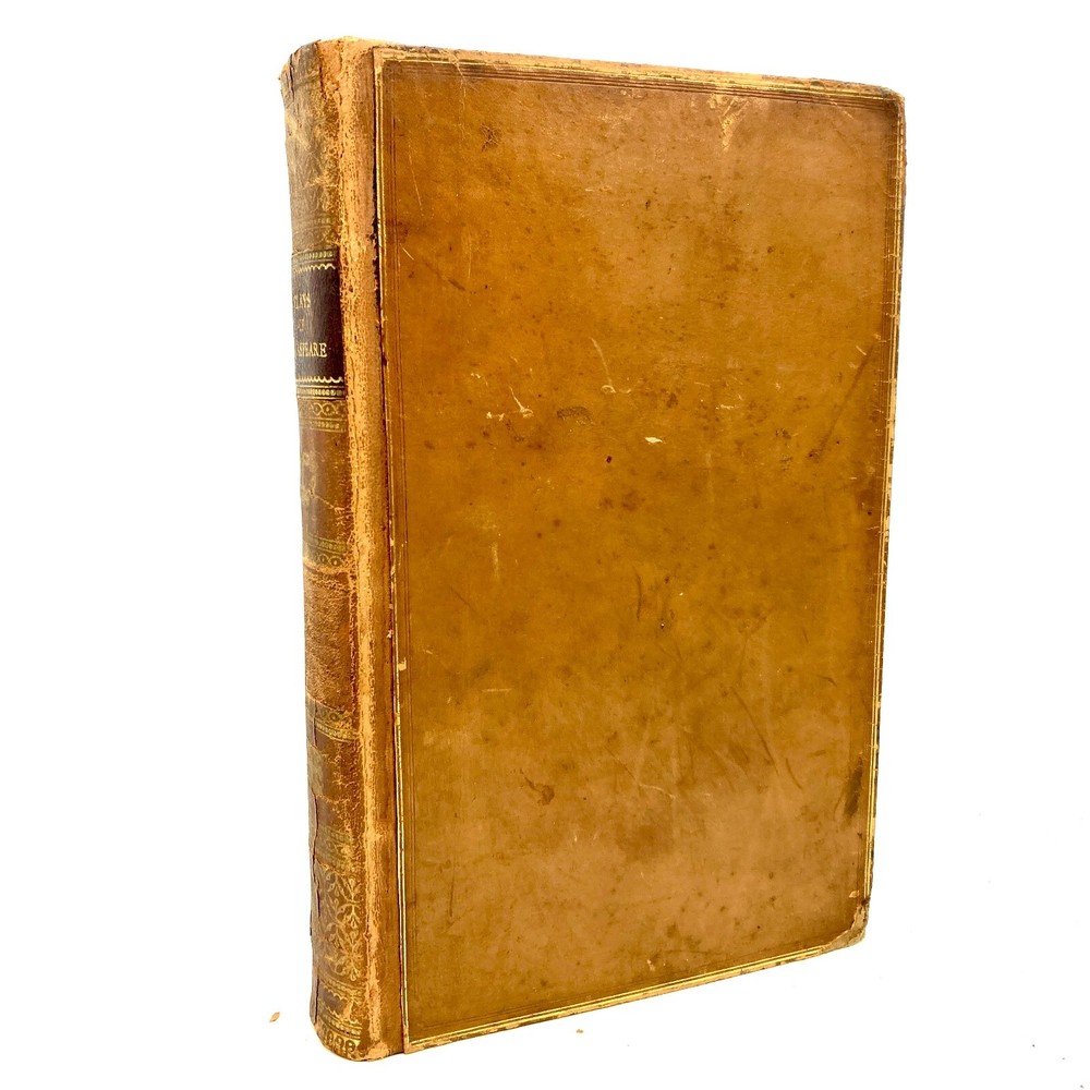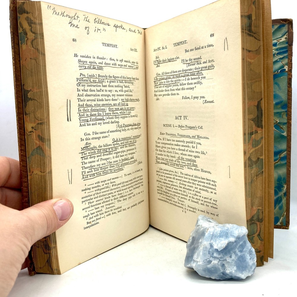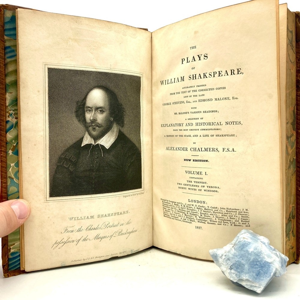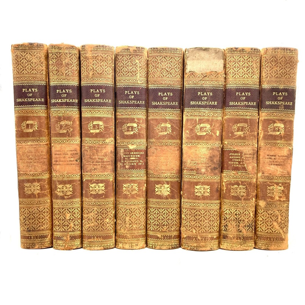 "The Plays of William Shakespeare" [Longman & Co, 1837]. Complete in 8 volumes. Polished calf with marbled edges and endpapers. Pencil annotations throughout. Aging of leather on all volumes. Volume 6 with an inch of loss at the head of spine, as pictured. Hinges intact on all volumes - which is a bit of a miracle at this age. Overall, Good+ and with great shelf appeal.