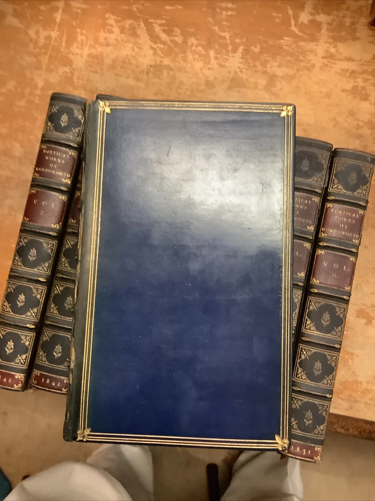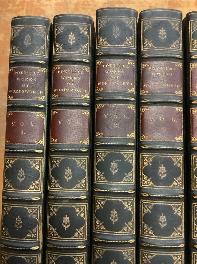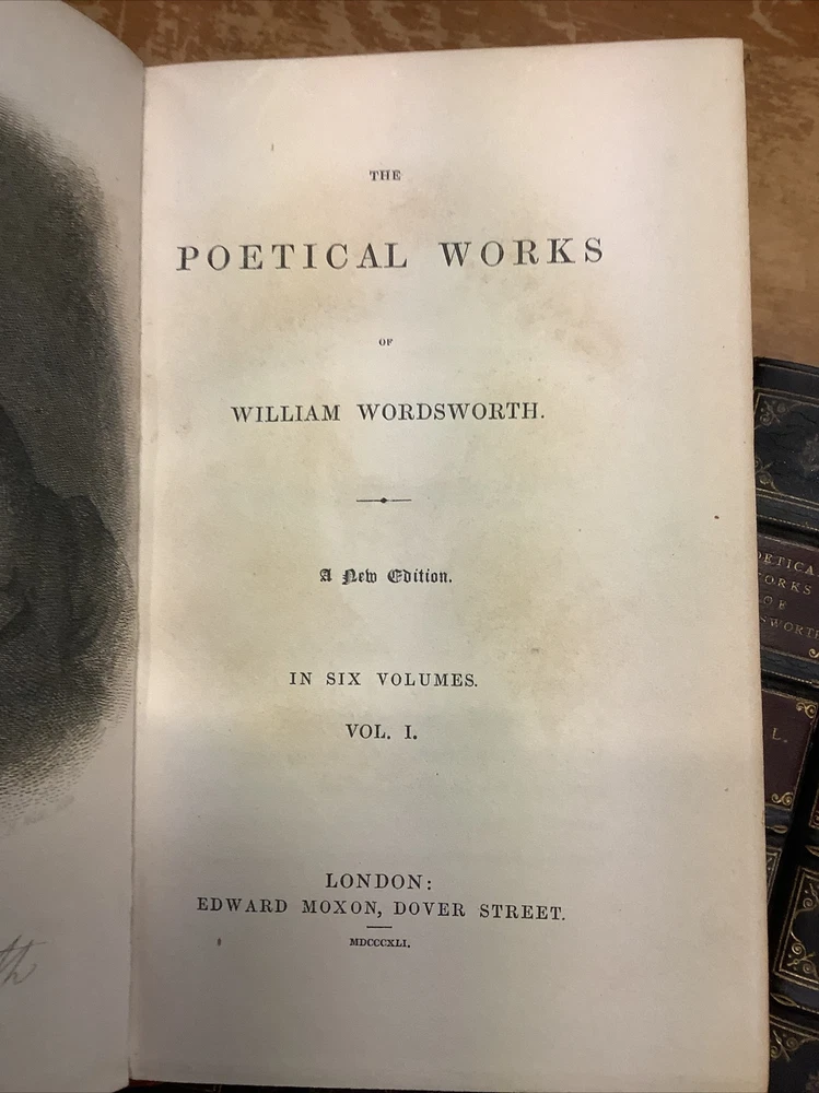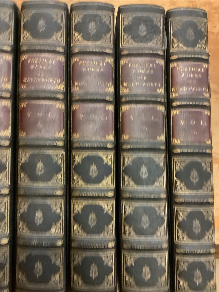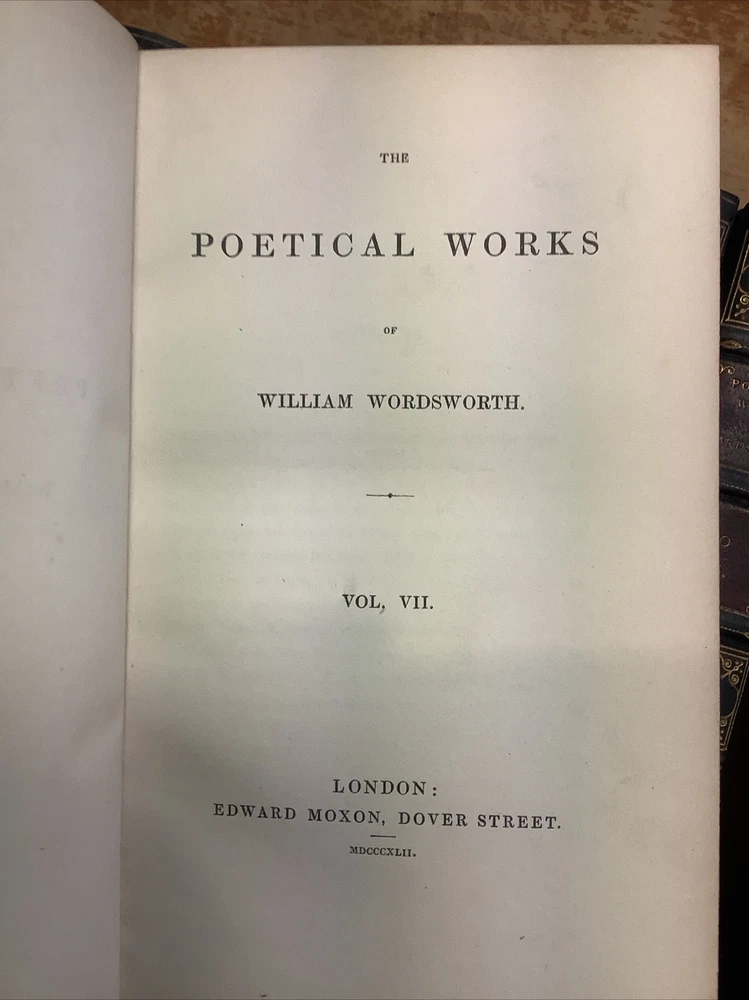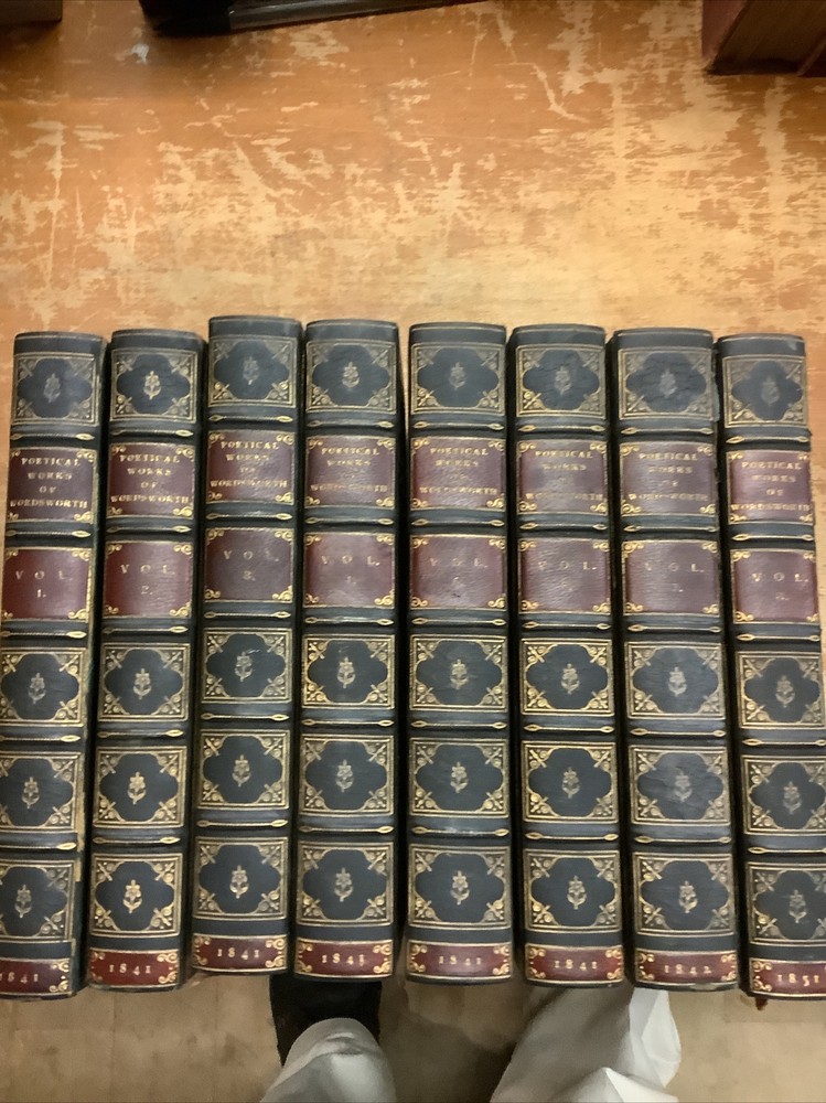 Eight volume full leather set of William Wordsworth. First six volumes are The Poetical Works of William Wordswoth published by Edward Moxon in London 1841. A New Edition stated on the title page. The seventh volume is the set has the same title but was published in 1842. The eighth volume also is called the Poetical Wroks of William Wordsworth by was published in 1851. All by same publisher. Uniformly bound in full leather. Binder's stamp from Lauriat's in Boston on edge of early page in all volumes. 1929 gift inscription in pen on early blank page in every single volume. Highly attractive set. Books measure 6 and 3/4 inches tall and just under 4 and 1/2 inches wide.