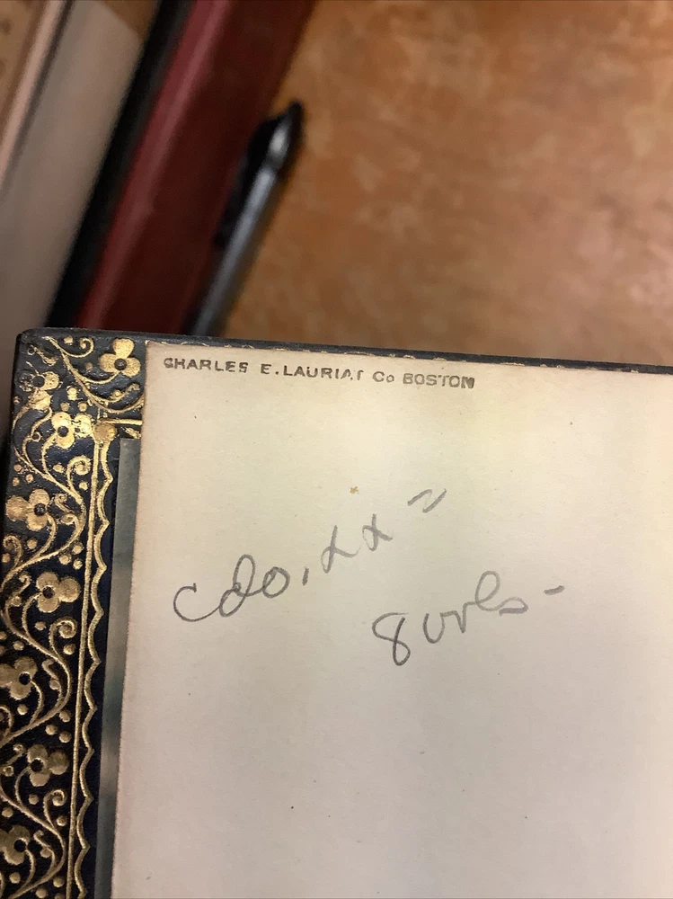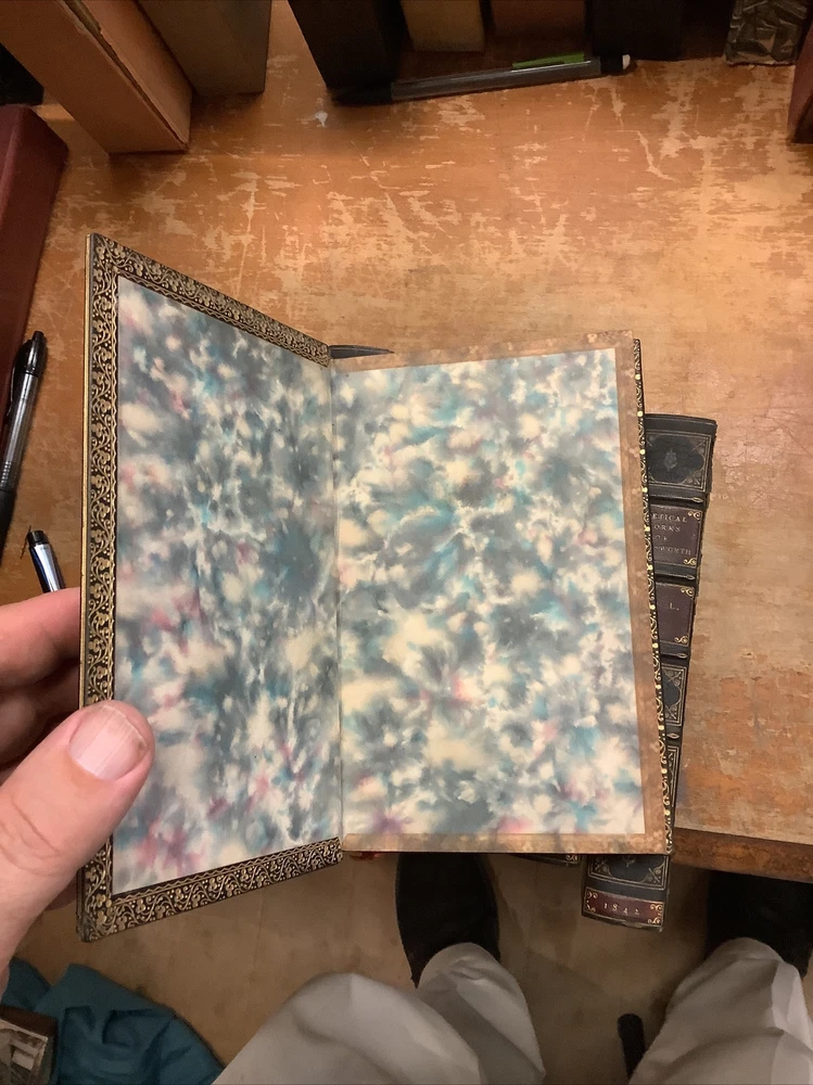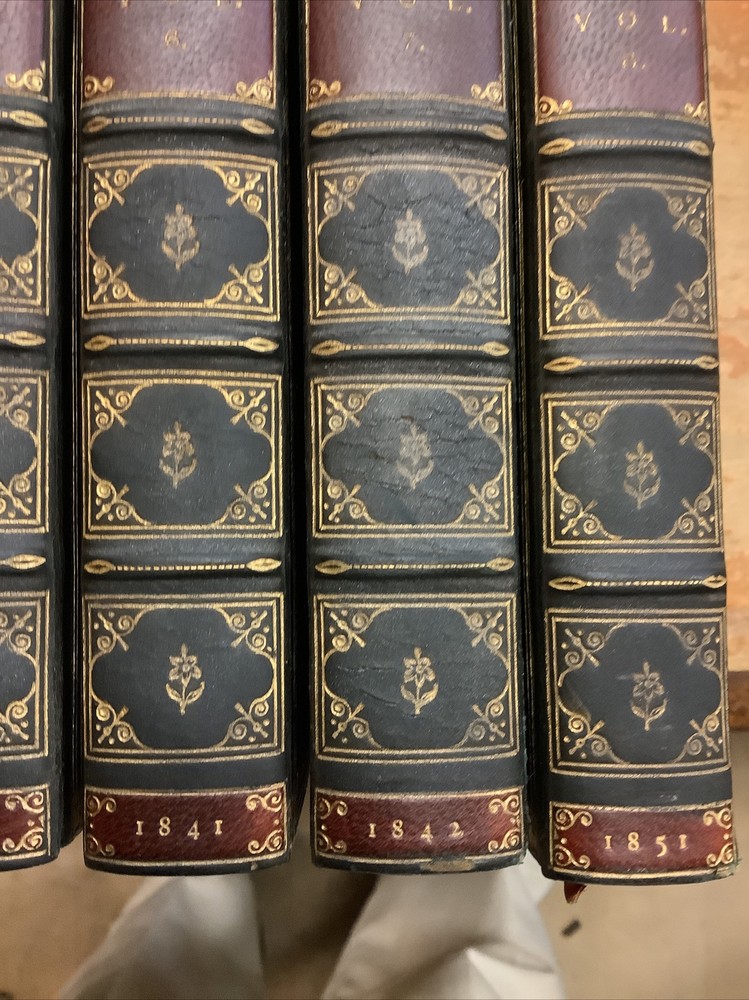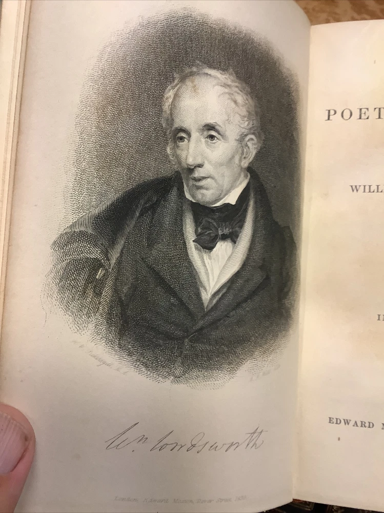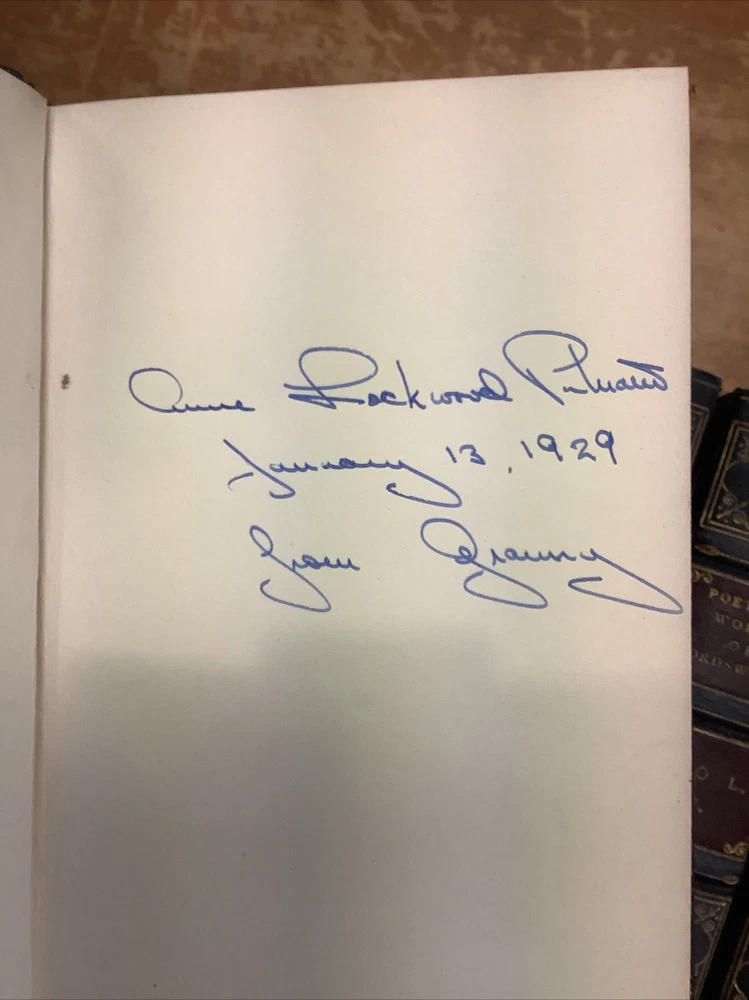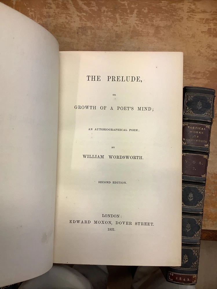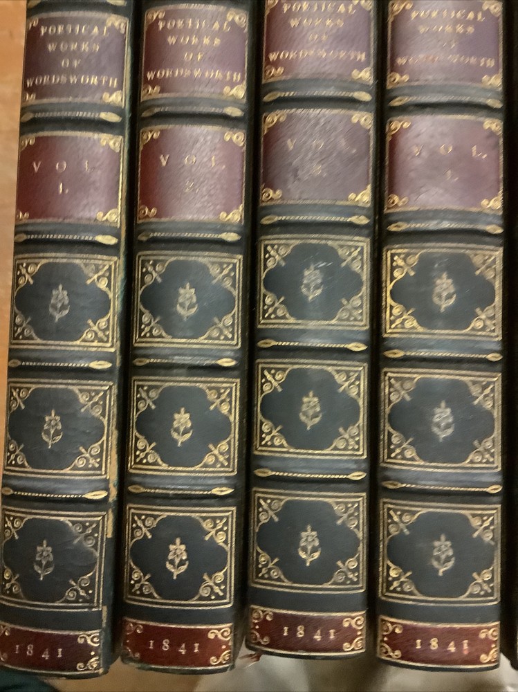 Eight volume full leather set of William Wordsworth. First six volumes are The Poetical Works of William Wordswoth published by Edward Moxon in London 1841. A New Edition stated on the title page. The seventh volume is the set has the same title but was published in 1842. The eighth volume also is called the Poetical Wroks of William Wordsworth by was published in 1851. All by same publisher. Uniformly bound in full leather. Binder's stamp from Lauriat's in Boston on edge of early page in all volumes. 1929 gift inscription in pen on early blank page in every single volume. Highly attractive set. Books measure 6 and 3/4 inches tall and just under 4 and 1/2 inches wide.
