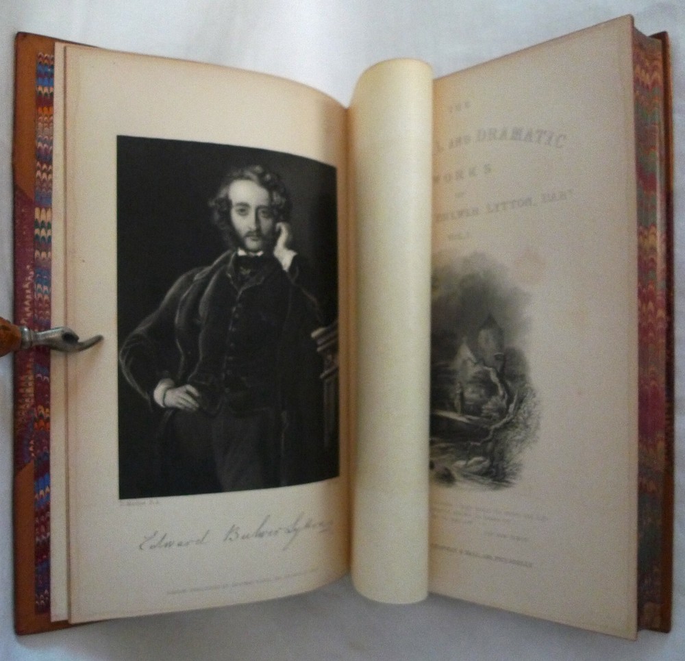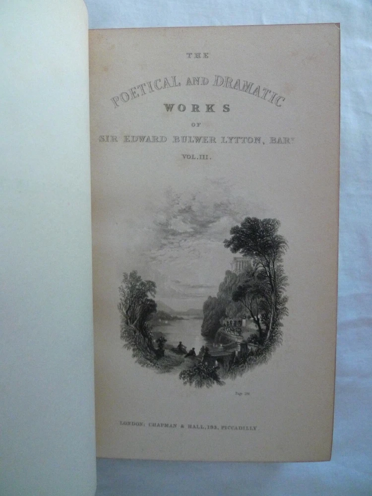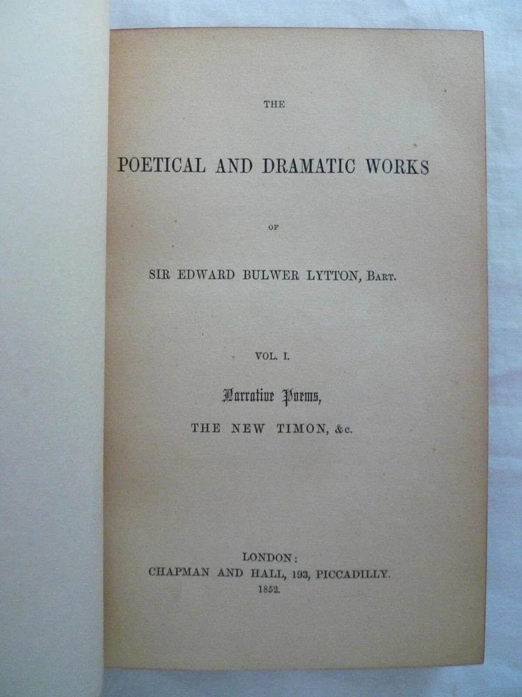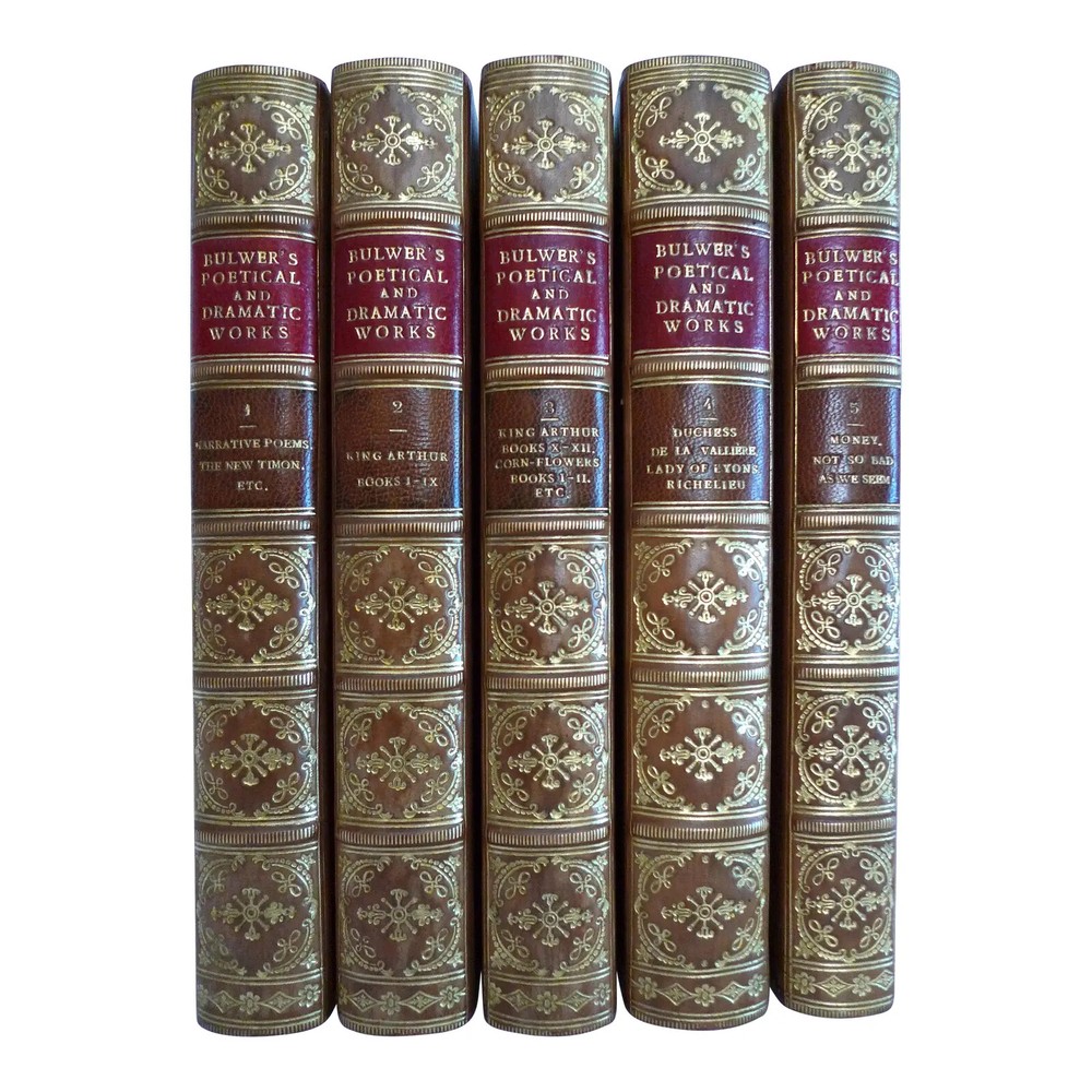 Title: The Poetical and Dramatic Works. Author: Sir Edward Bulwer Lytton, Bart. Publisher: Chapman and Hall. Place: London. Publication date: 1852-1854. Description: 1694 Pp. [V1; Narrative Poems. - The New Timon, &c., 344 p., V2; King Arthur. -- Books I. to IX., 336 p., V3; King Arthur. -- Books X. to XII. - Corn Flowers. -- Books I. and II. - Earlier Poems., 325 p., V4; The Duchess de la Valliere. - The Lady of Lyons: or Love and Pride. - Richelieu: or, the Conspiracy., 392 p., V5; Money. - Not So Bad as We Seem: Or, Many Sides to a Character., 297 p.]. 12mo. Complete 5 volume set. Period 19th century 3/4 tan morocco hardcovers, marble boards/leaf edges/endpapers, gilt/tooled spine covers with 5 raised bands, red and brown title labels, engraved illustrations include a frontispiece opposite a vignette illustration, separated by a fine tissue guard, each precedes the title page; e.g. Volume 1 - Frontispiece portrait of Lytton with facsimile signature. Measures: 1 (5.25 overall) W x 5 D x 7.25 H inches. Brief Biography: Edward Bulwer-Lytton, 1st Baron Lytton was an English writer and politician. His literary works were highly popular; his novels earned him a fortune. His legacy perhaps is best known through some of the phrases he coined "the great unwashed", "pursuit of the almighty dollar", "the pen is mightier than the sword", and "dweller on the threshold". Then came a sharp decline in his reputation, so that he is known today for little more than the opening line "It was a dark and stormy night", the first seven words of his novel Paul Clifford (1830) (Wiki).