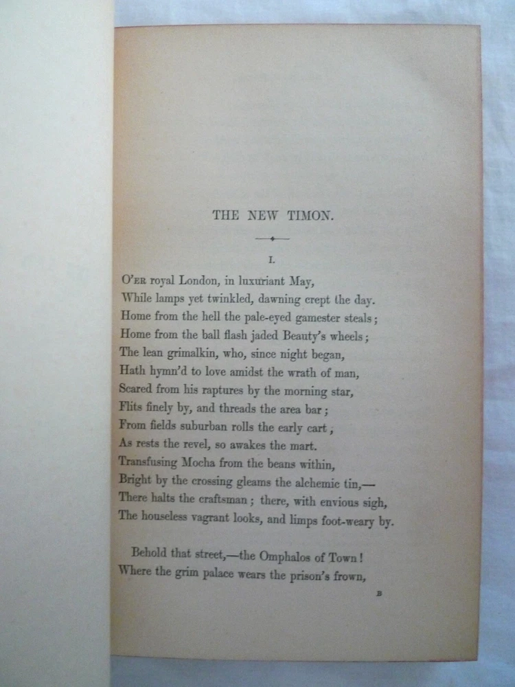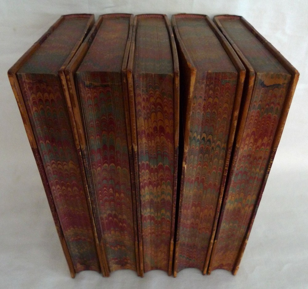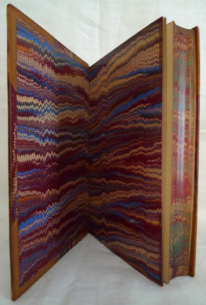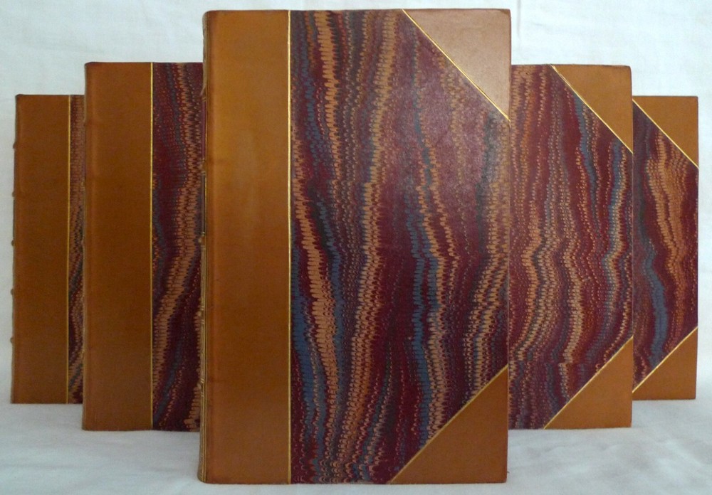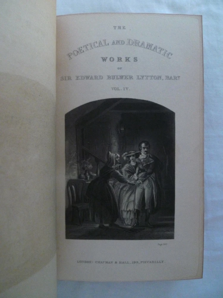Title: The Poetical and Dramatic Works. Author: Sir Edward Bulwer Lytton, Bart. Publisher: Chapman and Hall. Place: London. Publication date: 1852-1854. Description: 1694 Pp. [V1; Narrative Poems. - The New Timon, &c., 344 p., V2; King Arthur. -- Books I. to IX., 336 p., V3; King Arthur. -- Books X. to XII. - Corn Flowers. -- Books I. and II. - Earlier Poems., 325 p., V4; The Duchess de la Valliere. - The Lady of Lyons: or Love and Pride. - Richelieu: or, the Conspiracy., 392 p., V5; Money. - Not So Bad as We Seem: Or, Many Sides to a Character., 297 p.]. 12mo. Complete 5 volume set. Period 19th century 3/4 tan morocco hardcovers, marble boards/leaf edges/endpapers, gilt/tooled spine covers with 5 raised bands, red and brown title labels, engraved illustrations include a frontispiece opposite a vignette illustration, separated by a fine tissue guard, each precedes the title page; e.g. Volume 1 - Frontispiece portrait of Lytton with facsimile signature. Measures: 1 (5.25 overall) W x 5 D x 7.25 H inches. Brief Biography: Edward Bulwer-Lytton, 1st Baron Lytton was an English writer and politician. His literary works were highly popular; his novels earned him a fortune. His legacy perhaps is best known through some of the phrases he coined "the great unwashed", "pursuit of the almighty dollar", "the pen is mightier than the sword", and "dweller on the threshold". Then came a sharp decline in his reputation, so that he is known today for little more than the opening line "It was a dark and stormy night", the first seven words of his novel Paul Clifford (1830) (Wiki).