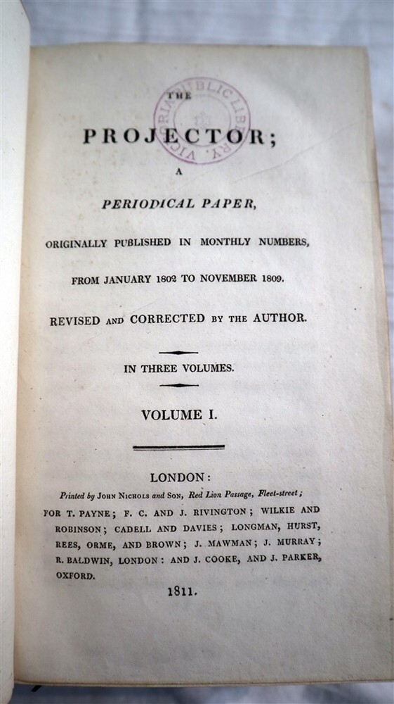 L U I S P O R R E T T A F I N E ARTS & A N T IQ U E S RARE & INTERESTING BOOKS ANTIQUES / PAINTINGS / ENGRAVINGS / CHINA & GLASS / ART RESTORATION The Projector Magazine 3 x Volume Set 1811 Full Calf Binding Rare! Chalmers, Alexander :THE PROJECTOR; A PERIODICAL PAPER ORIGINALLY PUBLISHED IN MONTHLY NUMBERS FROM JANUARY 1802 TO NOVEMBER 1809 IN THREE VOLUMES Published in 1811, 1st Edition. measures 8.5" x 5". Published in London by T. Payne Etc Bound in tan embossed full calf, boards loose, text blocks all very good, clean and tight, marbled page edges. This is a full three volume set. Many thanks for your business! To ensure that we have a problem free business transaction, please briefly review the notes below. Thank you! PLEASE READ OUR SHIPMENT AND PAYMENT TERMS BEFORE BUYING OR BIDDING We are Canadian dealers and delivery of items takes longer than if mailed in the US. For example, a heavy item sent via Expedited Mail may take up to ten WORKING days to arrive (14 days) , which given our in store clearance may take two weeks or more to arrive. Please be aware of this when you buy, or when you bid. We always SUBSIDISE our shipping costs which are CLEARLY stated in our advertisements. Canada Post is far more expensive compared to USPS, so before you buy or bid, please be sure that you are aware of shipping costs. WHEN REGISTERING FEEDBACK PLEASE BE AWARE OF THESE ISSUES - MANY THANKS! WE ACCEPT PAYPAL, PAYPAL WITH CREDIT CARDS, OR CREDIT CARDS AT OUR OWN SECURE SERVER •Shipping within North America is by Expedited Flat Rate Shipping Service •Payment should be made within three days of the end of the auction. We reserve the right to cancel any transactions not paid for within the three day limit •We amalgamate shipping for greater economy - so feel free to buy until it hurts! •We offer a full refund ONLY FOR ITEMS NOT AS DESCRIBED. Any items lost in the mail will be covered by our refund guarantee AFTER a Post Office search. The refund will not include the mailing costs. CANADIAN CLIENTS - Please note: GST & PST, or HST will be applied as appropriate to your Province. International Buyers – Please Note: Import duties, taxes and charges are not included in the item price or shipping charges. These charges are the buyer’s responsibility. Please check with your country’s customs office to determine what these additional costs will be prior to bidding/buying Track Page Views With Auctiva's Counter