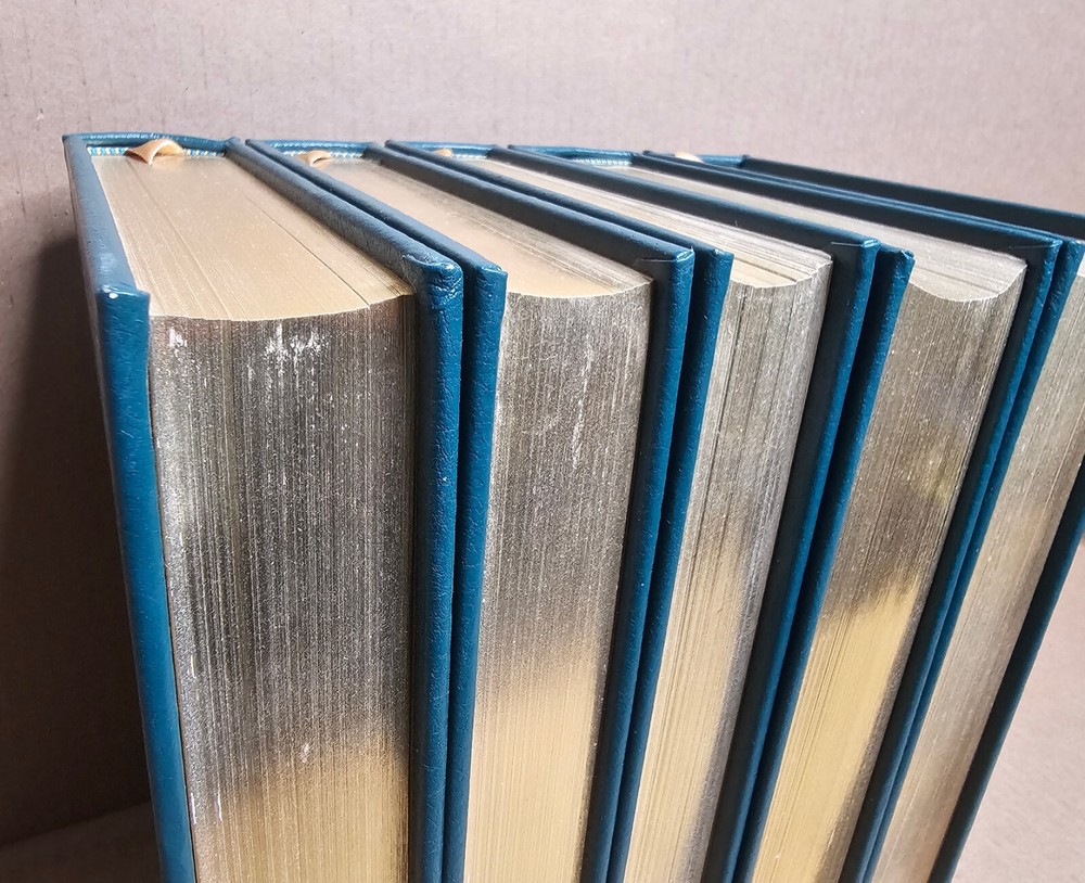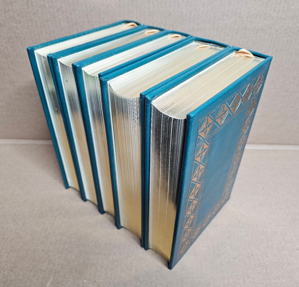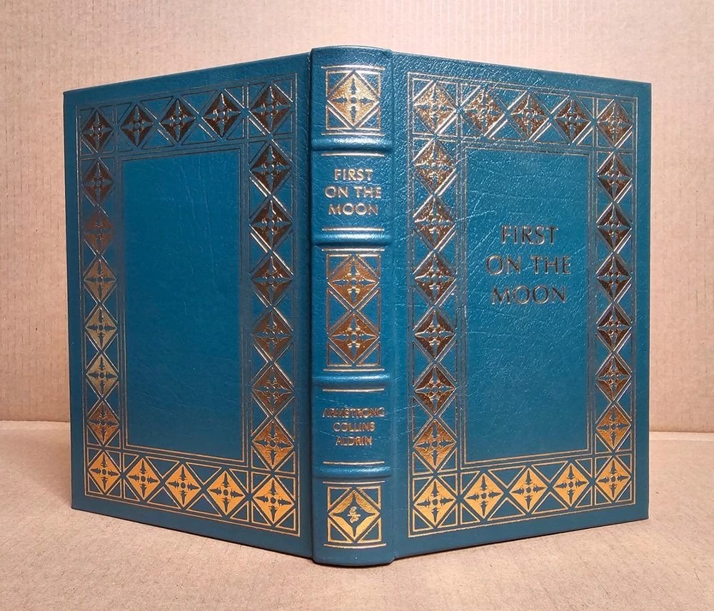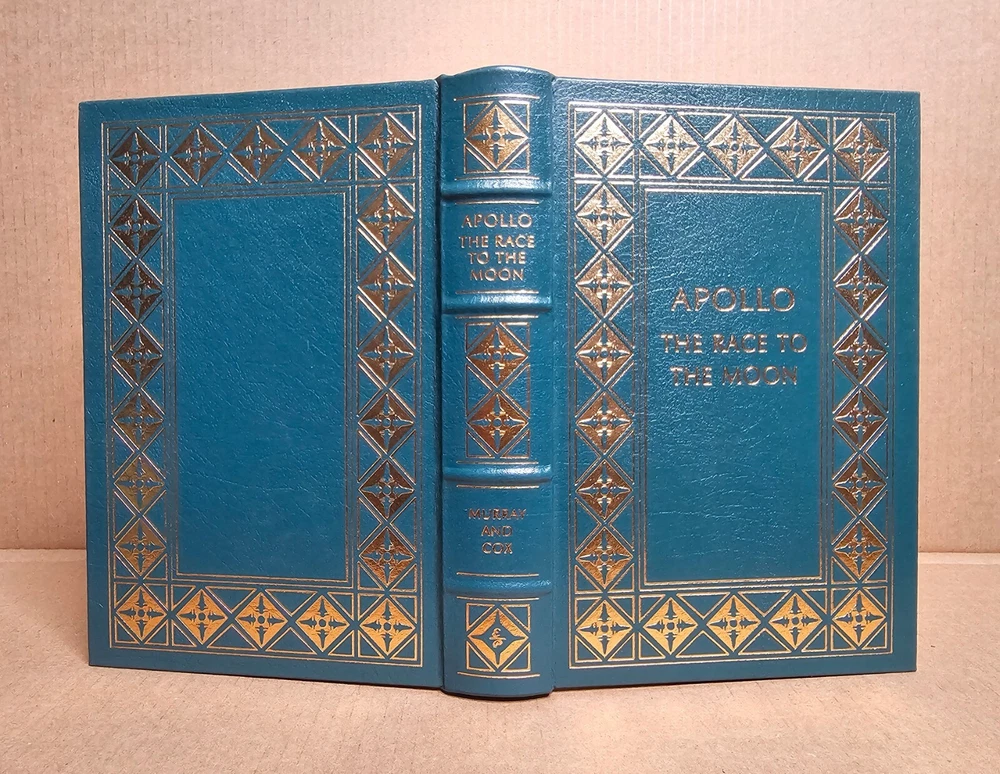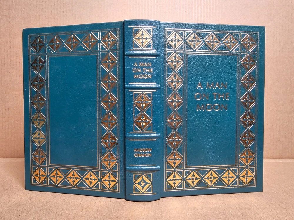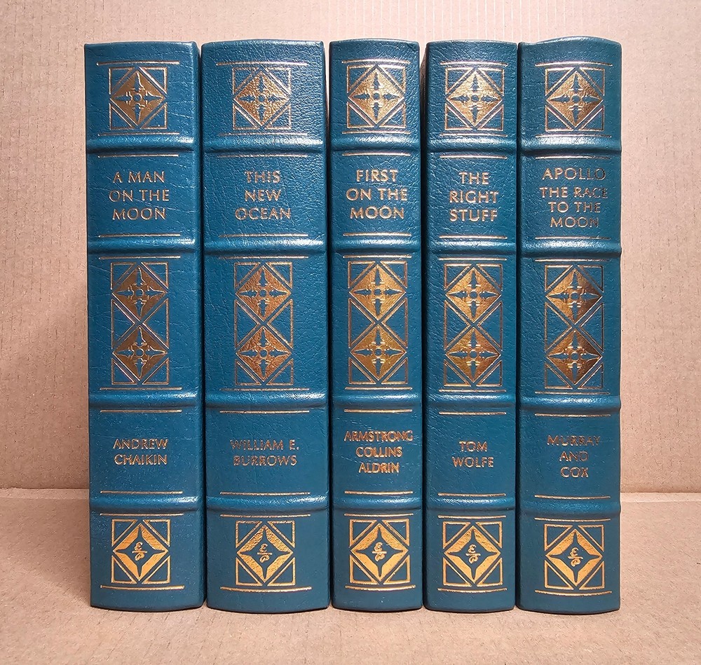 5 volume Easton Press set. Leather Bound. A Man on the Moon by Andrew Chaikin This New Ocean by William E. Burrows First on the Moon by Neil Armstrong, Michael Collins and Edwin E. Aldrin, jr. Apollo: The Race to the Moon by Charles Murray and Catherine Bly Cox The Right Stuff by Tom Wolfe Easton Press edition as pictured. Exterior leather in very good condition with minor rubbing/wear (see photos). The bindings are rock solid. Interiors are like new other than "A Man on the Moon" that has a name written behind front cover with gold colored ink (interior is otherwise crisp and clean). No book/name plates. Slight wear to gold gilding on textblocks. Still, a very nice set that will be carefully packaged and shipped within 48 hours M-F. [x]