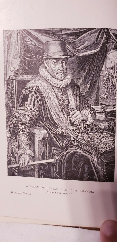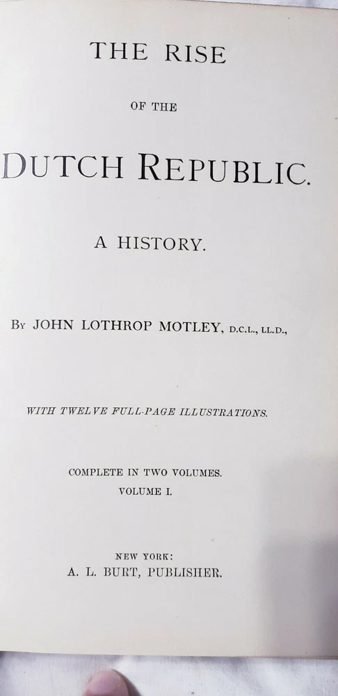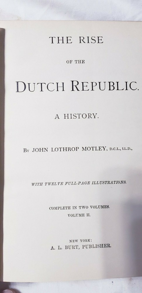 The Rise of the Dutch Republic by Motley. Vol I & Vol II Set. Calf Leather. The Rise of the Dutch Republic by Motley. Vol II & Vol III Set. 3/4 Calf Leather. The Rise of the Dutch Republic: A History by John Lothrop Motley. Philadelphia: David McKay, Publisher, c.1900. Set of 2, Volume I & Volume II Illustrated with tissue-guarded frontispieces & portrait plates. Attractively bound in 3/4 calf leather & marbled boards, spines decorated & lettered in gilt, raised spine bands, top edges gilt, marbled endpapers. Approx. 7-1/2" x 5-1/4." A bit of light rubbing, some minor wear and a small tear at the top of Vol II. The spine on Volume 1 becoming loose. No printed date.