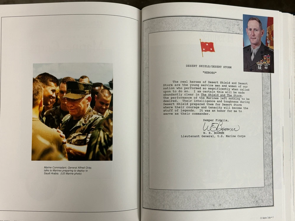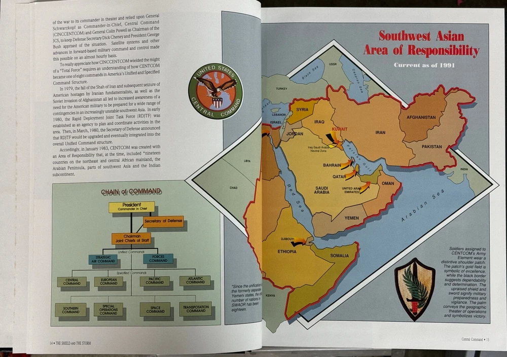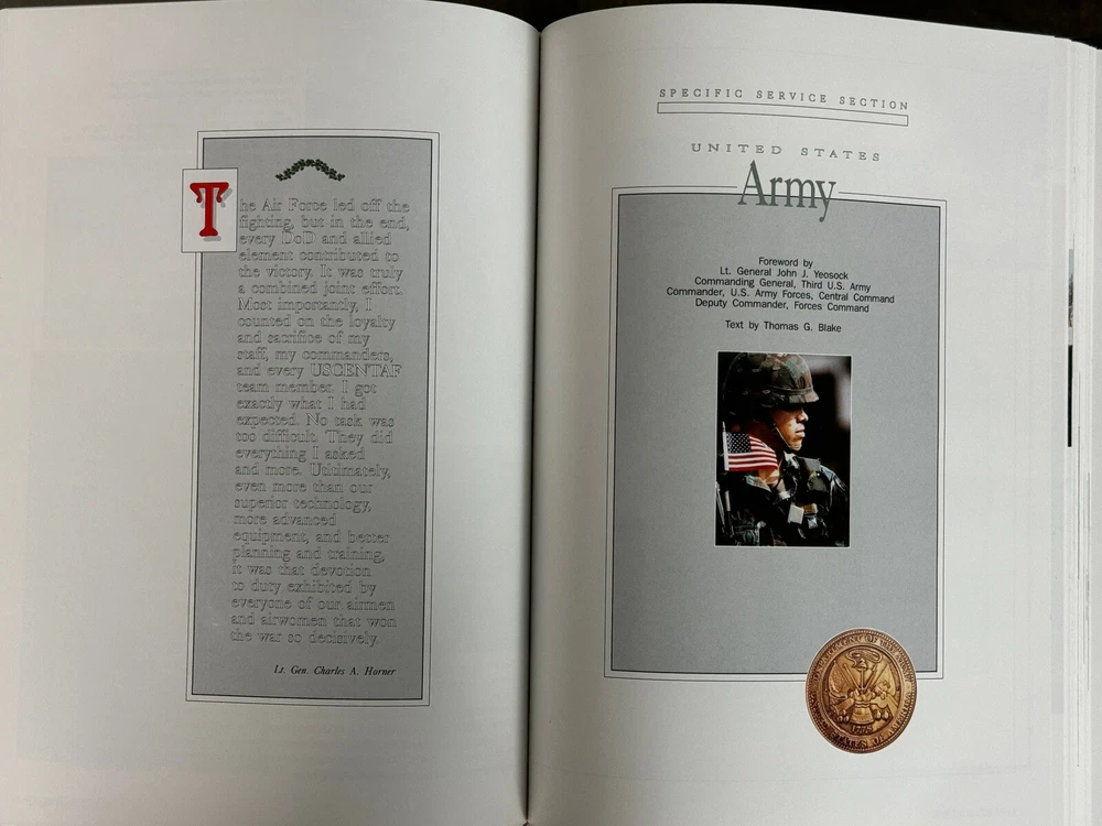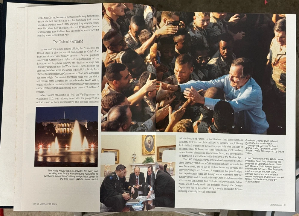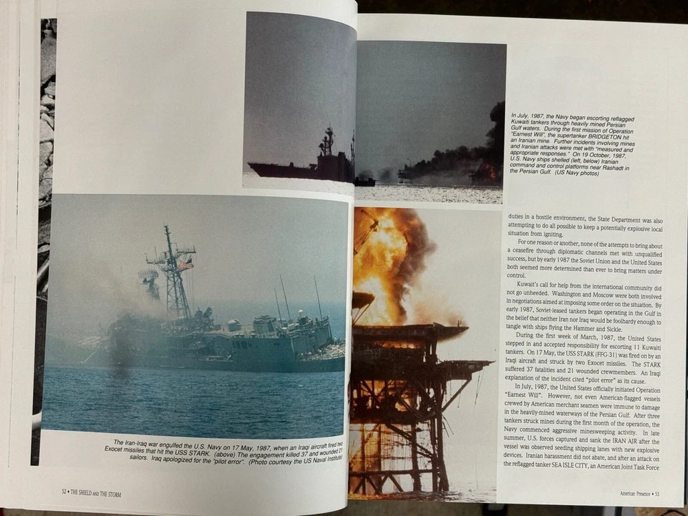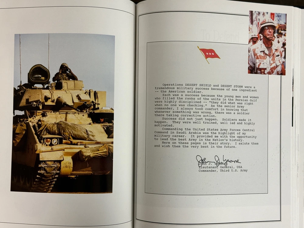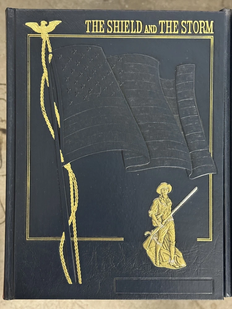 This is a big heavy book weighing 5 pounds! This Master Edition was created for all of the service branches. I was personally involved in the production and publication of this amazing book back in 1990. See photo of President George H. W. Bush with me signing my personal copy of the book in 1991. I still have several unopened boxes from Jostens, whom we used to print this beautiful leather bound coffee table book. The leather cover proudly displays the American flag with gorgeous hand tooling is truly an awesome tribute to our BELOVED veterans ! We currently have Minutemen guard cover logos. The Shield and The Storm is a must have book for any active or retired vet which both illustrates and describes the entire the Gulf war with full after action reporting and amazing vivid combat photography, all from official DOD combat photographers in theatre. This is a complete written history with more than 500 color combat photos. These books were stored for the past 30+ years in my bunkhouse so, some books may show some cosmetic wear. Returns and exchanges are accepted if you are not 100% completely satisfied with your purchase. We THANK YOU for YOUR service. God Bless America. The hardback military book titled "The Shield & The Storm" covers the operation Desert Storm that took place in 1990-1991. It is a valuable addition to any collection of military items, especially for those interested in this conflict specifically but is still highly relevant to current events in the SWAAO. The book is all original and provides in-depth high level analysis of all military operations during the Desert Shield and Desert Storm. It is a must-have for historians, collectors, and enthusiasts alike. The shield & the storm hardback military book is a rare find and a great addition to any collection.