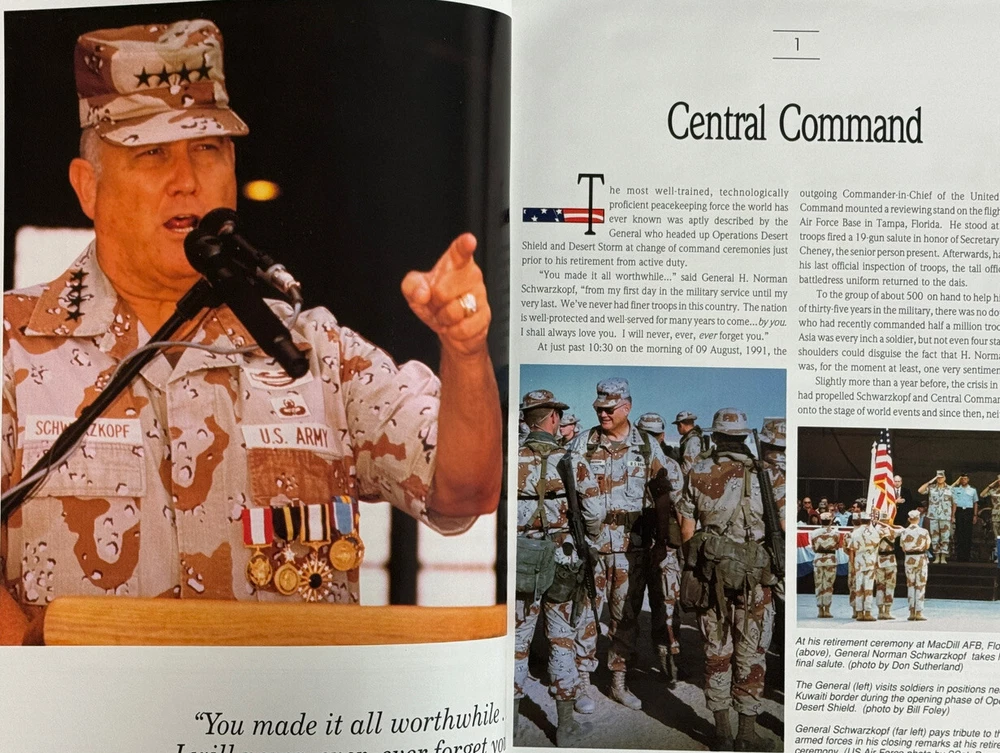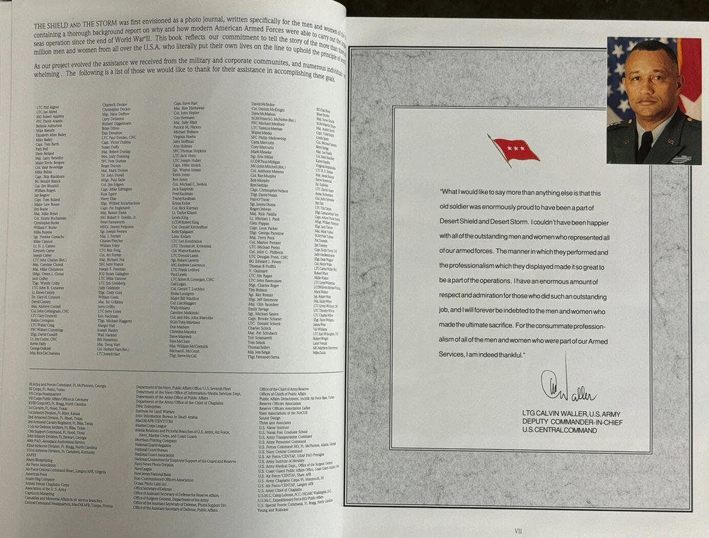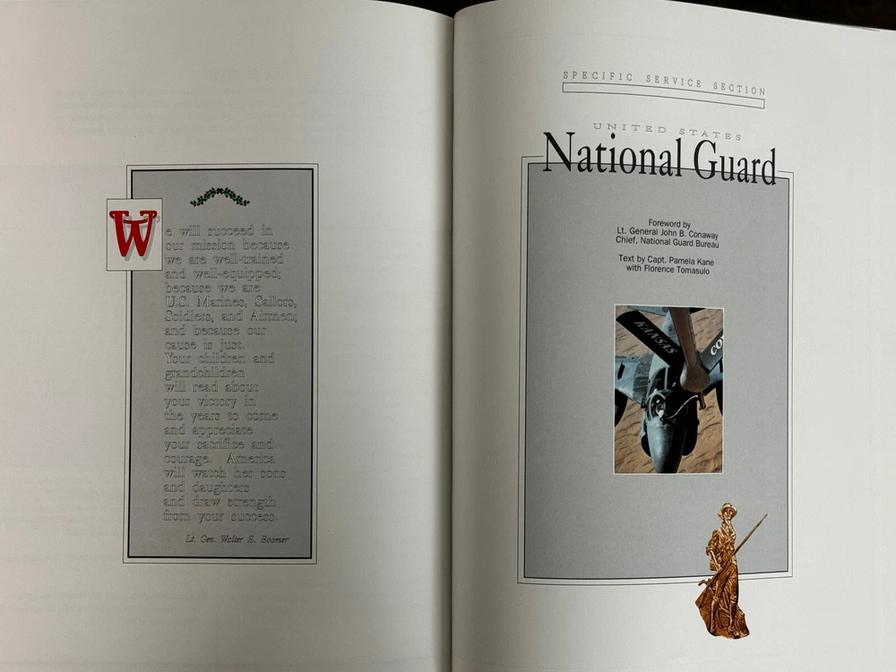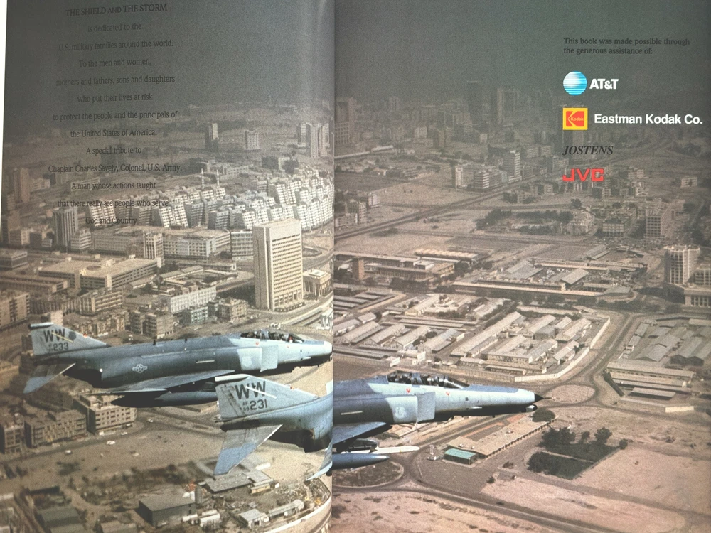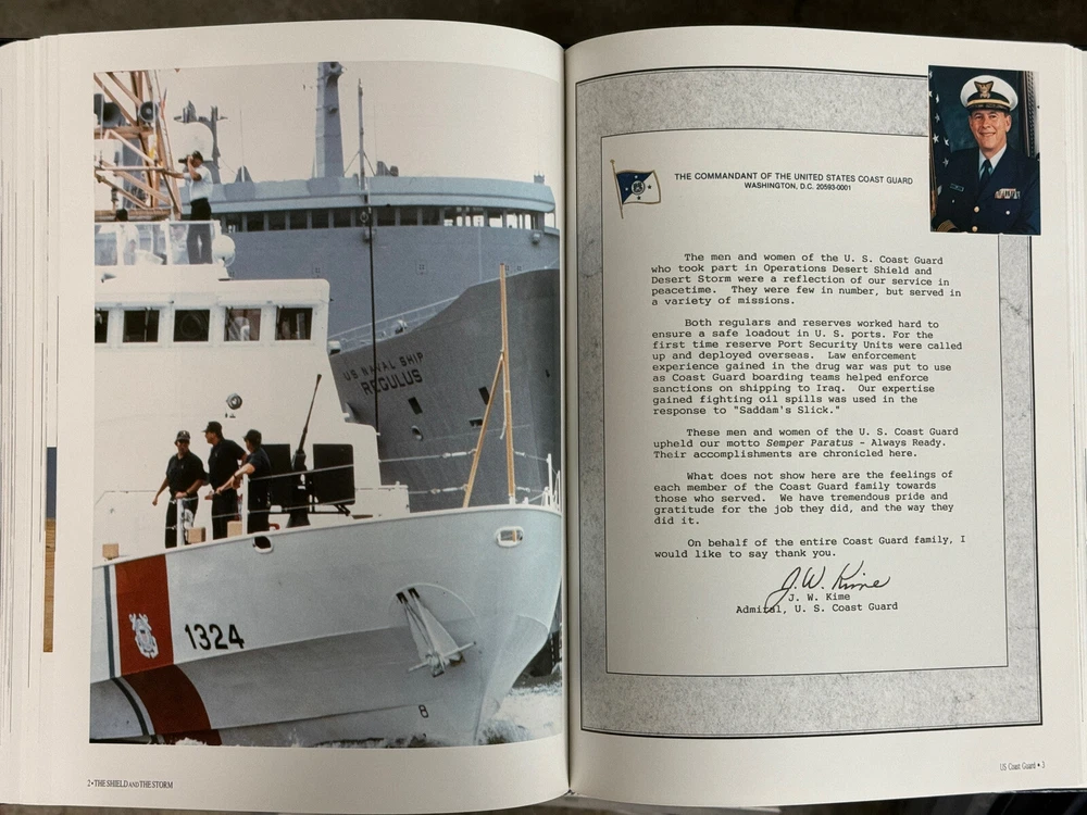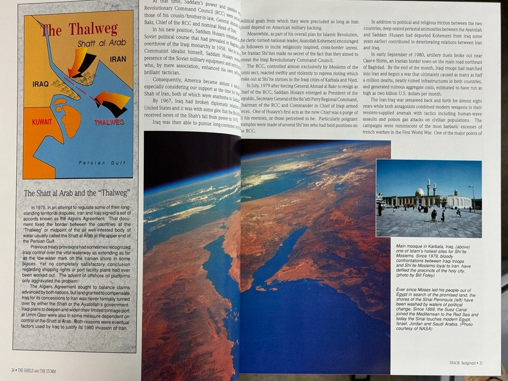 This is a big heavy book weighing 5 pounds! This Master Edition was created for all of the service branches. I was personally involved in the production and publication of this amazing book back in 1990. See photo of President George H. W. Bush with me signing my personal copy of the book in 1991. I still have several unopened boxes from Jostens, whom we used to print this beautiful leather bound coffee table book. The leather cover proudly displays the American flag with gorgeous hand tooling is truly an awesome tribute to our BELOVED veterans ! We currently have Minutemen guard cover logos. The Shield and The Storm is a must have book for any active or retired vet which both illustrates and describes the entire the Gulf war with full after action reporting and amazing vivid combat photography, all from official DOD combat photographers in theatre. This is a complete written history with more than 500 color combat photos. These books were stored for the past 30+ years in my bunkhouse so, some books may show some cosmetic wear. Returns and exchanges are accepted if you are not 100% completely satisfied with your purchase. We THANK YOU for YOUR service. God Bless America. The hardback military book titled "The Shield & The Storm" covers the operation Desert Storm that took place in 1990-1991. It is a valuable addition to any collection of military items, especially for those interested in this conflict specifically but is still highly relevant to current events in the SWAAO. The book is all original and provides in-depth high level analysis of all military operations during the Desert Shield and Desert Storm. It is a must-have for historians, collectors, and enthusiasts alike. The shield & the storm hardback military book is a rare find and a great addition to any collection.