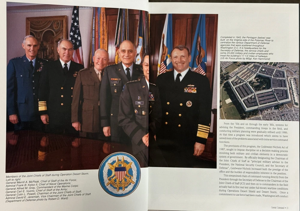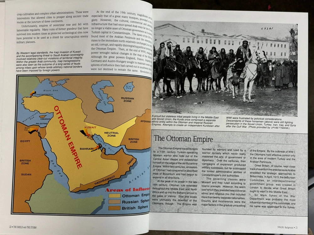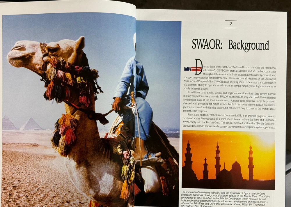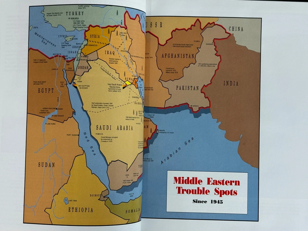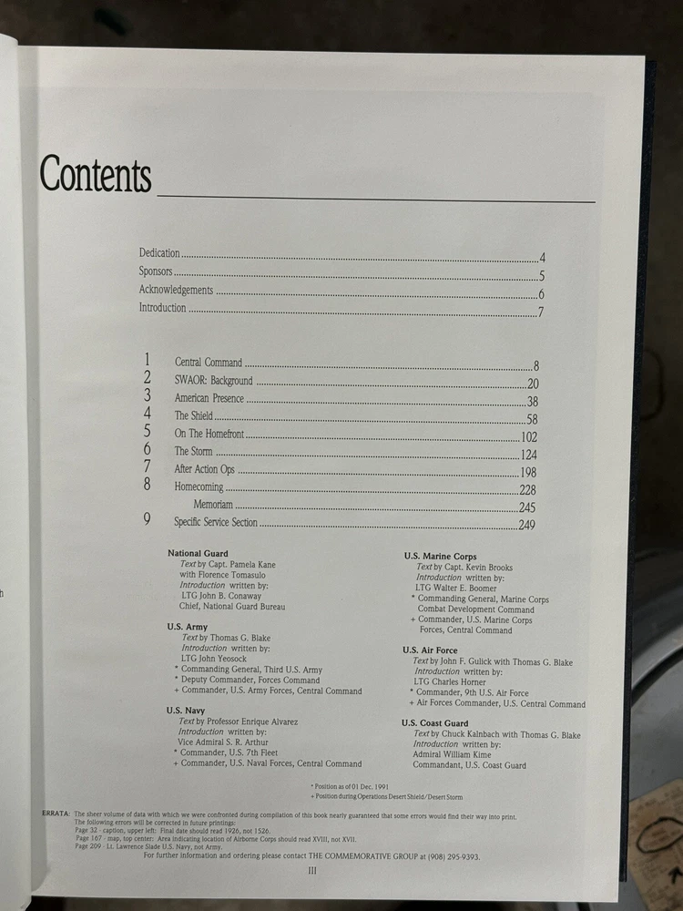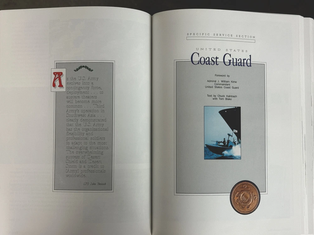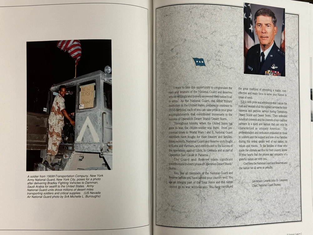 This is a big heavy book weighing 5 pounds! This Master Edition was created for all of the service branches. I was personally involved in the production and publication of this amazing book back in 1990. See photo of President George H. W. Bush with me signing my personal copy of the book in 1991. I still have several unopened boxes from Jostens, whom we used to print this beautiful leather bound coffee table book. The leather cover proudly displays the American flag with gorgeous hand tooling is truly an awesome tribute to our BELOVED veterans ! We currently have Minutemen guard cover logos. The Shield and The Storm is a must have book for any active or retired vet which both illustrates and describes the entire the Gulf war with full after action reporting and amazing vivid combat photography, all from official DOD combat photographers in theatre. This is a complete written history with more than 500 color combat photos. These books were stored for the past 30+ years in my bunkhouse so, some books may show some cosmetic wear. Returns and exchanges are accepted if you are not 100% completely satisfied with your purchase. We THANK YOU for YOUR service. God Bless America. The hardback military book titled "The Shield & The Storm" covers the operation Desert Storm that took place in 1990-1991. It is a valuable addition to any collection of military items, especially for those interested in this conflict specifically but is still highly relevant to current events in the SWAAO. The book is all original and provides in-depth high level analysis of all military operations during the Desert Shield and Desert Storm. It is a must-have for historians, collectors, and enthusiasts alike. The shield & the storm hardback military book is a rare find and a great addition to any collection.
