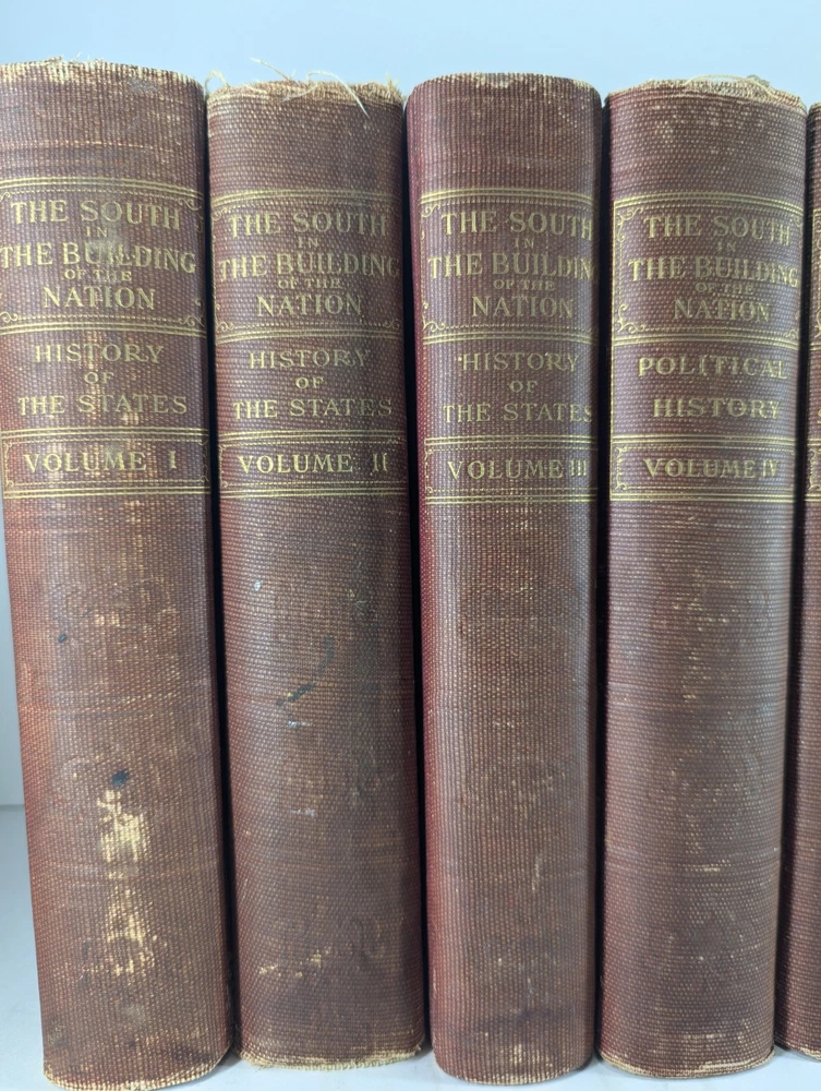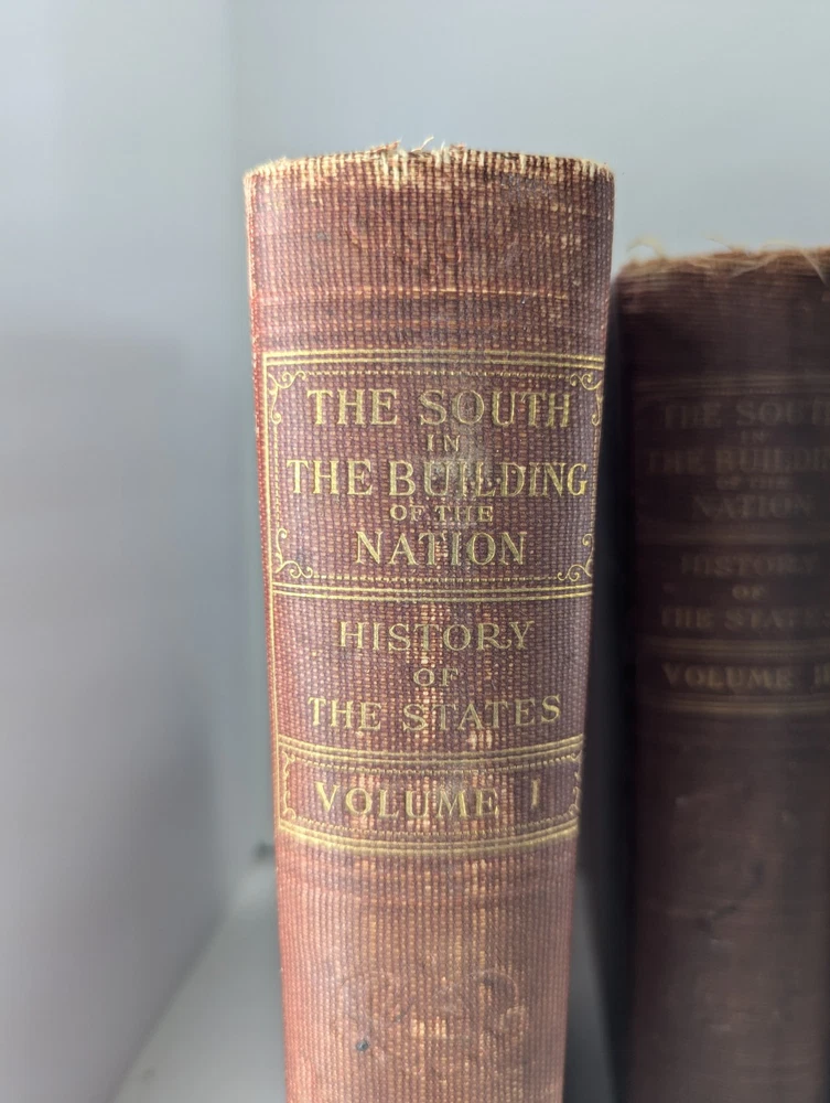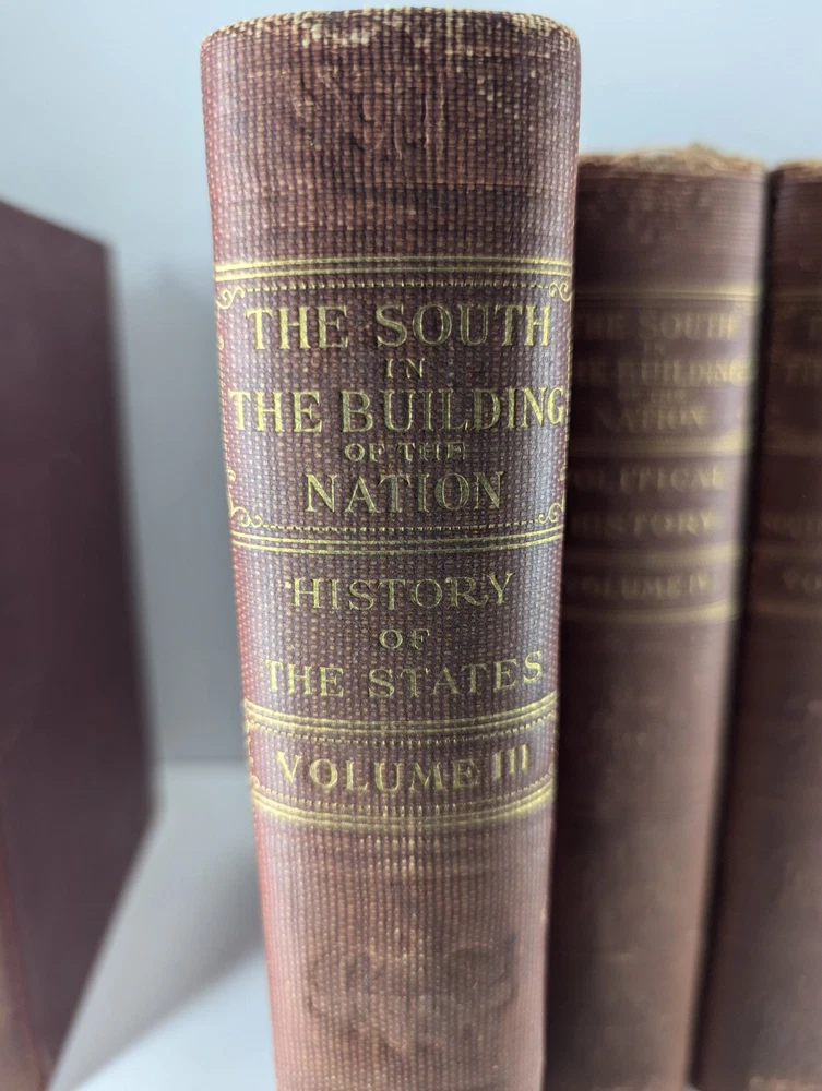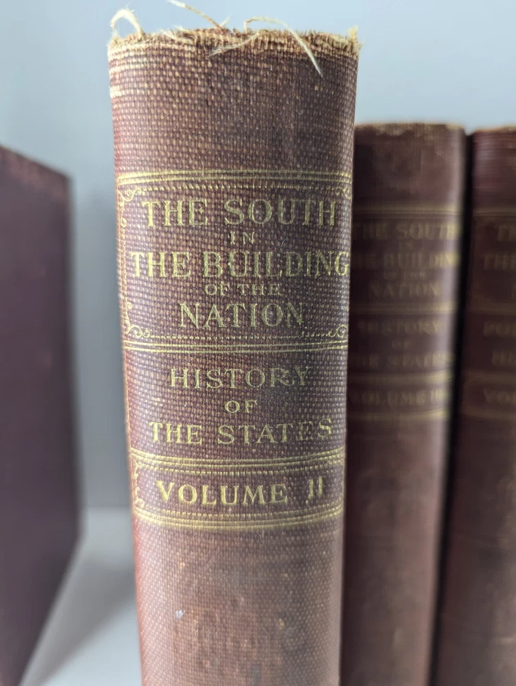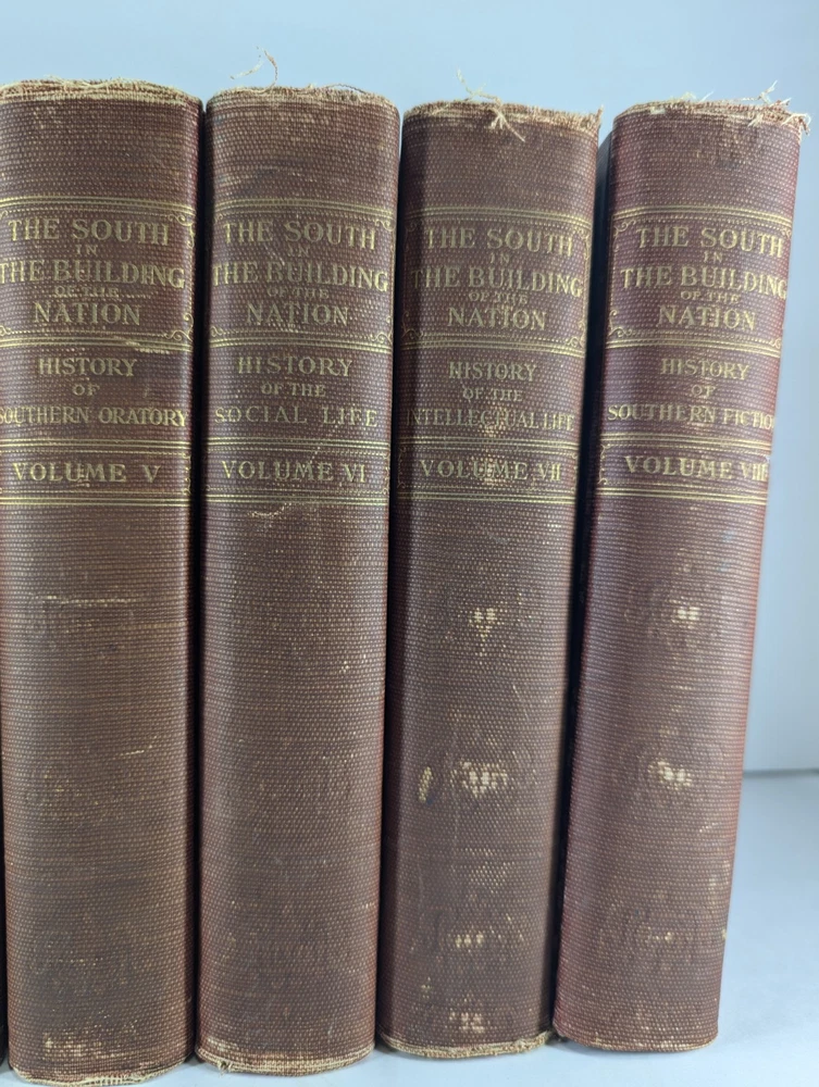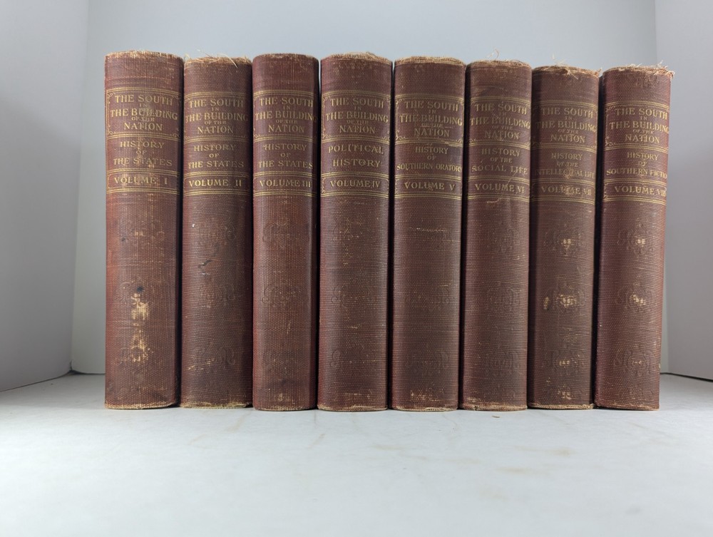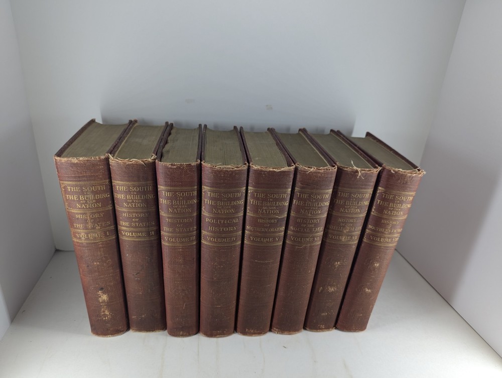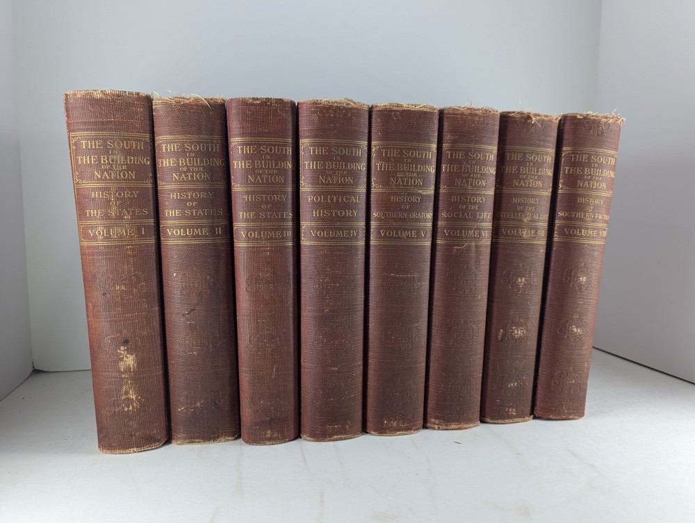 This antique 8-volume set of history books, titled "The South in the Building of the Nation," was published in 1909 by the Southern Historical Publication Society in Richmond. The books are cloth-bound with gilt decorations, making them a special addition to any collector's library. The set covers various subjects related to the American South, offering a comprehensive look at the region's history and contributions to the nation. The volumes are illustrated and written by various authors, providing a valuable resource for those interested in the history of the American South. This is a eight volume set. Please see photos of what you see is what you will receive. This is an antique so it will show signs of where from shelf life and use. (BX004)
