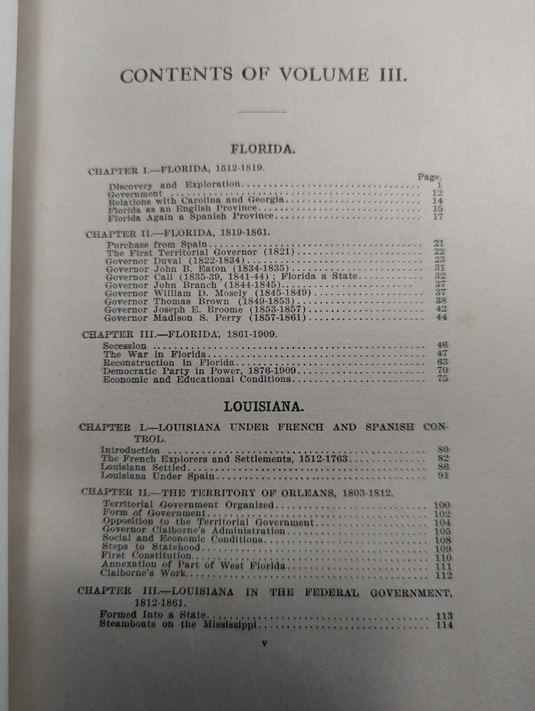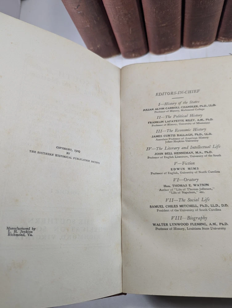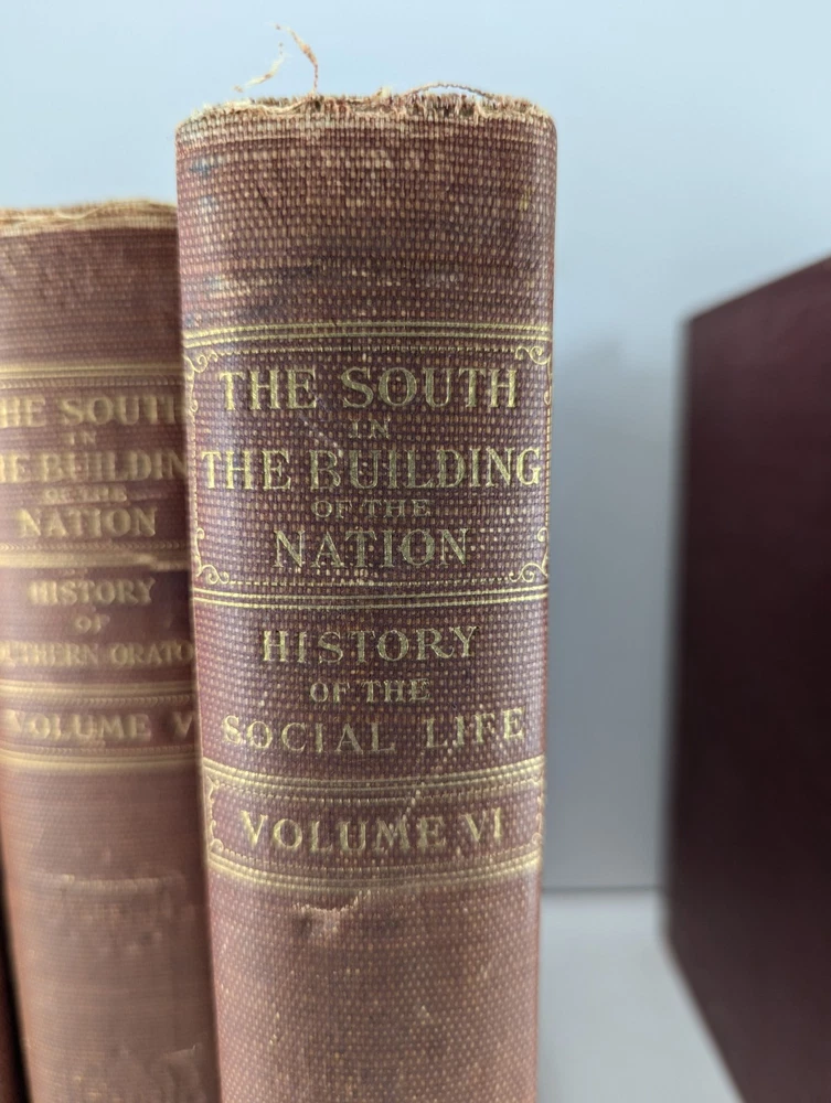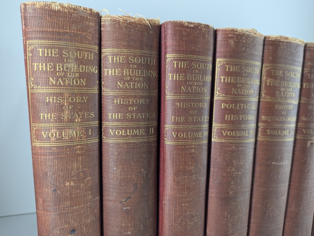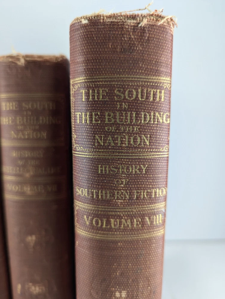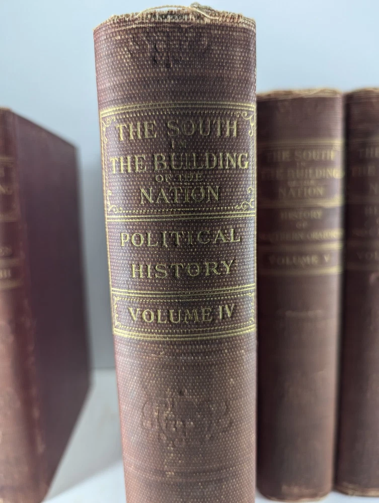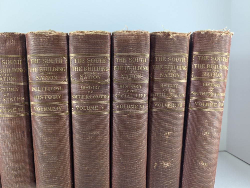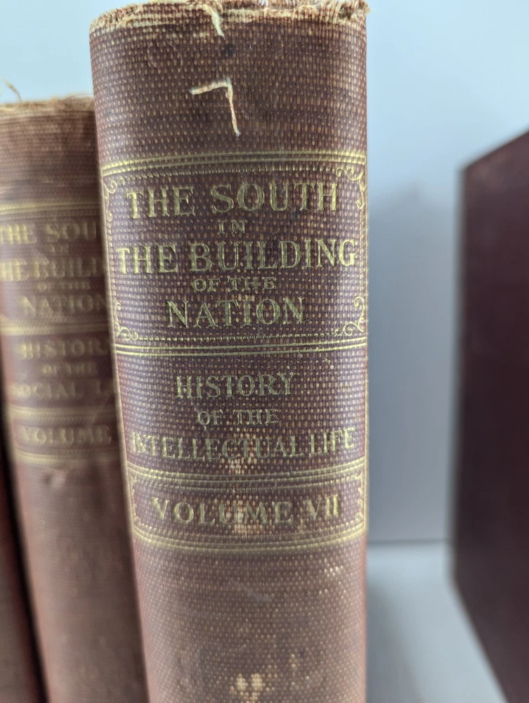 This antique 8-volume set of history books, titled "The South in the Building of the Nation," was published in 1909 by the Southern Historical Publication Society in Richmond. The books are cloth-bound with gilt decorations, making them a special addition to any collector's library. The set covers various subjects related to the American South, offering a comprehensive look at the region's history and contributions to the nation. The volumes are illustrated and written by various authors, providing a valuable resource for those interested in the history of the American South. This is a eight volume set. Please see photos of what you see is what you will receive. This is an antique so it will show signs of where from shelf life and use. (BX004)