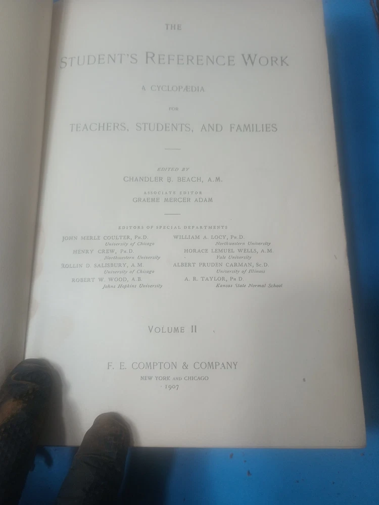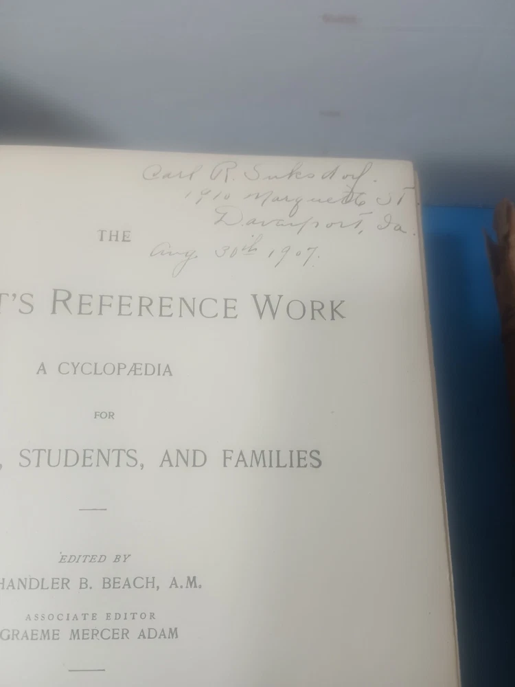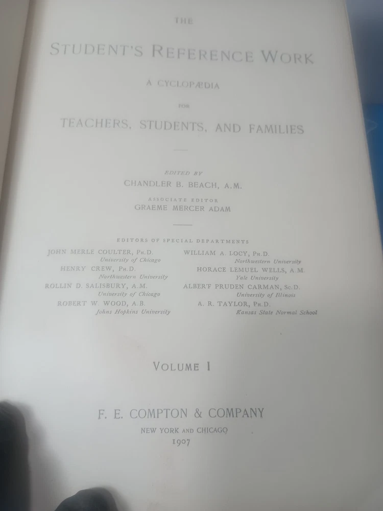 All items cleaned and sanitized as best as possible before shipping! Rare vintage set in somewhat fair condition that is still usable. The pages appear clean. Vol 1 is the one with the loose binding as shown in the images. The price is fair. Will ship in box. All sales are satisfaction guaranteed unless noted All returns must be within 30 days All books & media ship USPS media Expedited shipping is available when noted. Your satisfaction is our goal, feel free to contact us before leaving feedback if any issues We ship daily Mon thru Fri UPS & Fedex on some items only depending on cost. Because of the rising costs of shipping I always use the most reasonable 4-1-25 This complete set of "The Students Reference Work A Cyclopaedia" by Chandler B. Beach, A.M. published by F. E. Compton & Company in 1907 is a valuable addition to any reference collection. The set consists of three volumes, and each volume is bound in leather with a place of publication of Chicago, Illinois. The language used in the set is English, and it has special attributes of being illustrated. The original set is in excellent condition and is an original copy. The set is categorized under Books & Magazines and Antiquarian & Collectible. The set is a perfect reference for students and anyone in need of quick information