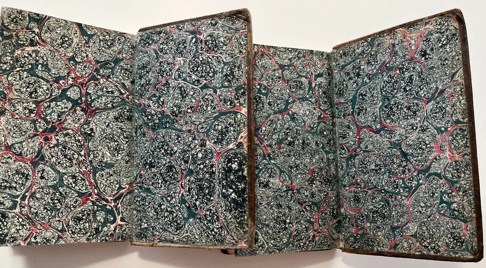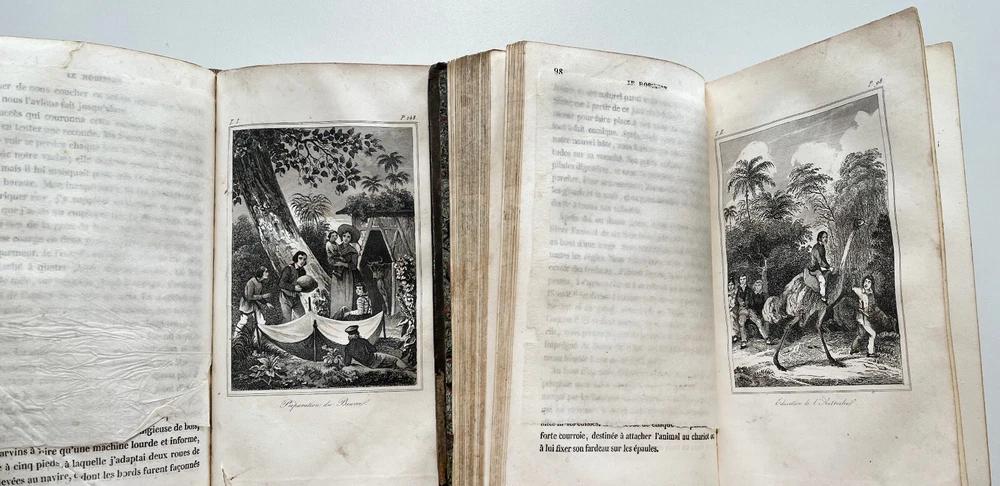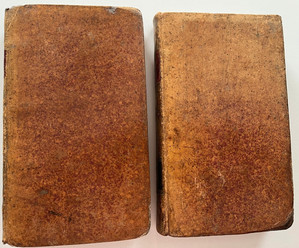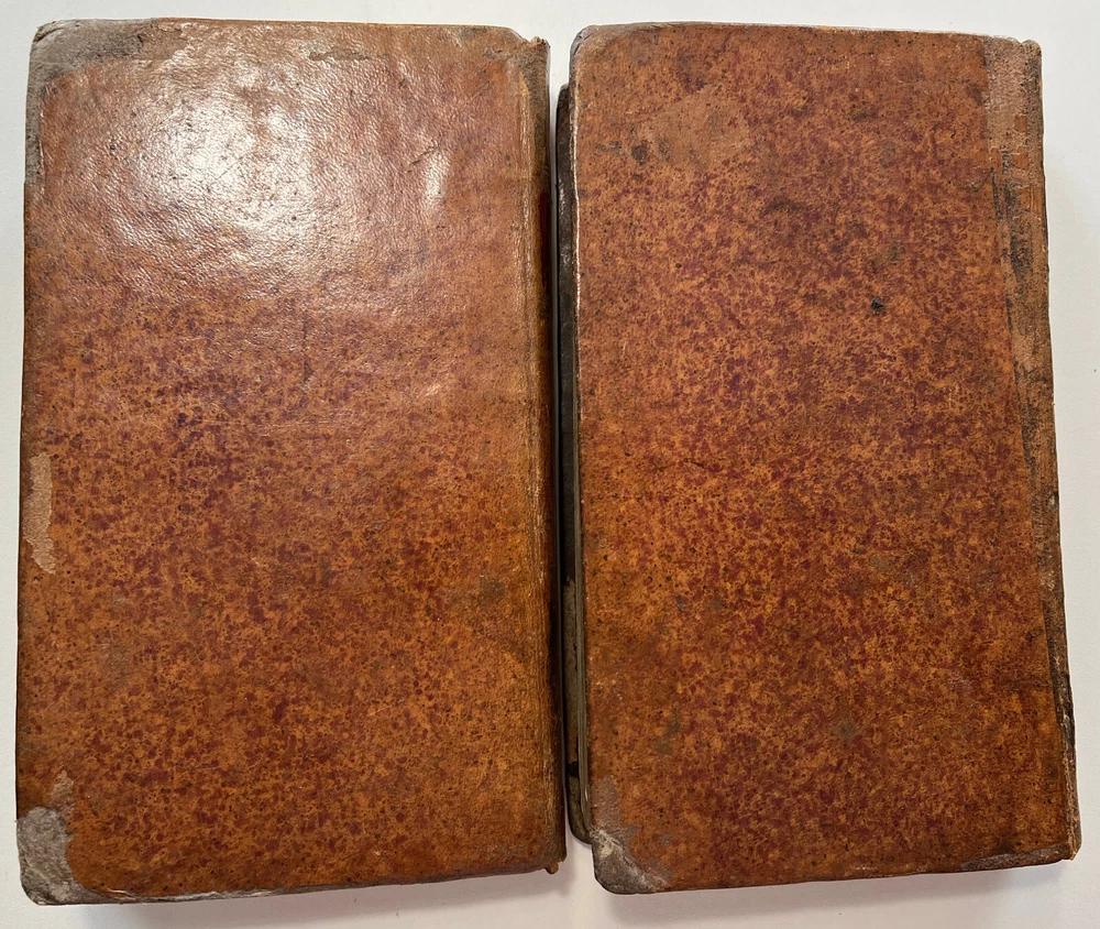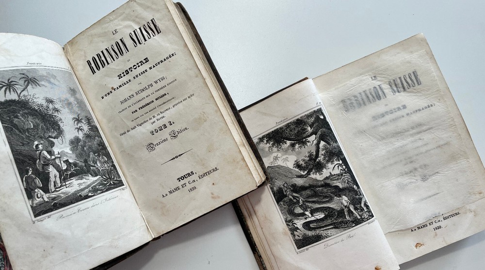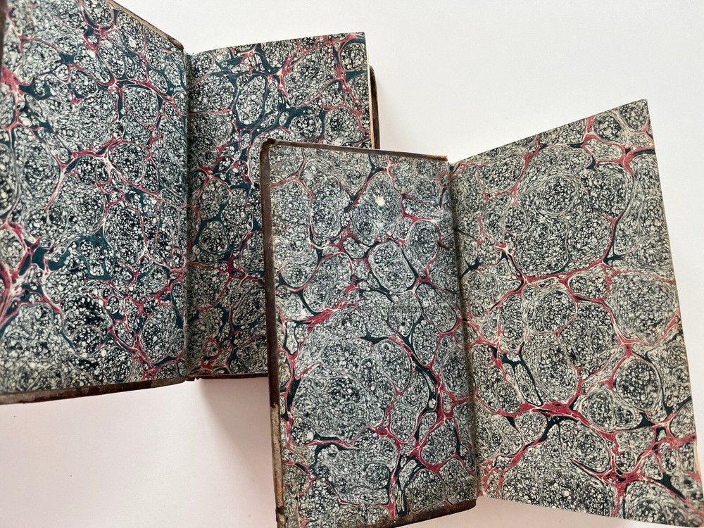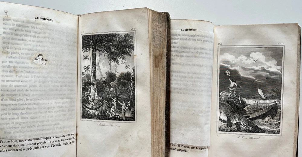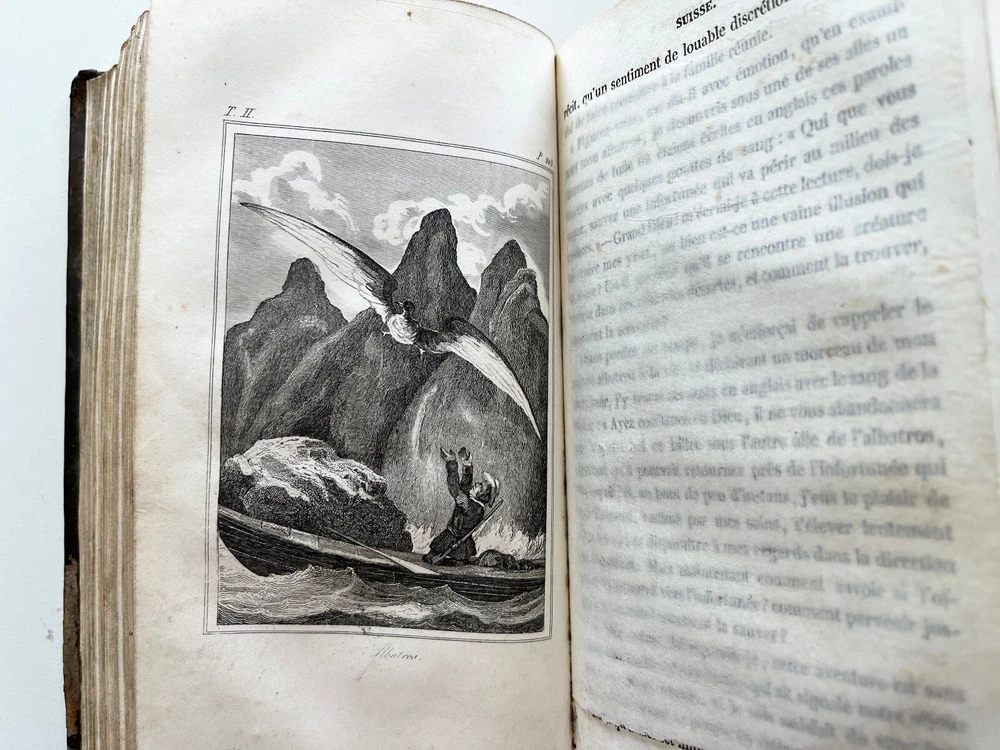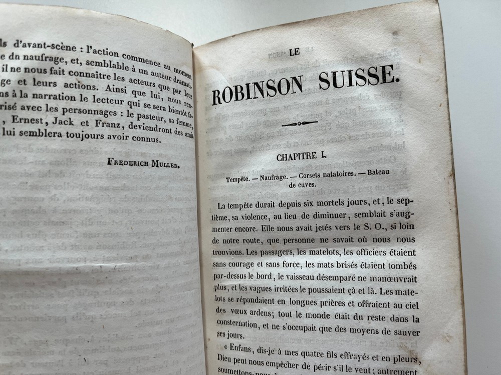 Fritz let his "roast" cook for about two hours; and it was not without astonishment that, after having taken off the triple layers of earth, cinders, and stones, the most delicious odour saluted our olfactories. Here we offer a very scarce stated second French-language edition of the classic adventure story, The Swiss Family Robinson , by Johann Wyss and published by A.B. Mame and Company, Tours, in 1839. Both volumes are included here, featuring tissue-protected illustrations and bound in leather with marbled endpages. Bindings are worn, but intact and pliable for an easy read (please see pics). Some minor stains/fingerprints. Very tight and square binding; very clean, bright, and crisp text and illustrations. 308 and 272 pages, respectively; they measure approximately 7 x 4.25-inches. This wonderful leather set will make a wonderful addition to your collection or a very thoughtful gift. Please click HERE to check out our other fine bindings! ** Have you seen all the amazing first and rare editions of iconic books we offer? We gladly combine shipping and refund the shipping overpayment, so please check out our other items ! -- other auctions of classic antiquarian literature and special gifts!** Thank you for your interest! ***Priority shipping options are available at checkout!***