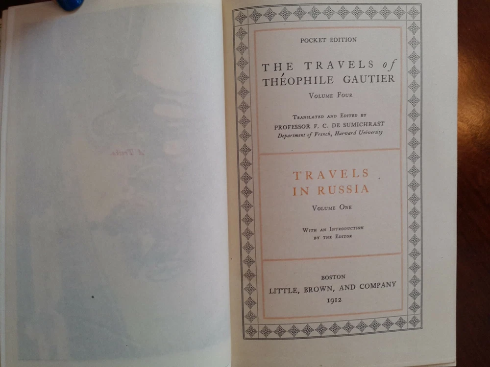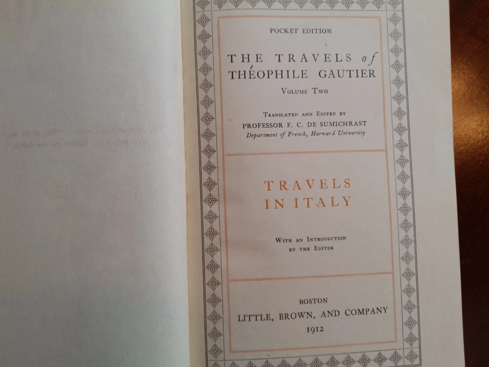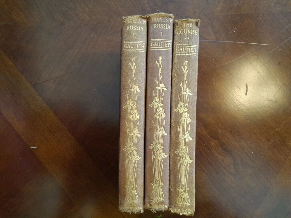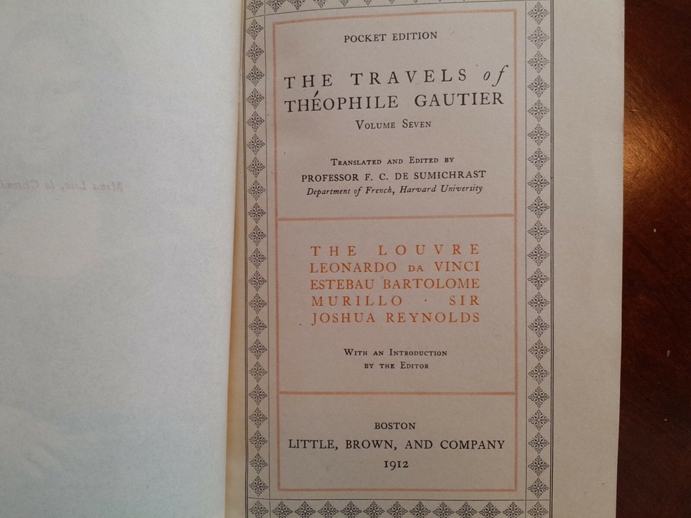 The Travels of Theophile Gautier , Complete 7 Volume Set, 1912. Illustrated. With Introduction by the Editor. Translated and Edited by Professor F. C. De Sumichrast, Department of French, Harvard University Pocket Edition. Leather softcover. Marbled boards. Gilded gold lettering on spines. Volume One: Travels in Spain Volume Two: Travels in Italy Volume Three: Constantinople Volume Four: Travels in Russia, V. One Volume Five: Travels in Russia, V. Two Volume Six: Paris Besieged Volume Seven: The Louvre, Leonardo Da Vinci, Estebau Bartolome Murillo, Sir Joshua Reynolds Condition: Good to very good. No tears, binding good. Pages are tight in binding