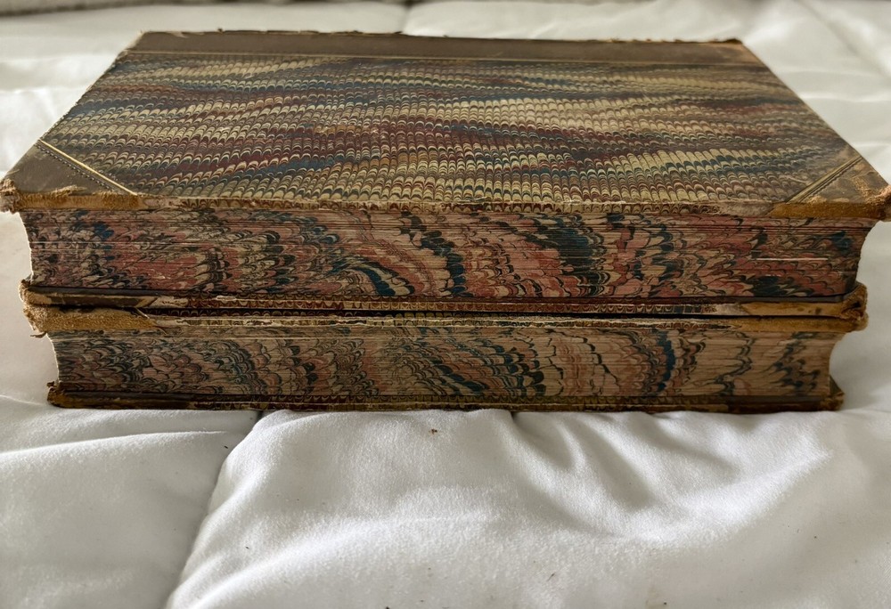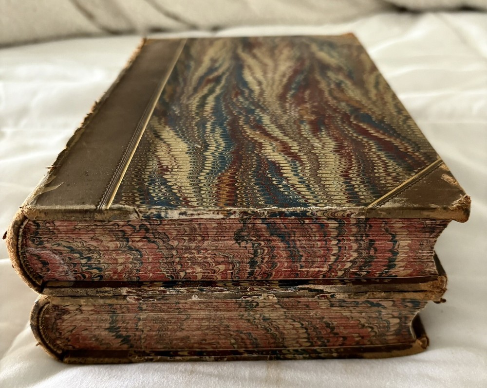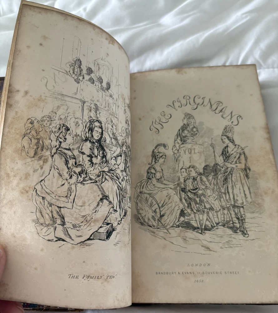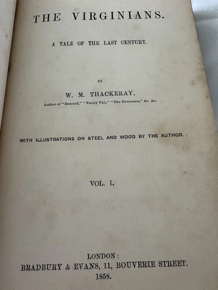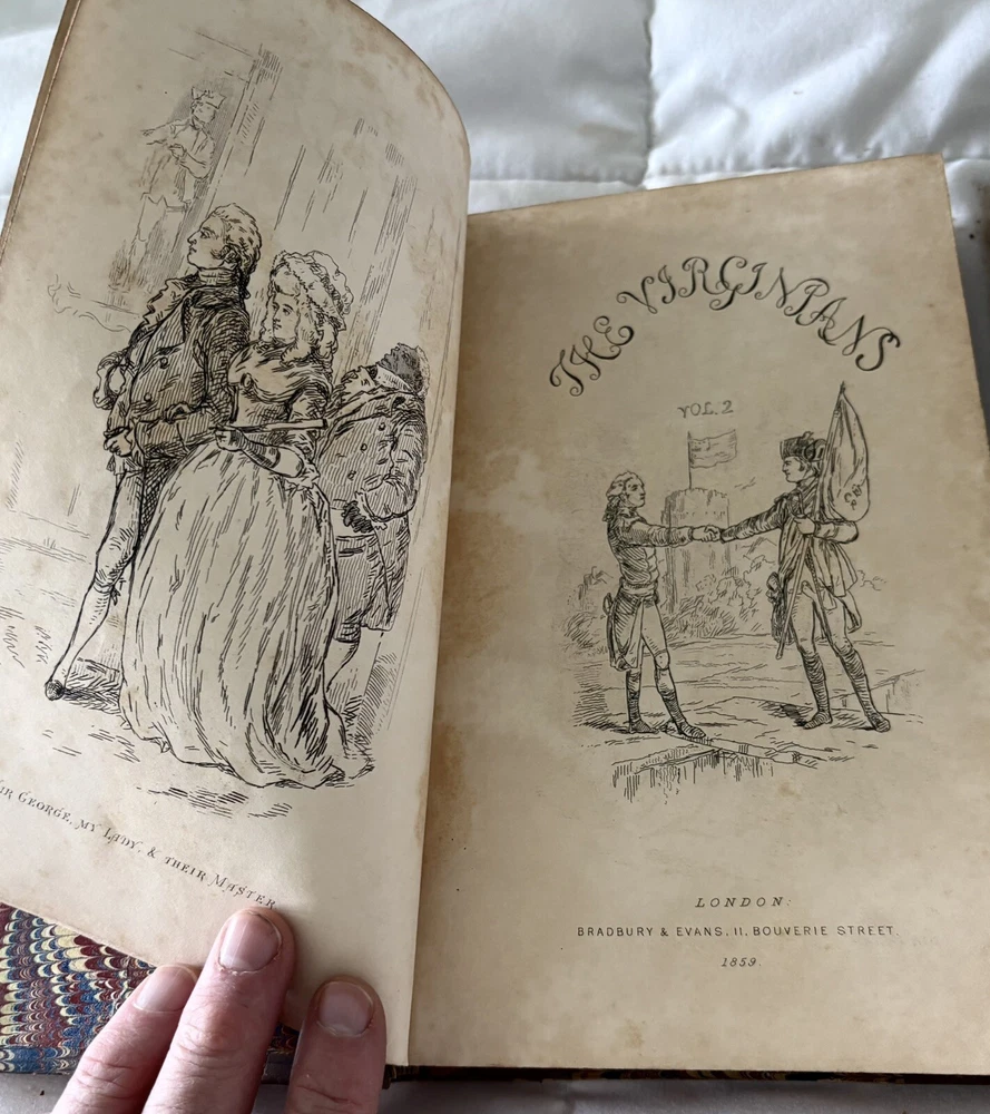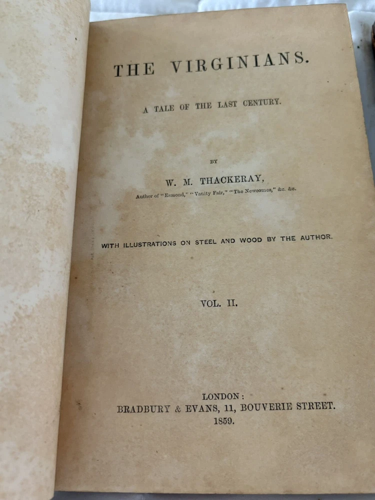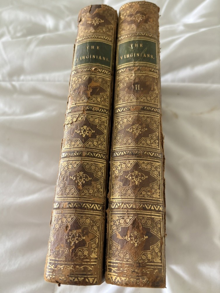 The first edition in book form of William Makepeace Thackeray's historical novel, dated 1858 and 1859, featuring the author's own illustrations. Original Leather covers are loose at spine but still attached. Extensive acid spots and aging to text block (the set IS over 165 years old). The story forms a sequel to his other popular work Henry Esmond, following the story of Henry's two grandsons, George and Henry Warrington and their experiences at war. Critical reception was generally favourable, and the novel has continued to be considered one of the standard works of 19th century fiction. This book is illustrated by Thackery himself, with a number of vignette illustrations, twenty-three plates to volume I, twenty-three plates to volume II, and an illustrated title page to each volume. In uniform half calf bindings over marbled boards, both volumes labelled in gilt to spine. Expected scuffing to boards and extremities. Illustrated with numerous vignette illustrations, twenty-three plates to volume I, twenty-three plates to volume II, and an illustrated title page to each volume. Volumes are fragile and will be securely bubble-wrapped for shipping. Please zoom in on photos for more details.
