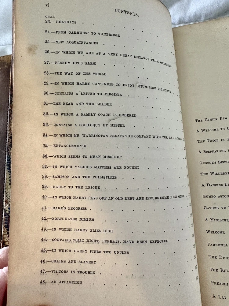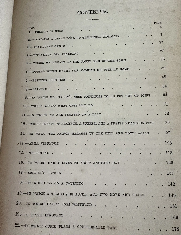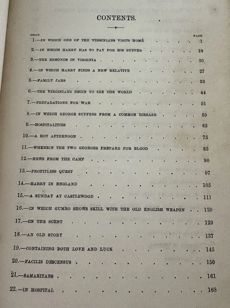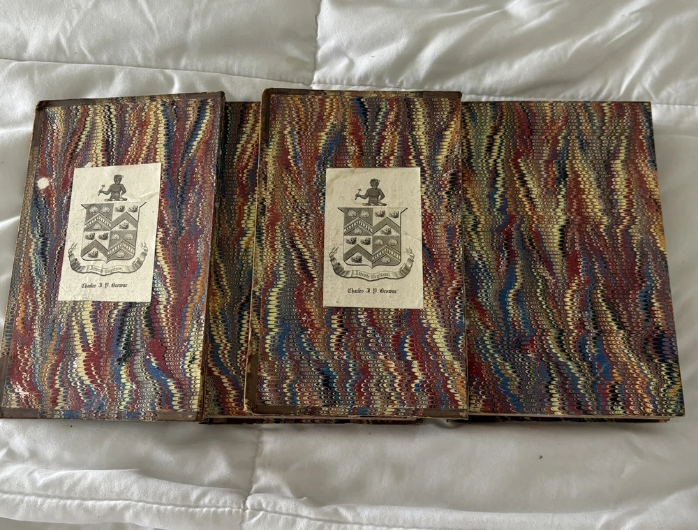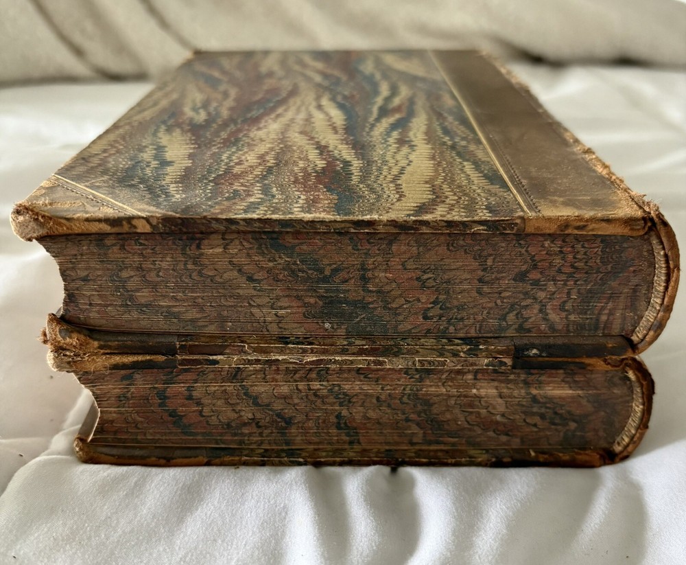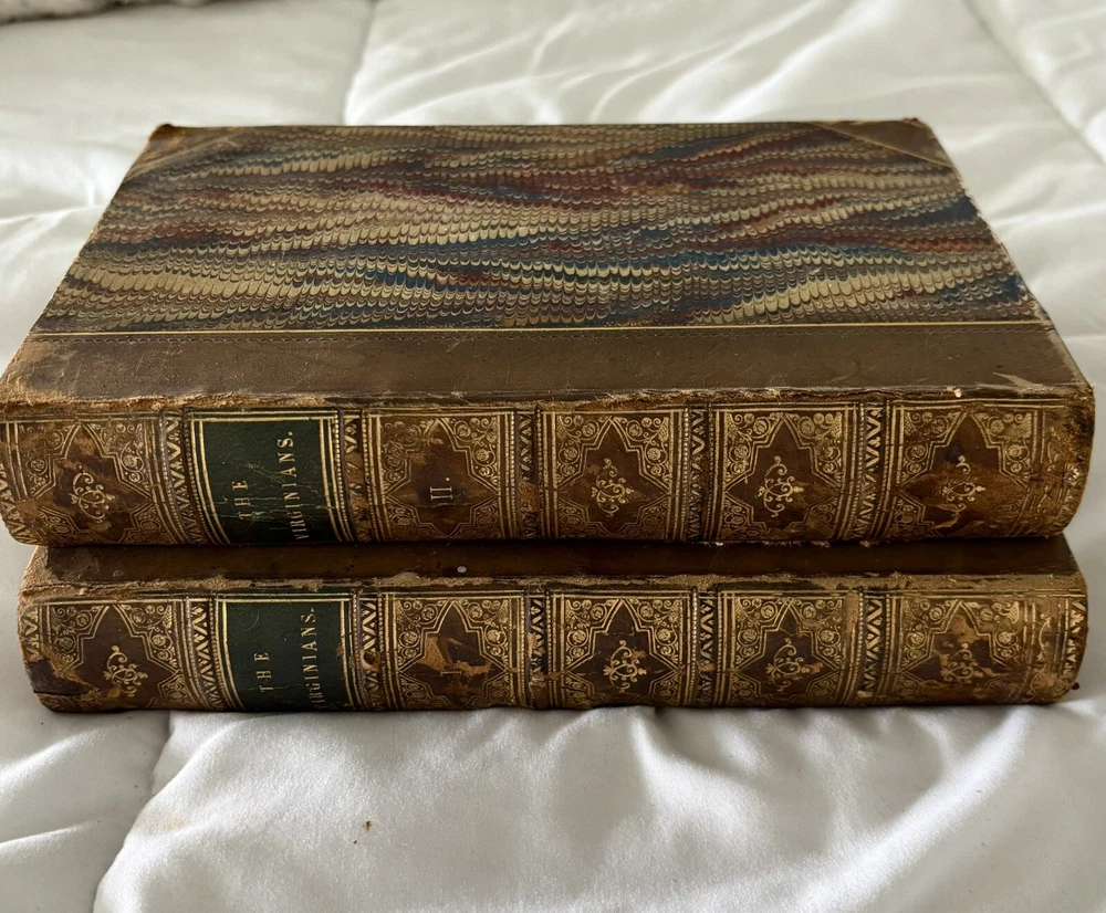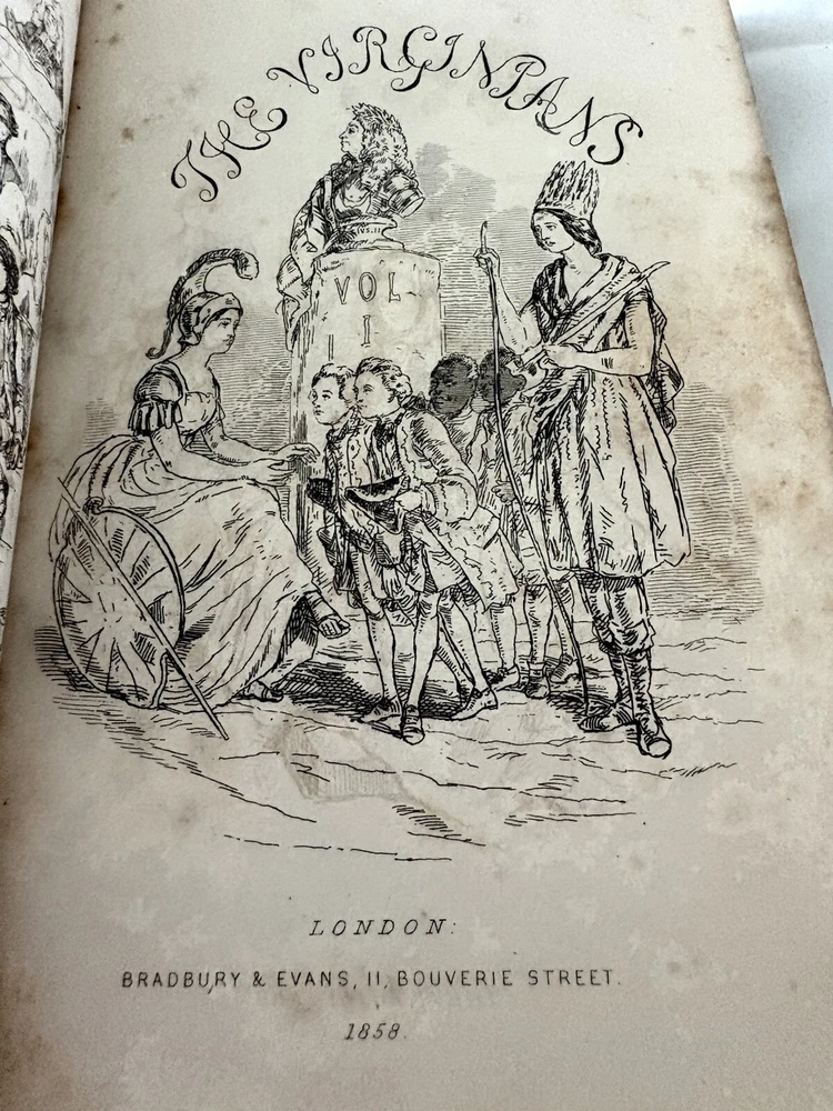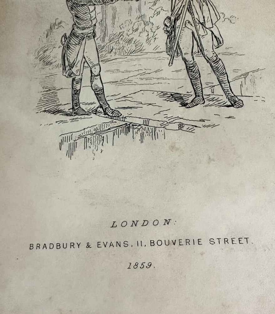 The first edition in book form of William Makepeace Thackeray's historical novel, dated 1858 and 1859, featuring the author's own illustrations. Original Leather covers are loose at spine but still attached. Extensive acid spots and aging to text block (the set IS over 165 years old). The story forms a sequel to his other popular work Henry Esmond, following the story of Henry's two grandsons, George and Henry Warrington and their experiences at war. Critical reception was generally favourable, and the novel has continued to be considered one of the standard works of 19th century fiction. This book is illustrated by Thackery himself, with a number of vignette illustrations, twenty-three plates to volume I, twenty-three plates to volume II, and an illustrated title page to each volume. In uniform half calf bindings over marbled boards, both volumes labelled in gilt to spine. Expected scuffing to boards and extremities. Illustrated with numerous vignette illustrations, twenty-three plates to volume I, twenty-three plates to volume II, and an illustrated title page to each volume. Volumes are fragile and will be securely bubble-wrapped for shipping. Please zoom in on photos for more details.
