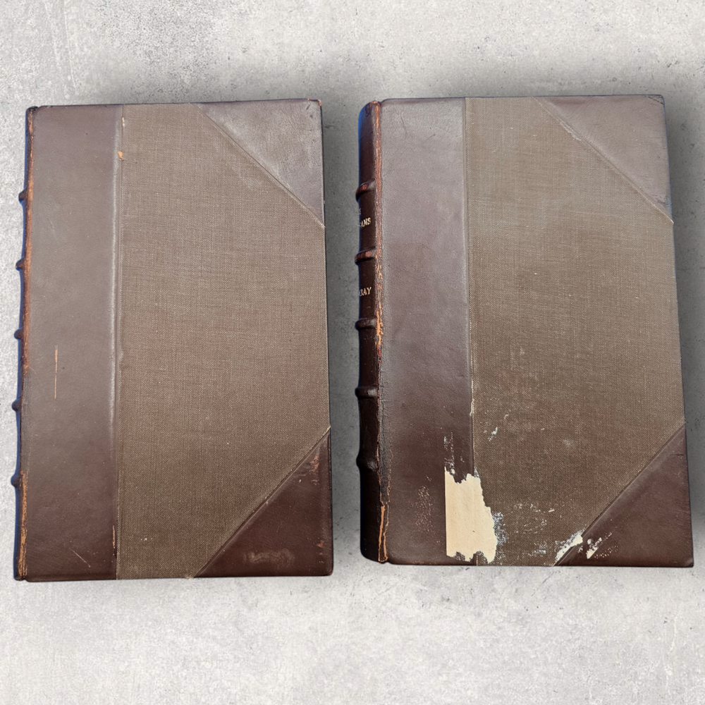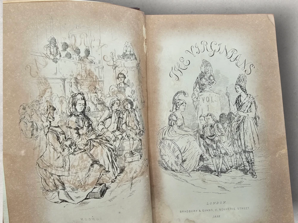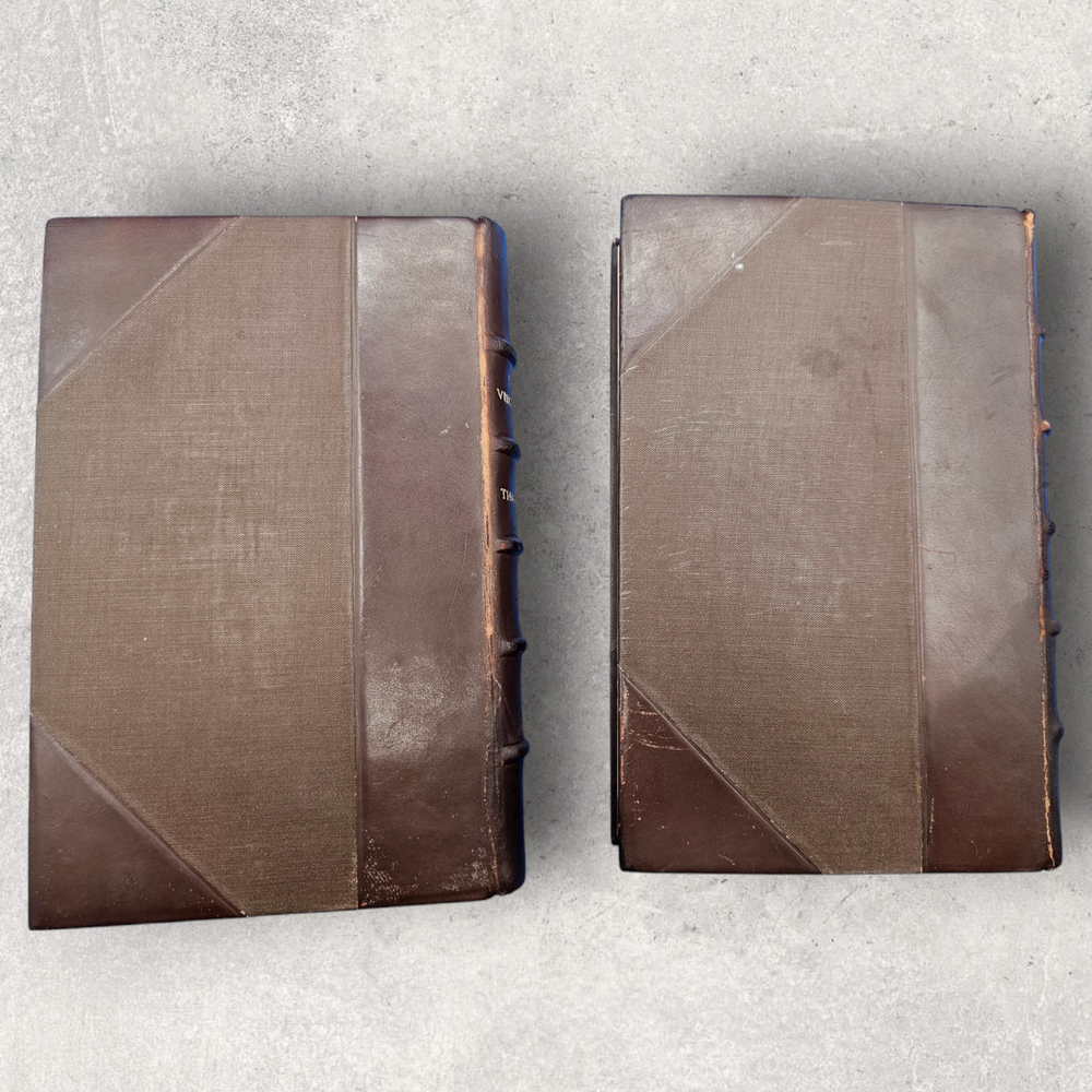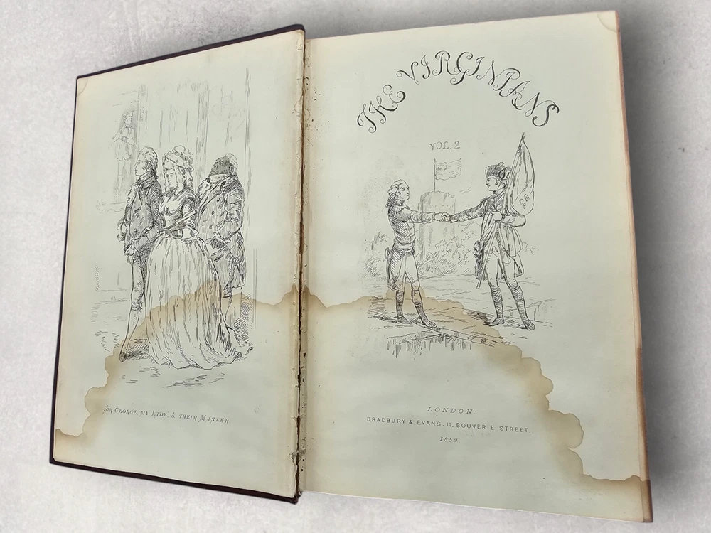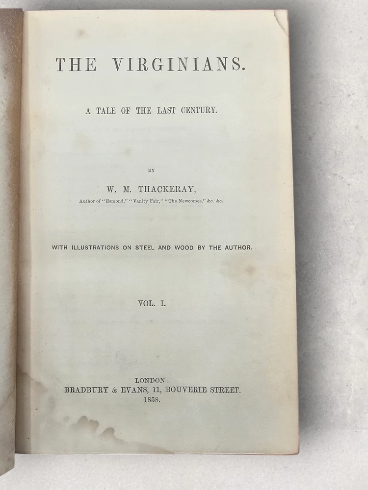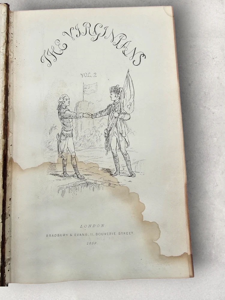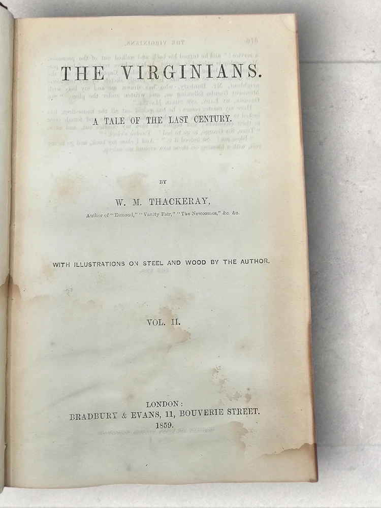 The Virginians W.M. Thackeray 1858-1859 2 Volume Set Leather Illustrated Rare 1. Book Overview: The Virginians: A Tale of the Last Century by W.M. Thackeray is a two-volume historical fiction masterpiece originally published in 1858-1859. This first edition by Bradbury & Evans explores the complexities of colonial and revolutionary America through the lives of the Warrington family. Known for its intricate storytelling and engaging illustrations, this work is a companion to Thackeray's famous novel Henry Esmond . The illustrations, etched by the author himself, add a unique depth to the narrative. 2. Physical Condition: Both volumes are bound in elegant half-leather with marbled endpapers and gilt spine lettering. The books show visible wear due to age. Volume I features scuffing on the leather corners and spine, while Volume II has a notable leather loss on the front cover. Both volumes have foxing and water stains, particularly evident on the illustrated title pages. Some loose hinges but overall intact bindings. The text remains legible, and the illustrations are preserved in their original quality. These issues reflect the historical nature of the set. 3. Additional Information: This rare set is a gem for collectors of Victorian literature. W.M. Thackeray's self-illustrations make it a unique collectible. It would be a perfect addition to any rare book collection, offering both literary and historical value. The dedication in Volume II is inscribed to Sir Henry Davison, Chief Justice of Madras, from "An Affectionate Old Friend," dated September 7, 1859.