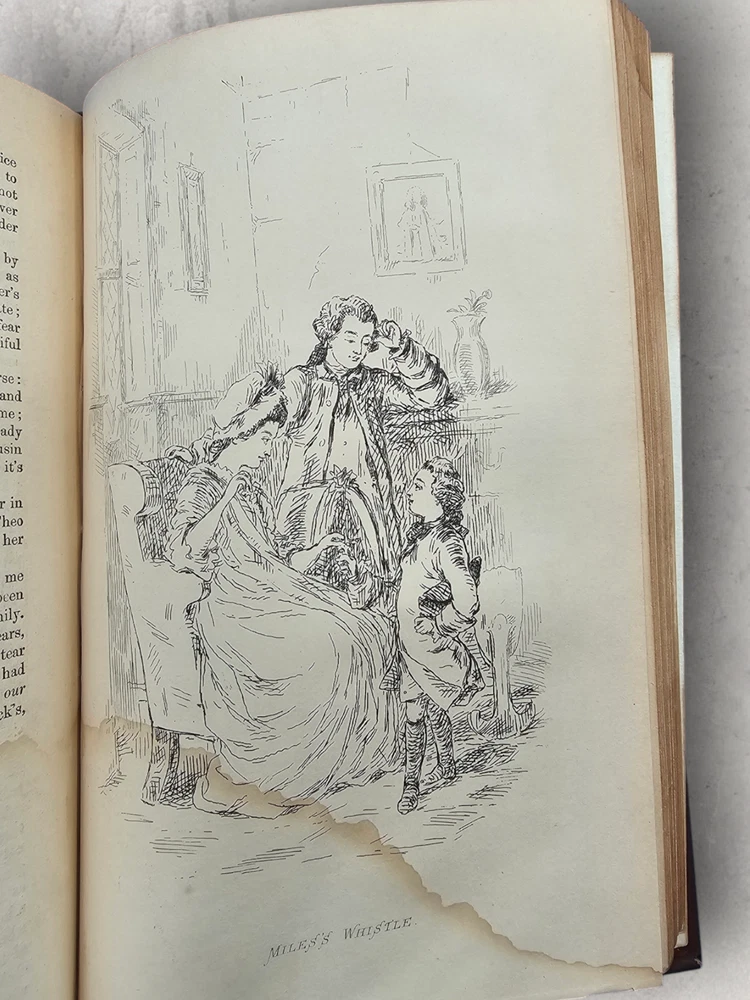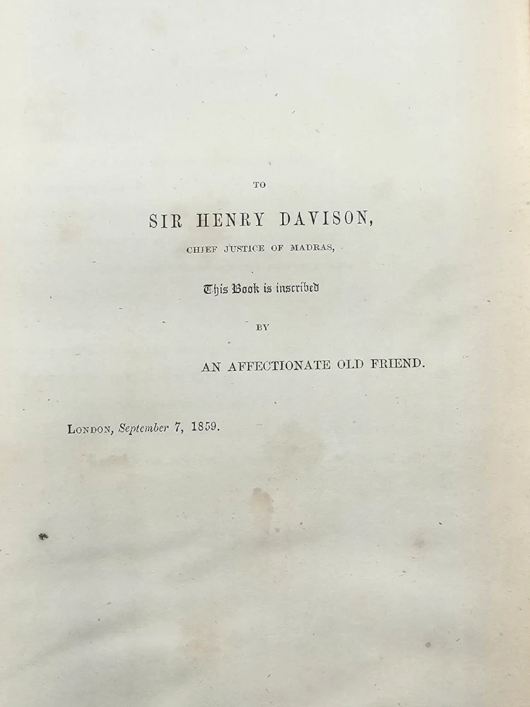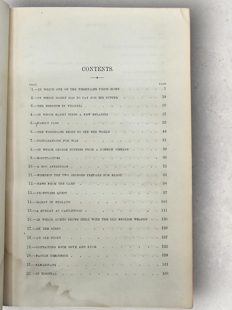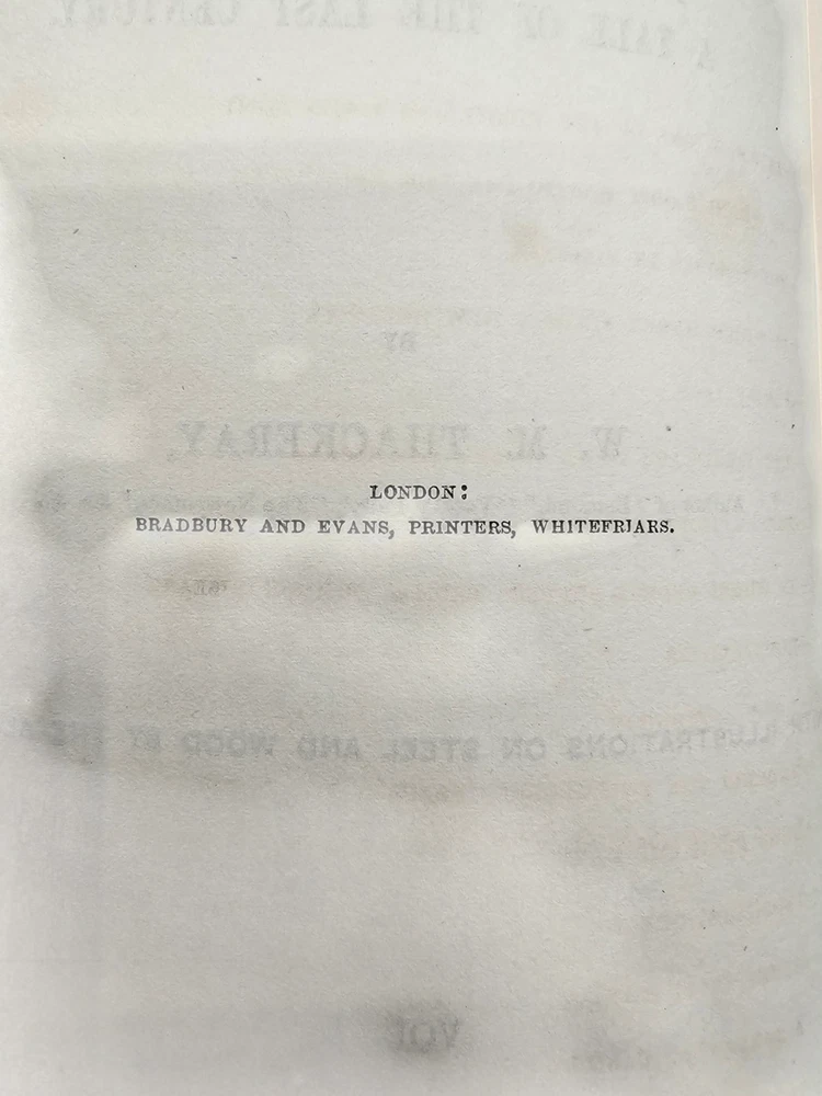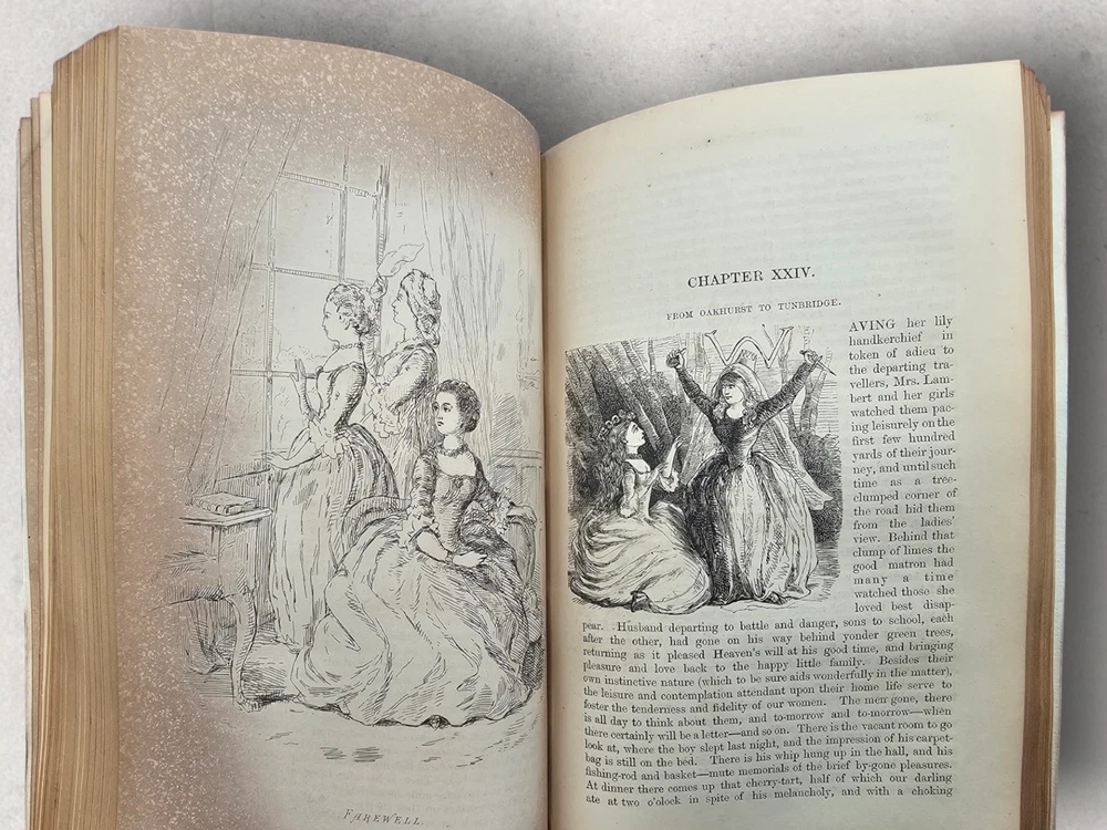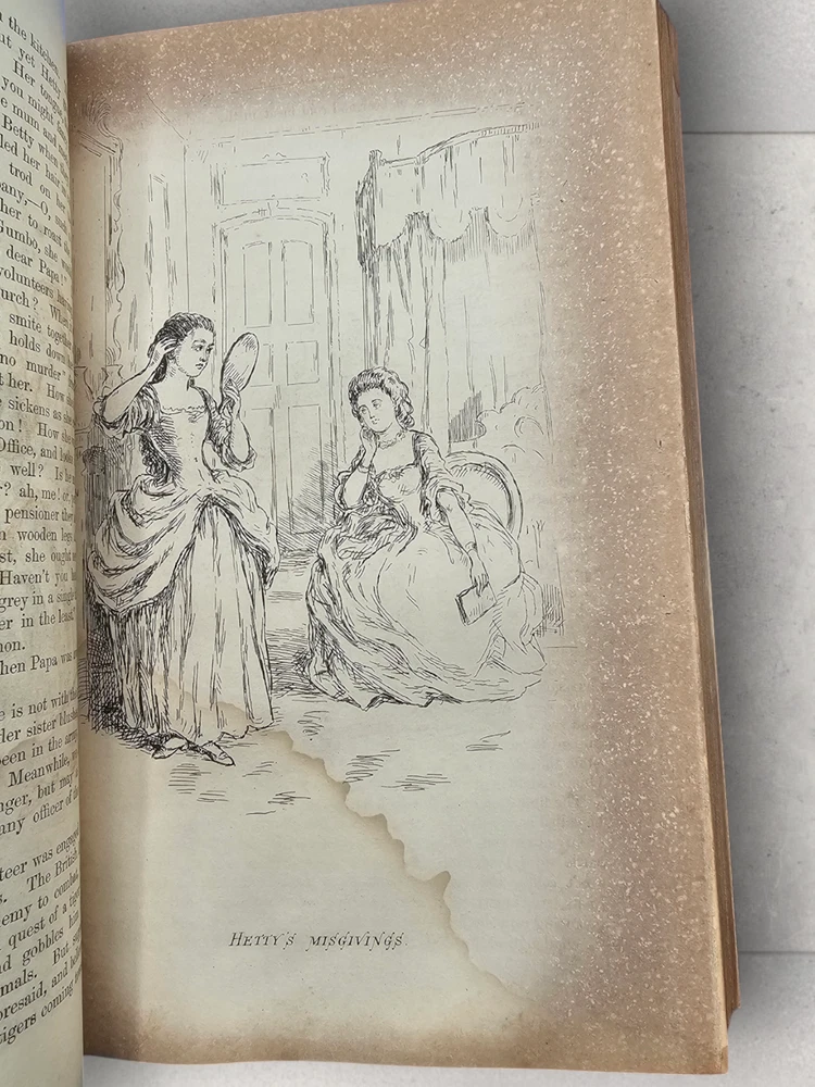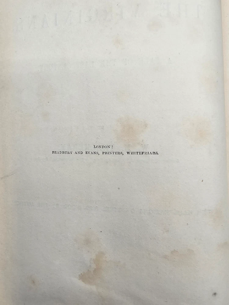 The Virginians W.M. Thackeray 1858-1859 2 Volume Set Leather Illustrated Rare 1. Book Overview: The Virginians: A Tale of the Last Century by W.M. Thackeray is a two-volume historical fiction masterpiece originally published in 1858-1859. This first edition by Bradbury & Evans explores the complexities of colonial and revolutionary America through the lives of the Warrington family. Known for its intricate storytelling and engaging illustrations, this work is a companion to Thackeray's famous novel Henry Esmond . The illustrations, etched by the author himself, add a unique depth to the narrative. 2. Physical Condition: Both volumes are bound in elegant half-leather with marbled endpapers and gilt spine lettering. The books show visible wear due to age. Volume I features scuffing on the leather corners and spine, while Volume II has a notable leather loss on the front cover. Both volumes have foxing and water stains, particularly evident on the illustrated title pages. Some loose hinges but overall intact bindings. The text remains legible, and the illustrations are preserved in their original quality. These issues reflect the historical nature of the set. 3. Additional Information: This rare set is a gem for collectors of Victorian literature. W.M. Thackeray's self-illustrations make it a unique collectible. It would be a perfect addition to any rare book collection, offering both literary and historical value. The dedication in Volume II is inscribed to Sir Henry Davison, Chief Justice of Madras, from "An Affectionate Old Friend," dated September 7, 1859.
