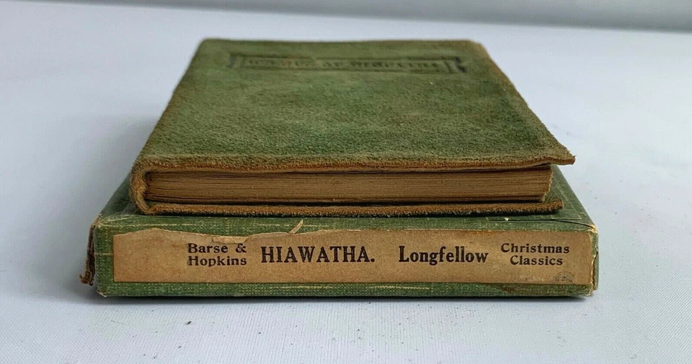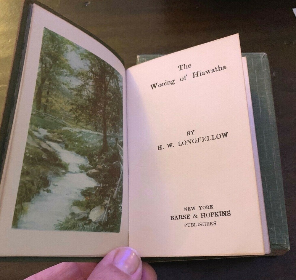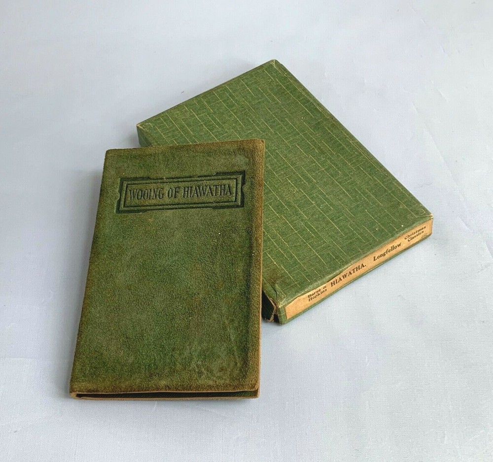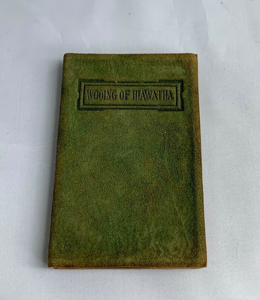 We are pleased to offer you Antique Copy of Wooing of Hiawatha H.W. Longellow. This green suede/leather Pocono Pines Boxed Set is in nice condition as shown in the photos. Published by Barse & Hopkins, New York. All pages are in tact and in good condition. Comes in it's original box which shows minimal wear as to be expected from age. The frontispiece is signed & dated......"Gracie Marie Cadwalader- Sept. 12,1916" when it was given as a gift. Thank you for looking. We accept PAYPAL .....and Visa/MC. If you are unable to pay via these services please email us. DO NOT USE THE EBAY CALCULATORS FOR SHIPPING COSTS, AS THEY ARE GROSSLY INACCURATE. WE WILL ONLY HONOR SHIPPING CHARGES AS STATED BELOW IN TEXT. PLEASE!....PLEASE!........PLEASE!..........DO NOT check-out until we send you an invoice.........it will be an Ebay invoice, but it is much easier for us to monitor the sales if we can send you an invoice first........we do ebay every day, so there will be no delay.. Continental USA shipping $3.00, including insurance / Insurance coverage is now required per ebay rule changes. We will be insuring through a third party with the cost included in your shipping charges. PLEASE do not bid if you are not going to complete the transaction. Concerning international sales.........please email for shipping quote..........we refuse to alter sales information in order to reduce any customs charges the buyer may be responsible for.........in their resident country. All custom costs are the responsibility of the buyer. We reserve the right to negate any sale where the item has not been paid for in full within 10 days of the end of auction......or from any buyer who has not made contact within that time period. Some items offered on ebay are subject to prior sale. Some of the items offered for sale on Ebay are also for sale in our bricks and mortar store in Phila., Pa. There is chance that an item could sell in our store, before we are able to end the listing on ebay, thereby negating the ebay sale. Pa. residents add 6% sales tax or furnish us with valid tax exemption number. By bidding on this item you agree to the terms of sale, as we have stated them above. Track Page Views With Auctiva's FREE Counter