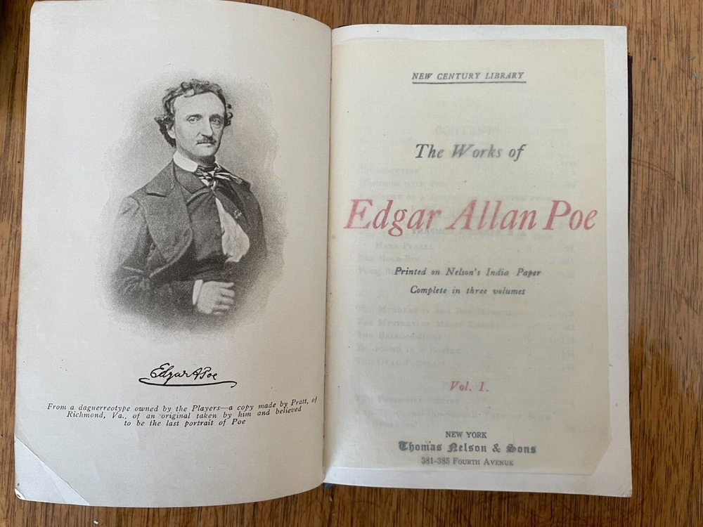 This is a collector's edition of "The Works Of Edgar Allan Poe Vol. 1" published by Thomas Nelson. It is an illustrated 1st edition complete set of Poe's works in English, bound in leather with limp leather covers. The book is printed on India paper and originates from New York & London in 1905. This antique book is a valuable addition for literature enthusiasts and collectors.
