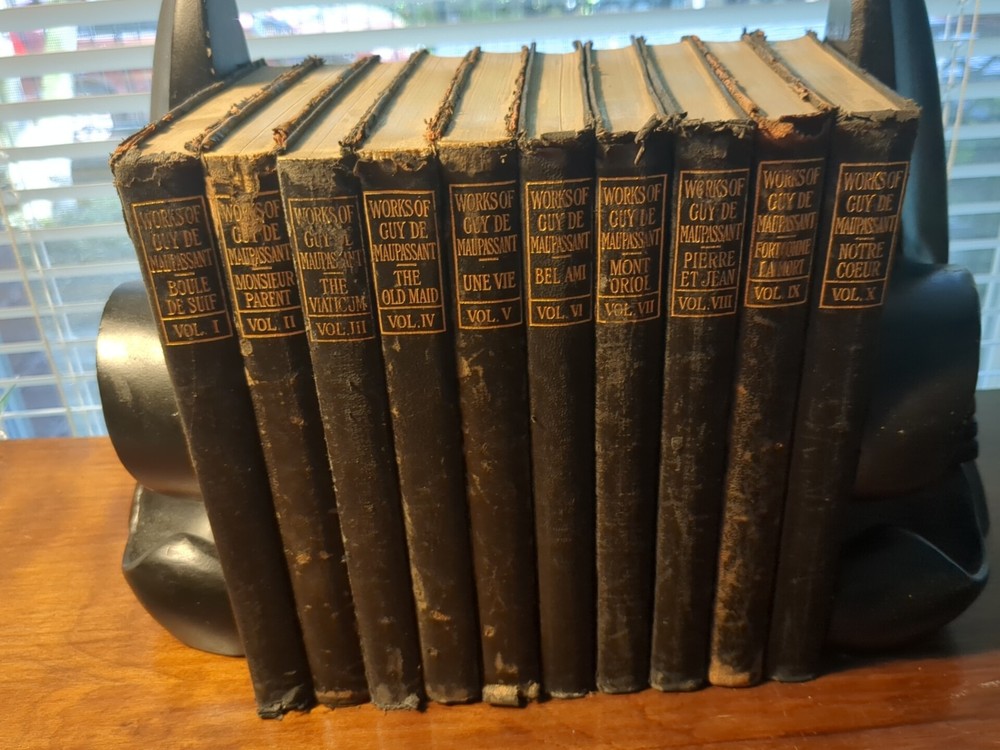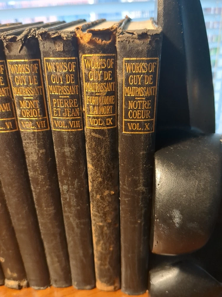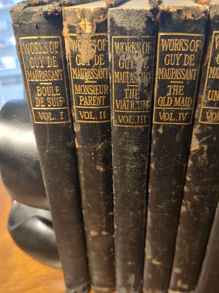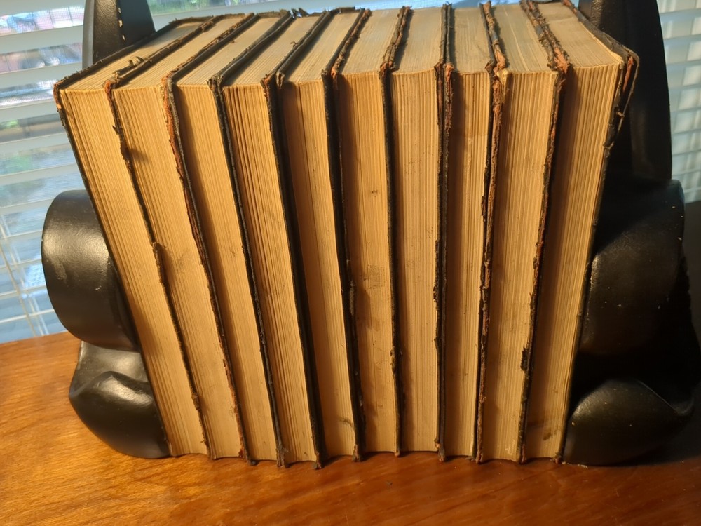 These are good reading copies findings are tight and pages are clean. Board show the most where the leather is peeling in a few instances especially on the edges. Good reading copies.