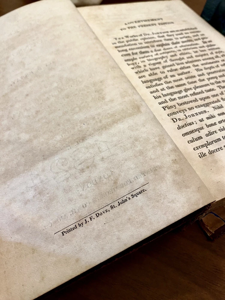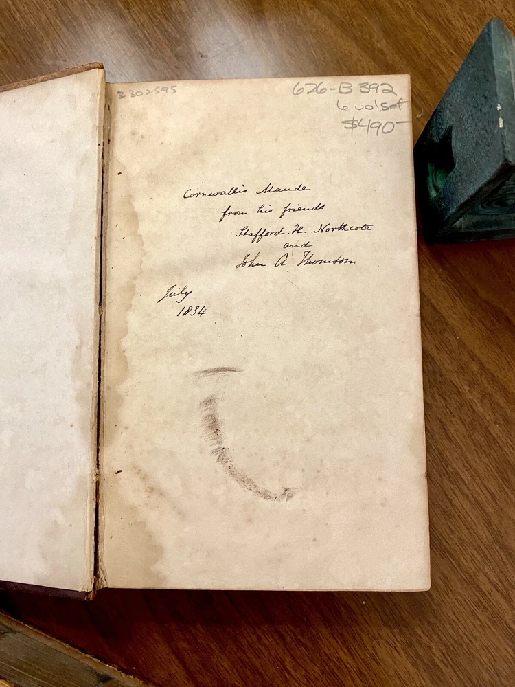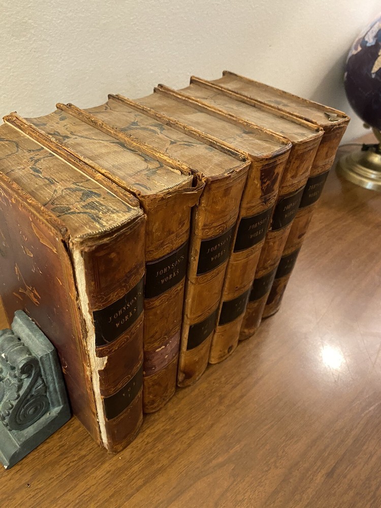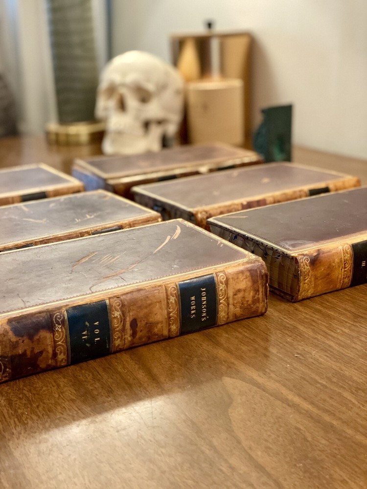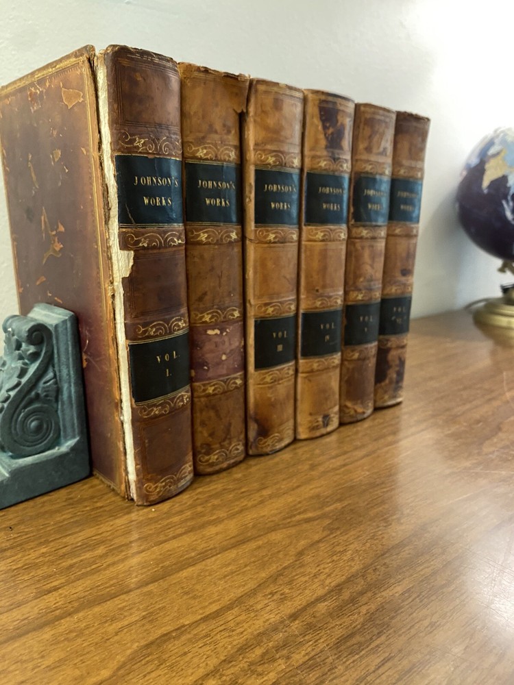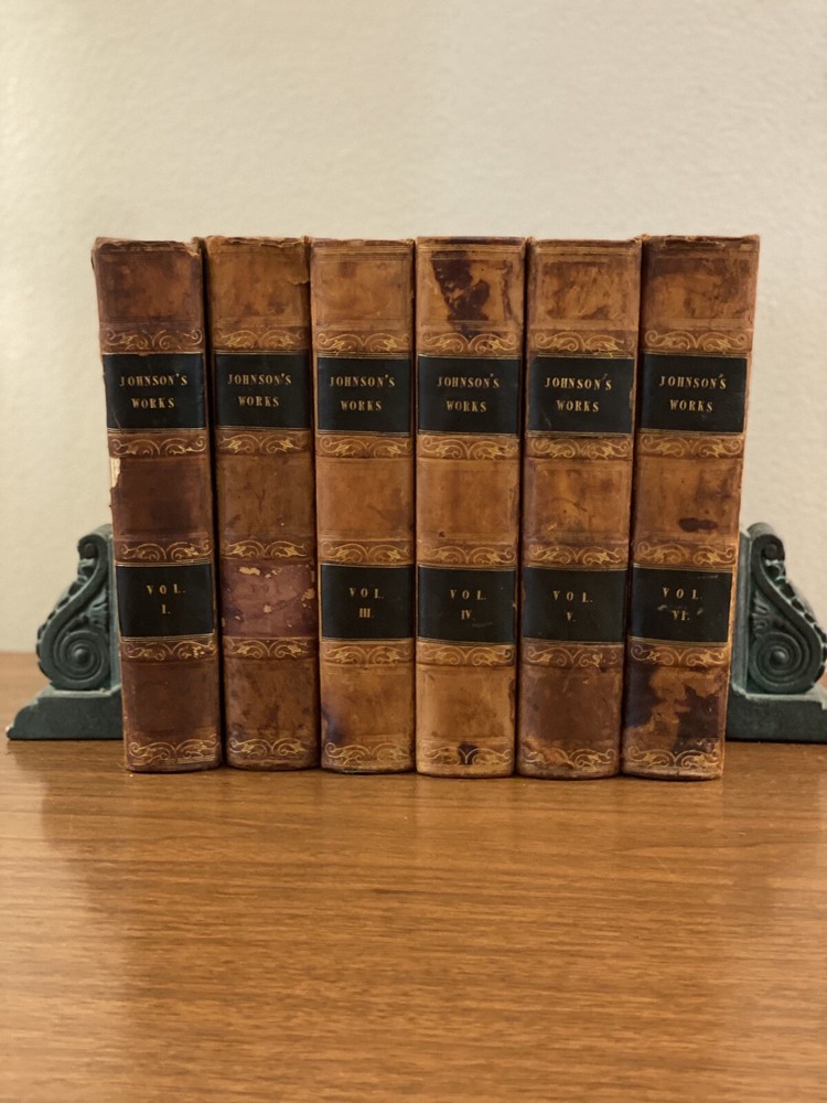 This is a complete set of "The Works of Samuel Johnson, with Murthy’s Essays,” in six volumes, edited by The Rev. Robert Lynam. This set was printed in 1825 by J.F. Dove, St. John's Square in London, for George Cowie & Co. in the Poultry. The books are bound in leather and feature a frontispiece engraving by Robert Grave. Attractive, strong binding in full calf, with gilt frame border on sides, four bands on spines with gilt tooling above and below. Black labels lettered in gilt, with one label missing (but residual lettering visible in blind). Volume one front cover is detached but together with the set. Small tear at top right of spine on volume two. Some issue apparent to top of pages 347-360 in Volume one. All other pages are largely bright and clean with little fixing throughout. See photograph of receipt from purchase by the previous owner, 1997 at $441. Volume One contains an inscription, “Cornwallis Maude, from his friends Stafford H. Northcote and John A. Thomson.” These men are important historical figures, having held multiple positions in British government. Cornwallis Maude was a viscount who served in the administration of Benjamin Disraeli. Sir Stafford Henry Northcote was 1st Earl of Iddesleigh, Chancellor of the Exchequer, and Secretary of State for India. This set comes with an adventure for any history buff, to identify which John A. Thompson may be referenced in the inscription. Anglophiles, this one’s for you. The books are perfect for collectors and enthusiasts of antique books, and would make a great addition to any collection.