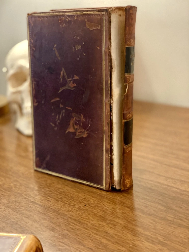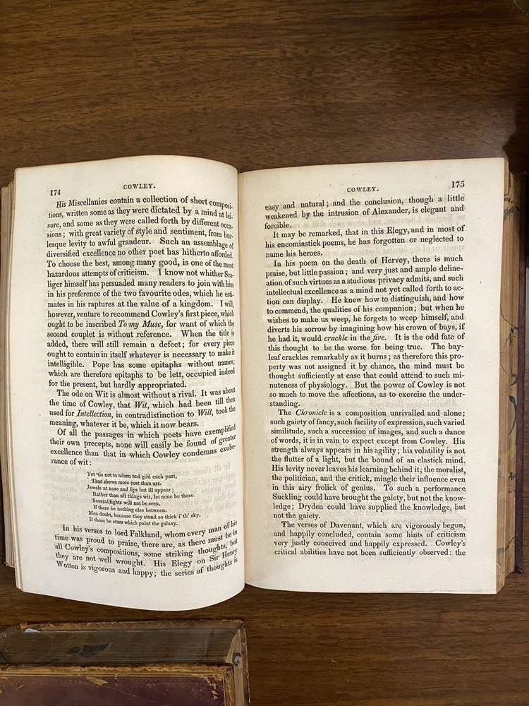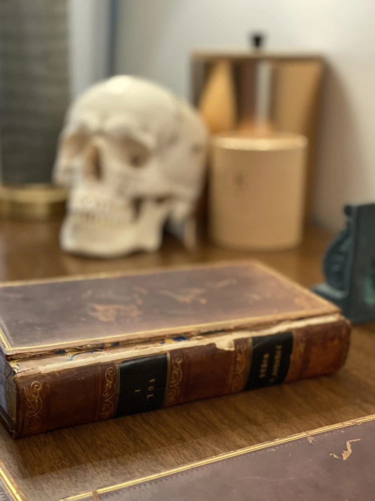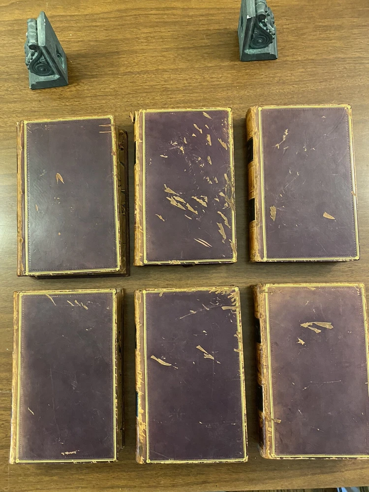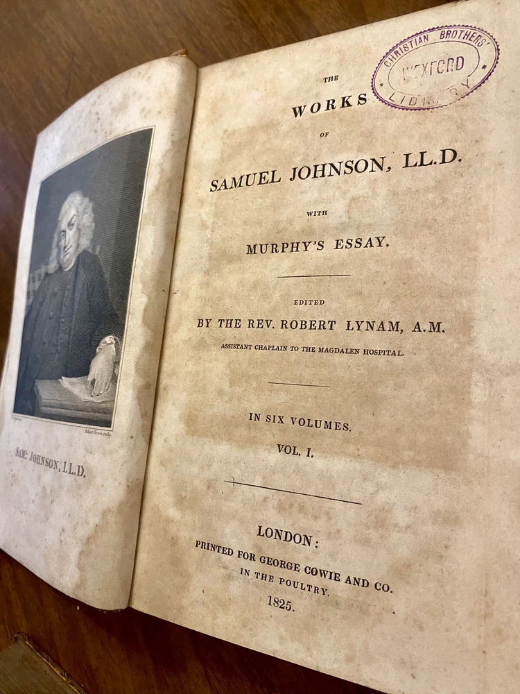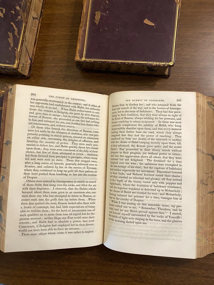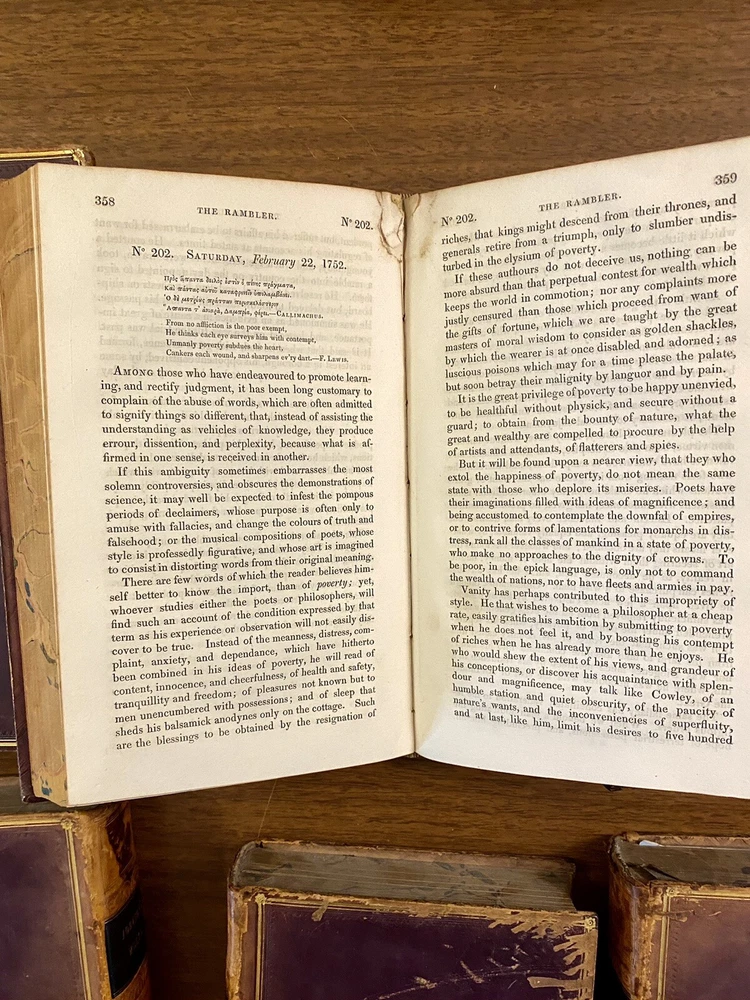 This is a complete set of "The Works of Samuel Johnson, with Murthy’s Essays,” in six volumes, edited by The Rev. Robert Lynam. This set was printed in 1825 by J.F. Dove, St. John's Square in London, for George Cowie & Co. in the Poultry. The books are bound in leather and feature a frontispiece engraving by Robert Grave. Attractive, strong binding in full calf, with gilt frame border on sides, four bands on spines with gilt tooling above and below. Black labels lettered in gilt, with one label missing (but residual lettering visible in blind). Volume one front cover is detached but together with the set. Small tear at top right of spine on volume two. Some issue apparent to top of pages 347-360 in Volume one. All other pages are largely bright and clean with little fixing throughout. See photograph of receipt from purchase by the previous owner, 1997 at $441. Volume One contains an inscription, “Cornwallis Maude, from his friends Stafford H. Northcote and John A. Thomson.” These men are important historical figures, having held multiple positions in British government. Cornwallis Maude was a viscount who served in the administration of Benjamin Disraeli. Sir Stafford Henry Northcote was 1st Earl of Iddesleigh, Chancellor of the Exchequer, and Secretary of State for India. This set comes with an adventure for any history buff, to identify which John A. Thompson may be referenced in the inscription. Anglophiles, this one’s for you. The books are perfect for collectors and enthusiasts of antique books, and would make a great addition to any collection.