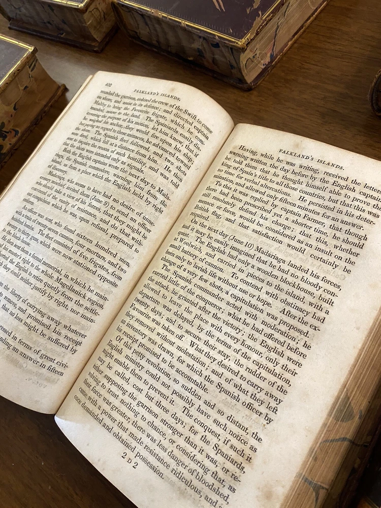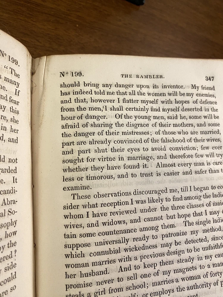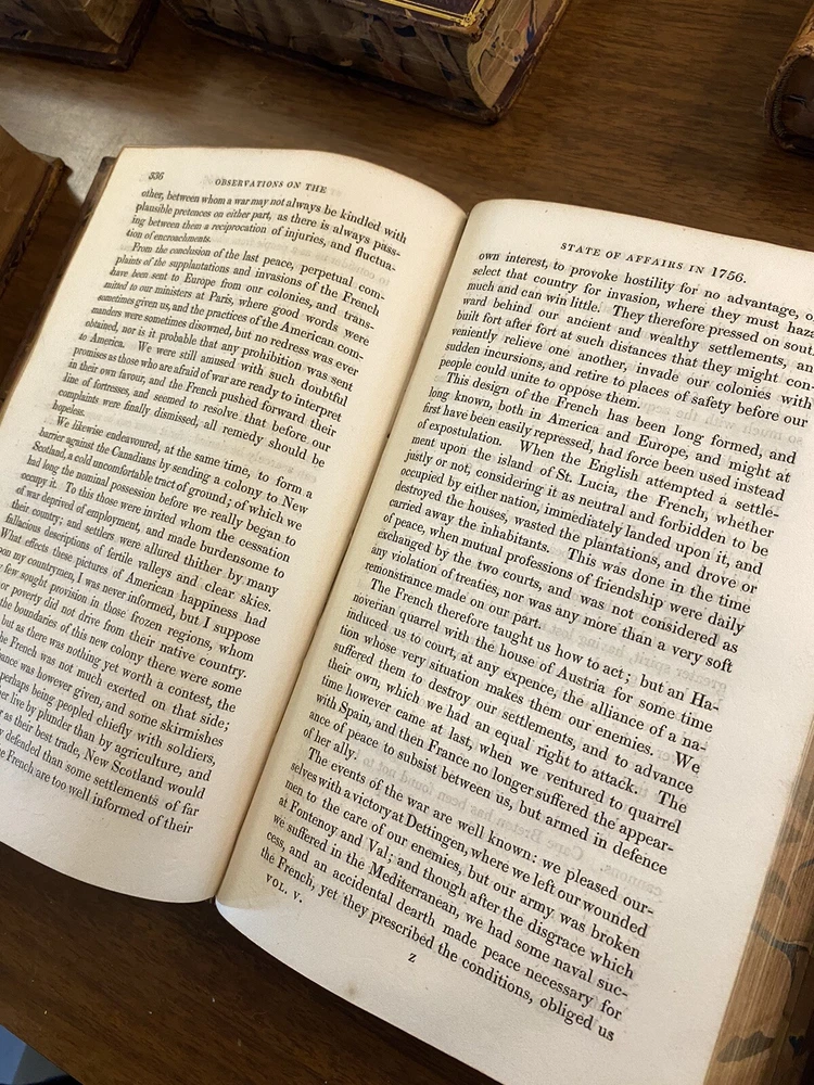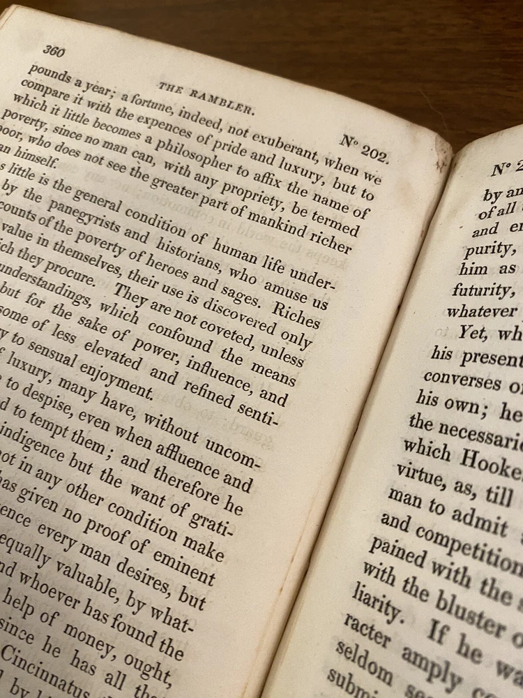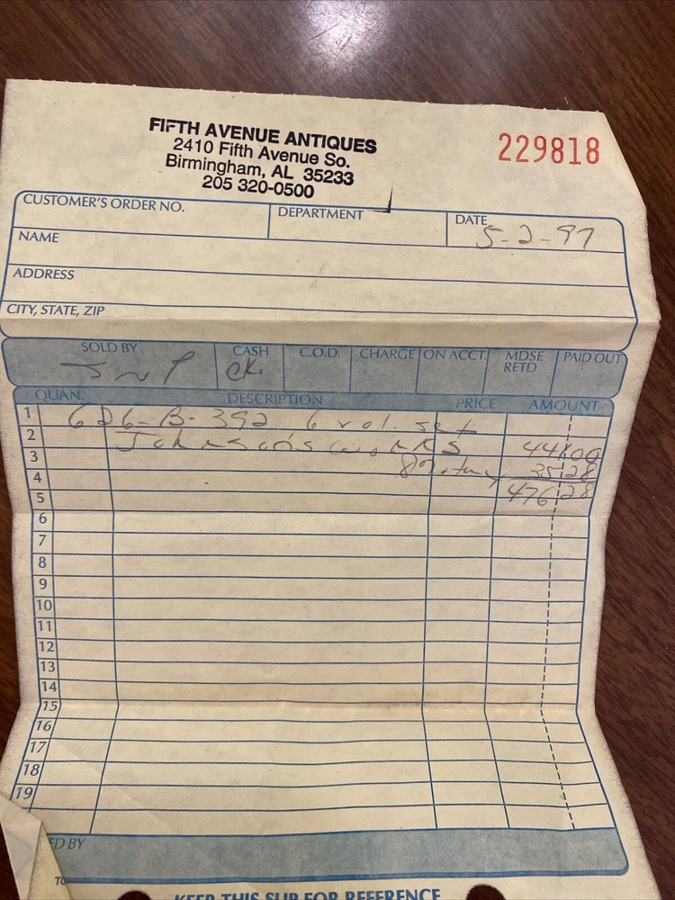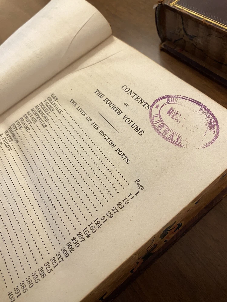 This is a complete set of "The Works of Samuel Johnson, with Murthy’s Essays,” in six volumes, edited by The Rev. Robert Lynam. This set was printed in 1825 by J.F. Dove, St. John's Square in London, for George Cowie & Co. in the Poultry. The books are bound in leather and feature a frontispiece engraving by Robert Grave. Attractive, strong binding in full calf, with gilt frame border on sides, four bands on spines with gilt tooling above and below. Black labels lettered in gilt, with one label missing (but residual lettering visible in blind). Volume one front cover is detached but together with the set. Small tear at top right of spine on volume two. Some issue apparent to top of pages 347-360 in Volume one. All other pages are largely bright and clean with little fixing throughout. See photograph of receipt from purchase by the previous owner, 1997 at $441. Volume One contains an inscription, “Cornwallis Maude, from his friends Stafford H. Northcote and John A. Thomson.” These men are important historical figures, having held multiple positions in British government. Cornwallis Maude was a viscount who served in the administration of Benjamin Disraeli. Sir Stafford Henry Northcote was 1st Earl of Iddesleigh, Chancellor of the Exchequer, and Secretary of State for India. This set comes with an adventure for any history buff, to identify which John A. Thompson may be referenced in the inscription. Anglophiles, this one’s for you. The books are perfect for collectors and enthusiasts of antique books, and would make a great addition to any collection.