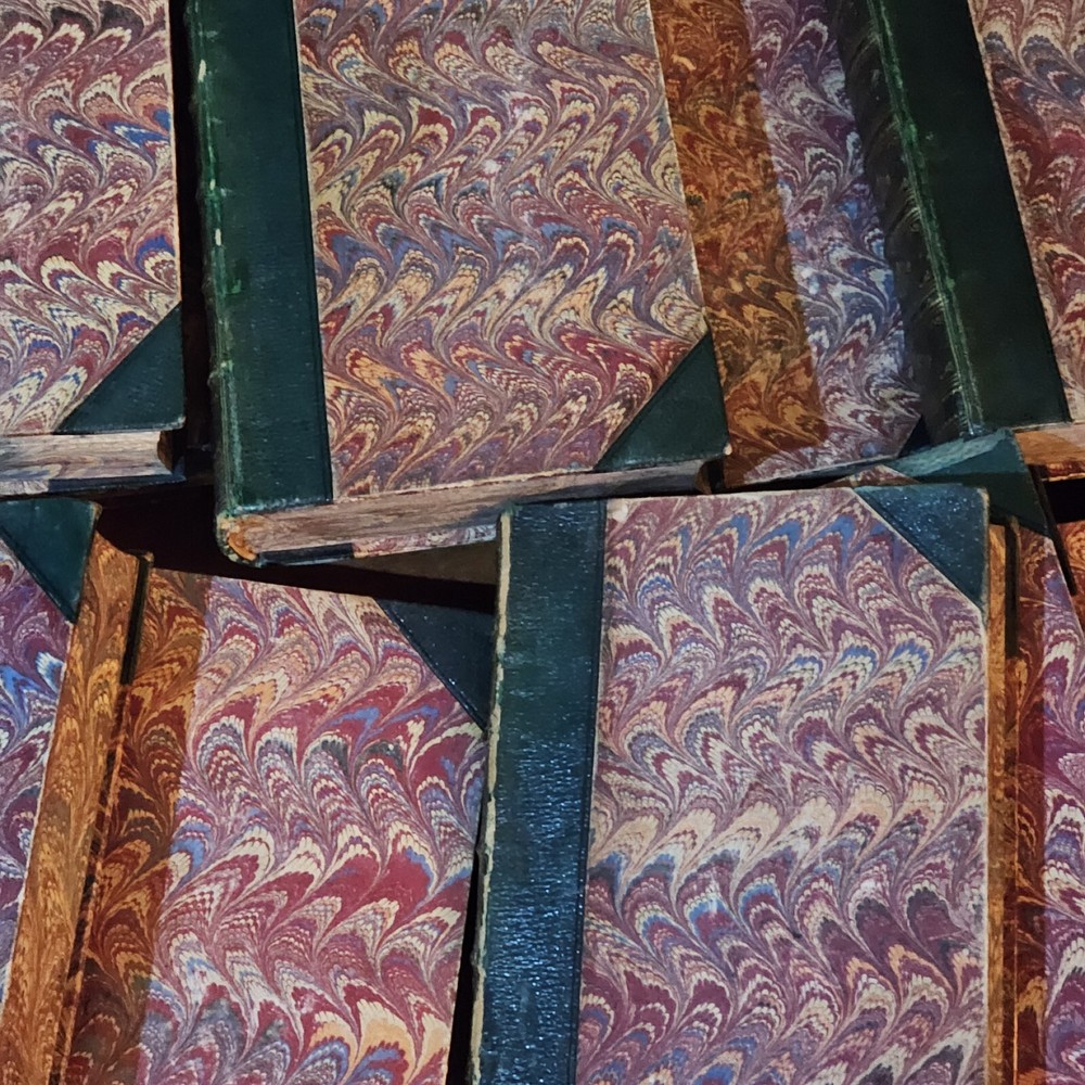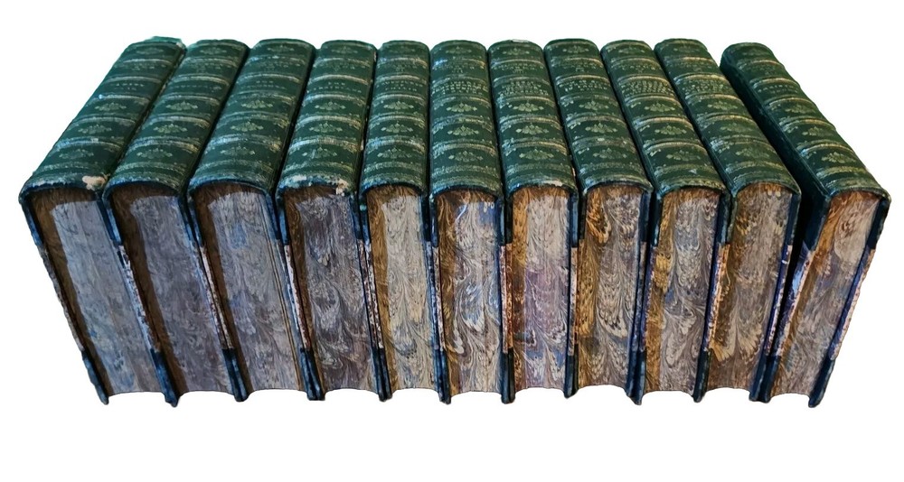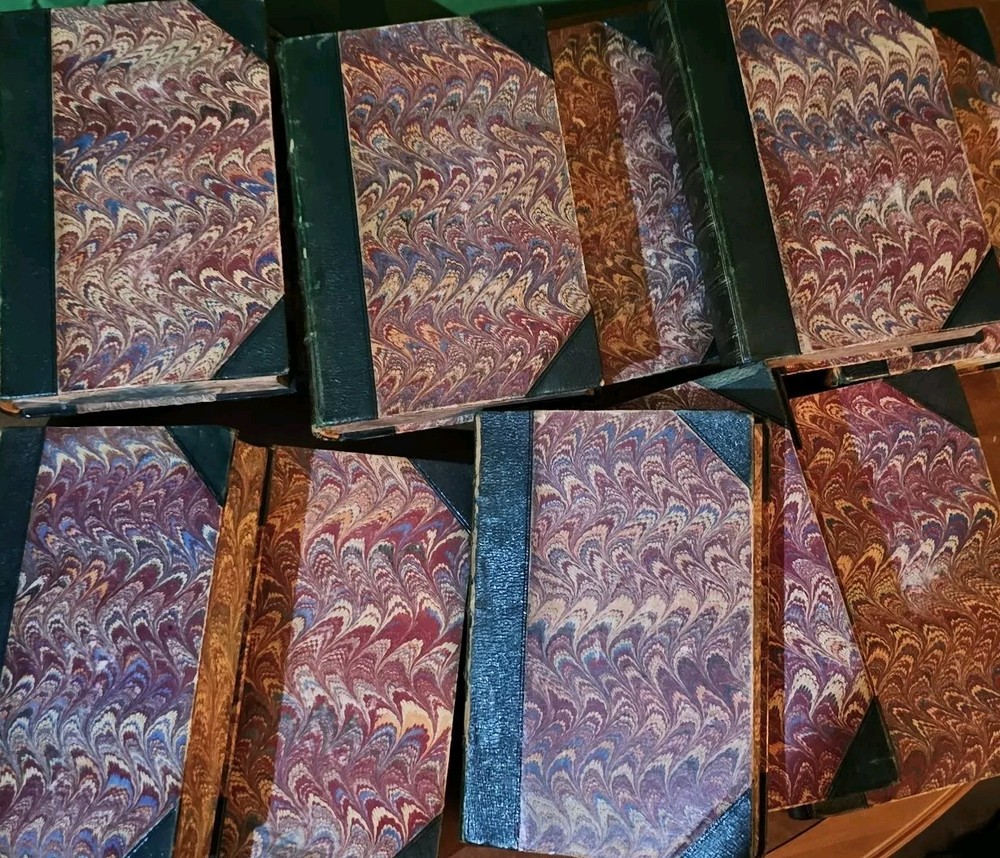 1880 leatherbound set Missing volume 4 All books are in excellent condition given their age. Some foxing Tagged on inside front cover. Some pencil notes on the cover pages Floral pattern on the outer pages. Bound in leather. I can provide more info or photos of necessary