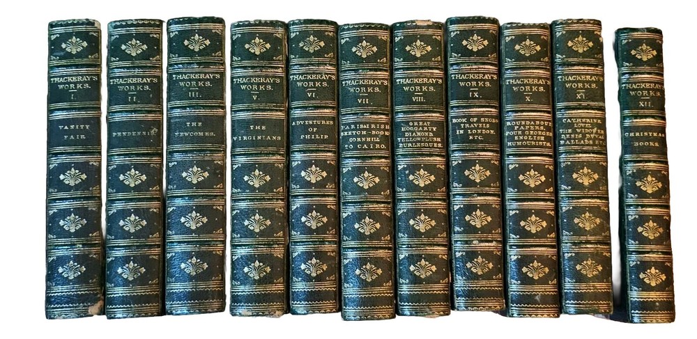 This antique leatherbound set of Thackeray's works is a stunning collector's piece! Despite missing volume 4, the remaining 11 books are in remarkable condition for their age—gorgeous floral-patterned edges and sturdy leather binding. Light foxing and a few pencil notes add charming character. A rare treasure for literature lovers! Happy to share more details or photos.