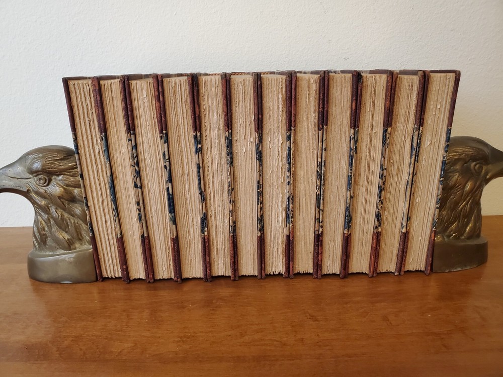 Up for sale is a very scarce complete 12 volume set of the “Works of Eugene Fields” as published by Charles Scribner’s & Sons, 1904-1905. I'm selling them for the owner, who just wants to find them a good home so the set is priced very low.... CONDITION & DETAILS : This set is in overall Very Good condition but it is quite fragile and should be handled lightly and with care. In particular, the front cover of volume seven has started and is slightly loose, but still attached. It could benefit from perhaps some adhesive or supporting archival tape. There is some slight flaking of the leather to the spine edges of a few volumes here and there, but otherwise solid and still tight copies. Additionally, there are a few pages in a couple volumes, which apparently were uncut when published and the original owner tried to separate them causing a few small chips or tears to the paper as shown in photo #10. Otherwise super clean internally and a very nice and rare set! This is our 18 th year selling on eBay with a 100% satisfaction rating, so buy with confidence! Check our eBay Store for many more Easton Press editions , Franklin Library and other collectible books. SHIPPING: U.S. mainland buyers ONLY. We ship all items well packed in a box with tracking, via U.S.P.S. Media Mail, FREE of charge! A signature will be required on delivery .