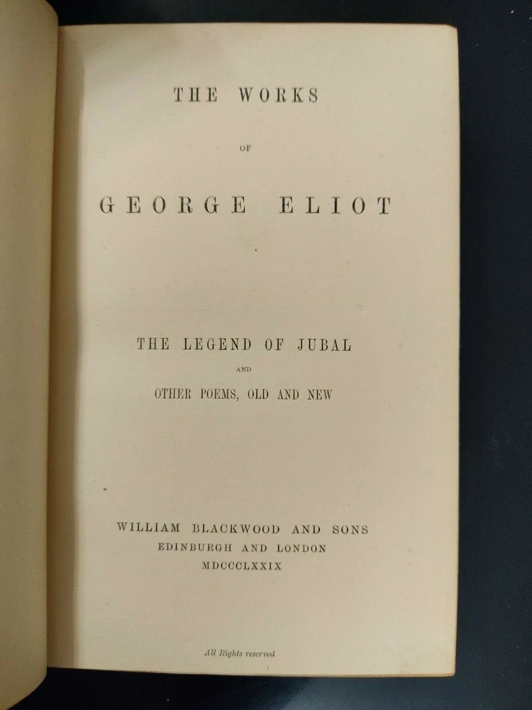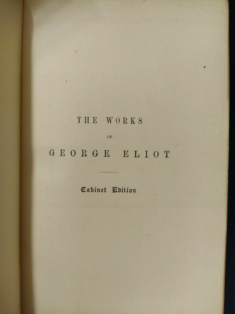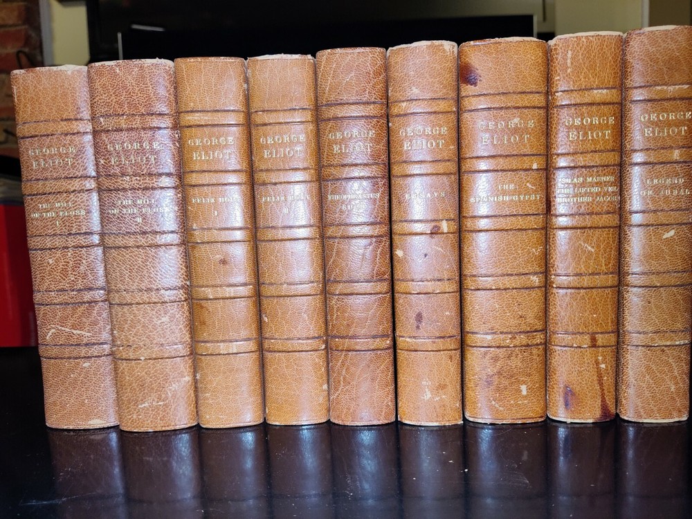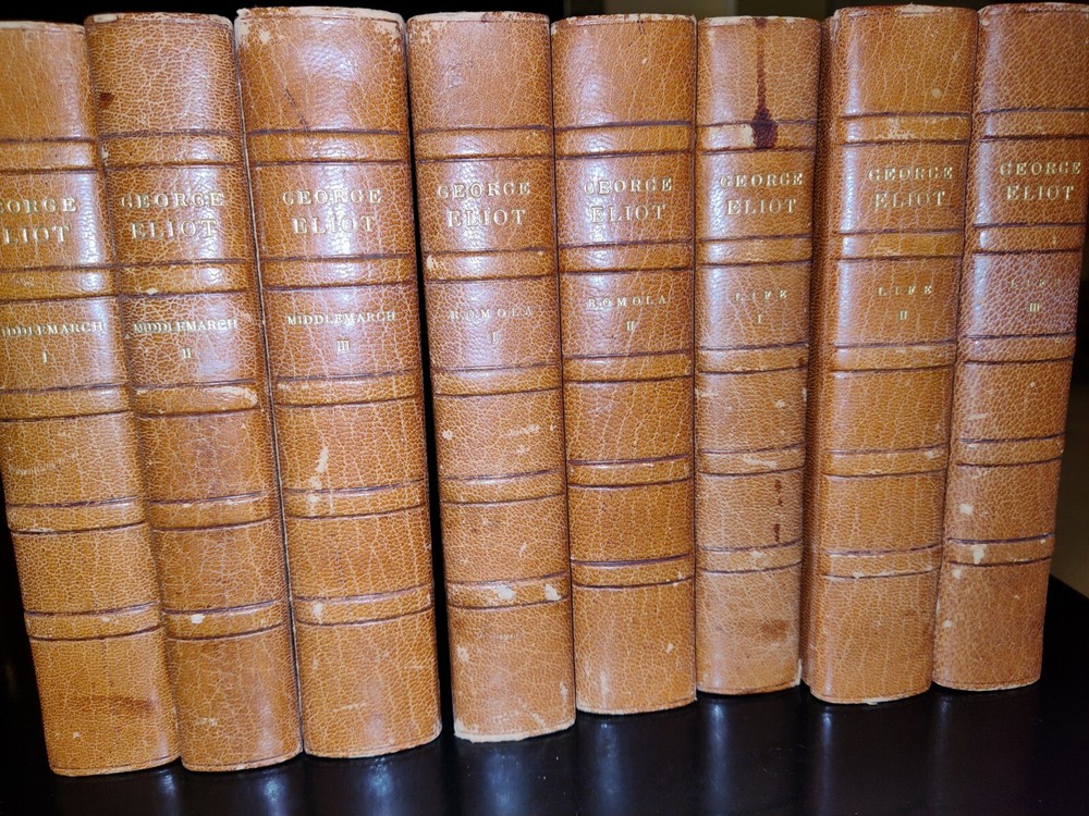 This auction is for a full COMPLETE 24-volume set of "The Works of George Eliot" published in 1878 and 1879 by William Blackwood and Sons. Cabinet Edition. Each volume is 6 3/4" by 4 3/4" (aprroximately), bound by Zaehnsdorf in three quarters levant morocco with marbled boards, spines lettered in gilt, top edges gilt, and feather patterned endpapers. Difficult to find the full 24 volume set complete and uniformly bound, especially in such fine binding as this. 13 works contained in the complete 24 volumes (as some works require multiple volumes): Adam Bede (2 vols) Daniel Deronda (3 vols) Felix Holt (2 vols) Life (3 vols) Middlemarch (3 vols) Romola (2 vols) Scenes of Clerical Life (2 vols) The Mill on the Floss (2 vols) Essays Legend of Jubal Silas Marner, The Lifted Veil and Brother Jacob The Spanish Gypsy Impressions of Theophrastus Such Faults listed above, otherwise clean pages and good binding. Purchased at auction. Feel free to ask any questions. Good luck and thanks for bidding! You can bid with confidence. I have been an eBay member in good standing since the 1990's, and continue to receive terrific feedback both as a buyer and a seller. (B26) If you need more photos of an item please just ask.