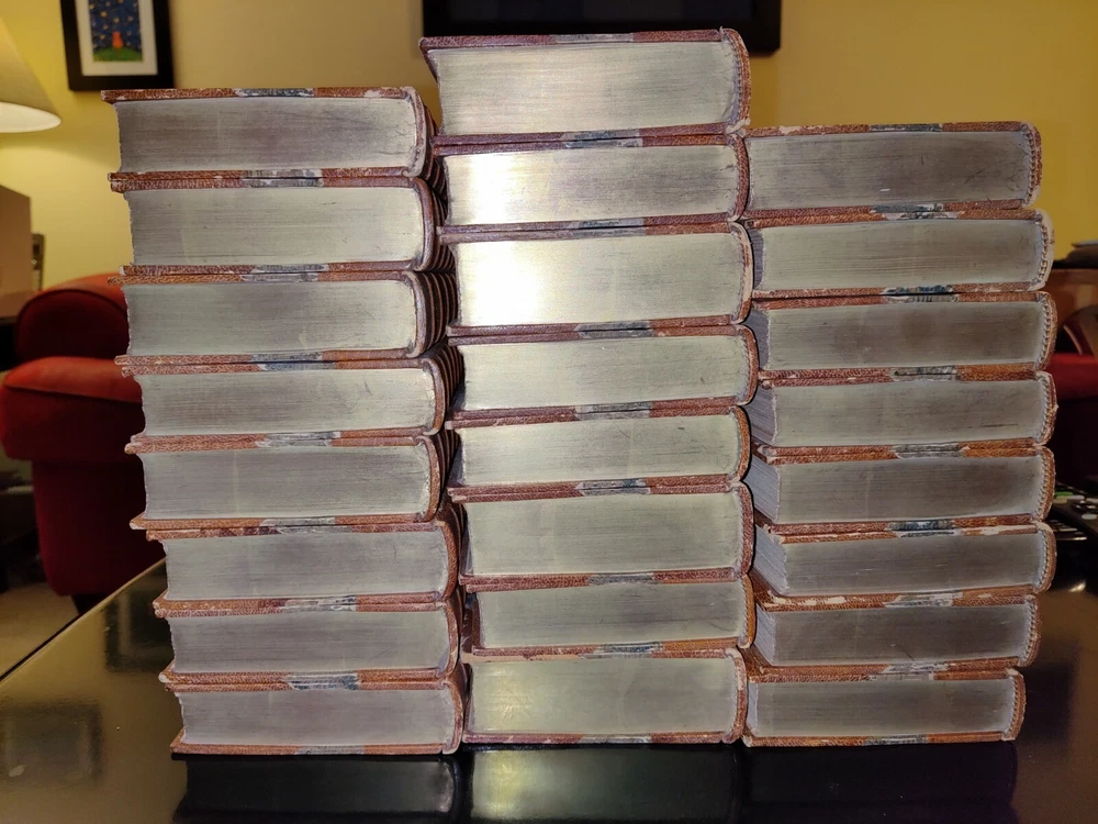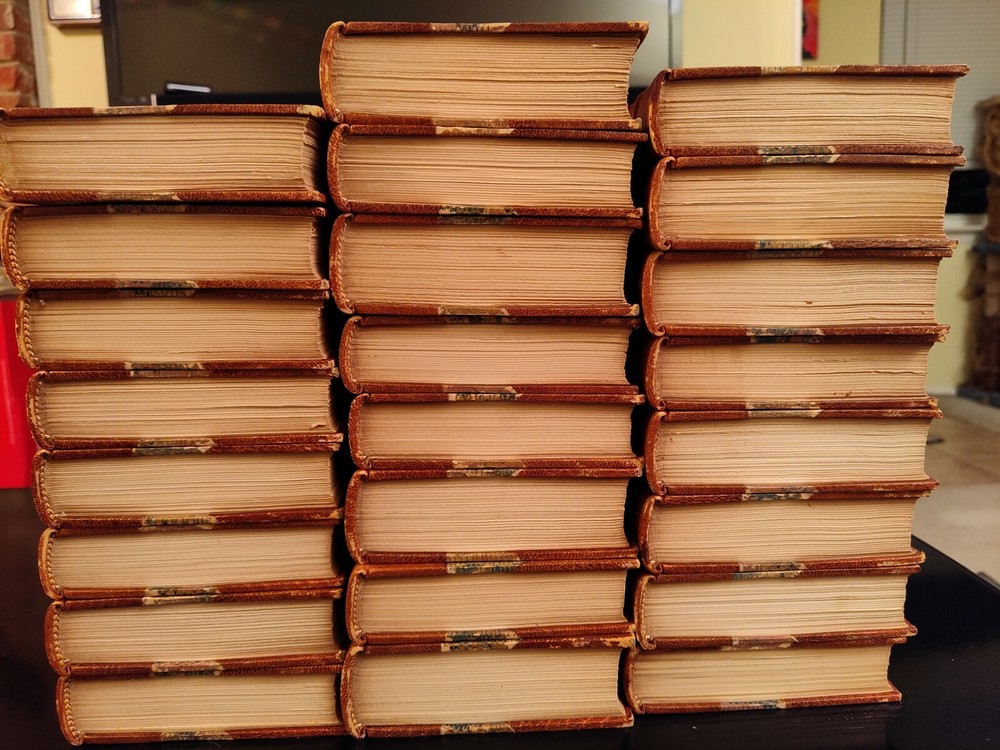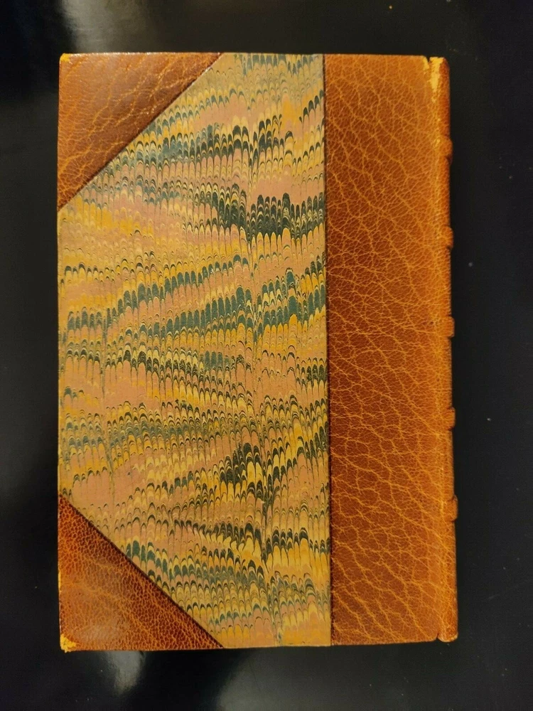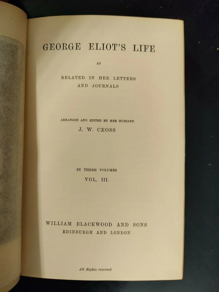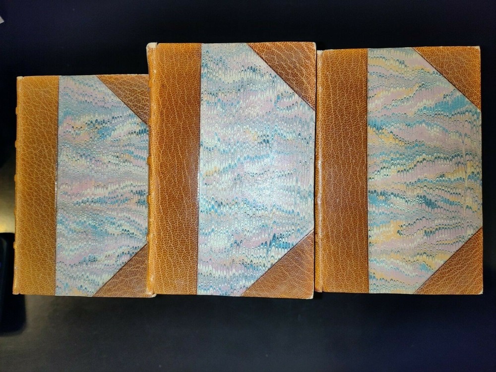This auction is for a full COMPLETE 24-volume set of "The Works of George Eliot" published in 1878 and 1879 by William Blackwood and Sons. Cabinet Edition. Each volume is 6 3/4" by 4 3/4" (aprroximately), bound by Zaehnsdorf in three quarters levant morocco with marbled boards, spines lettered in gilt, top edges gilt, and feather patterned endpapers. Difficult to find the full 24 volume set complete and uniformly bound, especially in such fine binding as this. 13 works contained in the complete 24 volumes (as some works require multiple volumes): Adam Bede (2 vols) Daniel Deronda (3 vols) Felix Holt (2 vols) Life (3 vols) Middlemarch (3 vols) Romola (2 vols) Scenes of Clerical Life (2 vols) The Mill on the Floss (2 vols) Essays Legend of Jubal Silas Marner, The Lifted Veil and Brother Jacob The Spanish Gypsy Impressions of Theophrastus Such Faults listed above, otherwise clean pages and good binding. Purchased at auction. Feel free to ask any questions. Good luck and thanks for bidding! You can bid with confidence. I have been an eBay member in good standing since the 1990's, and continue to receive terrific feedback both as a buyer and a seller. (B26) If you need more photos of an item please just ask.