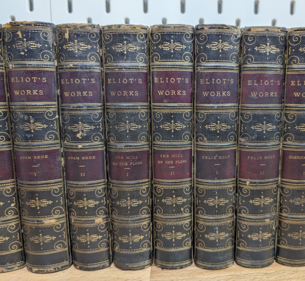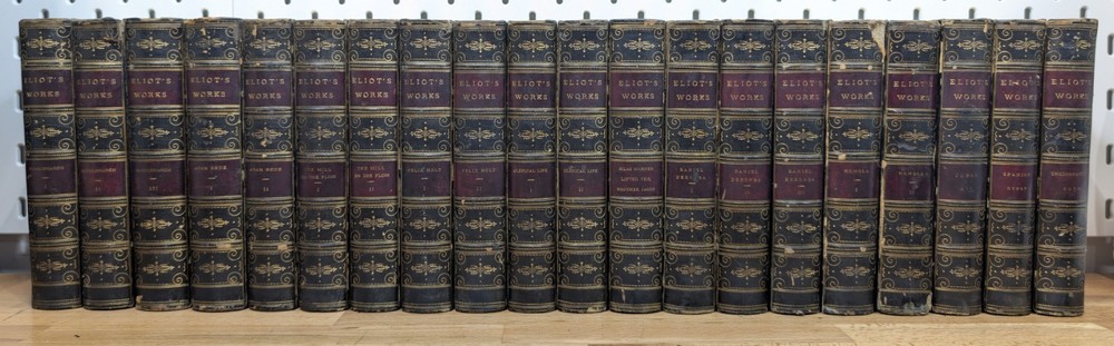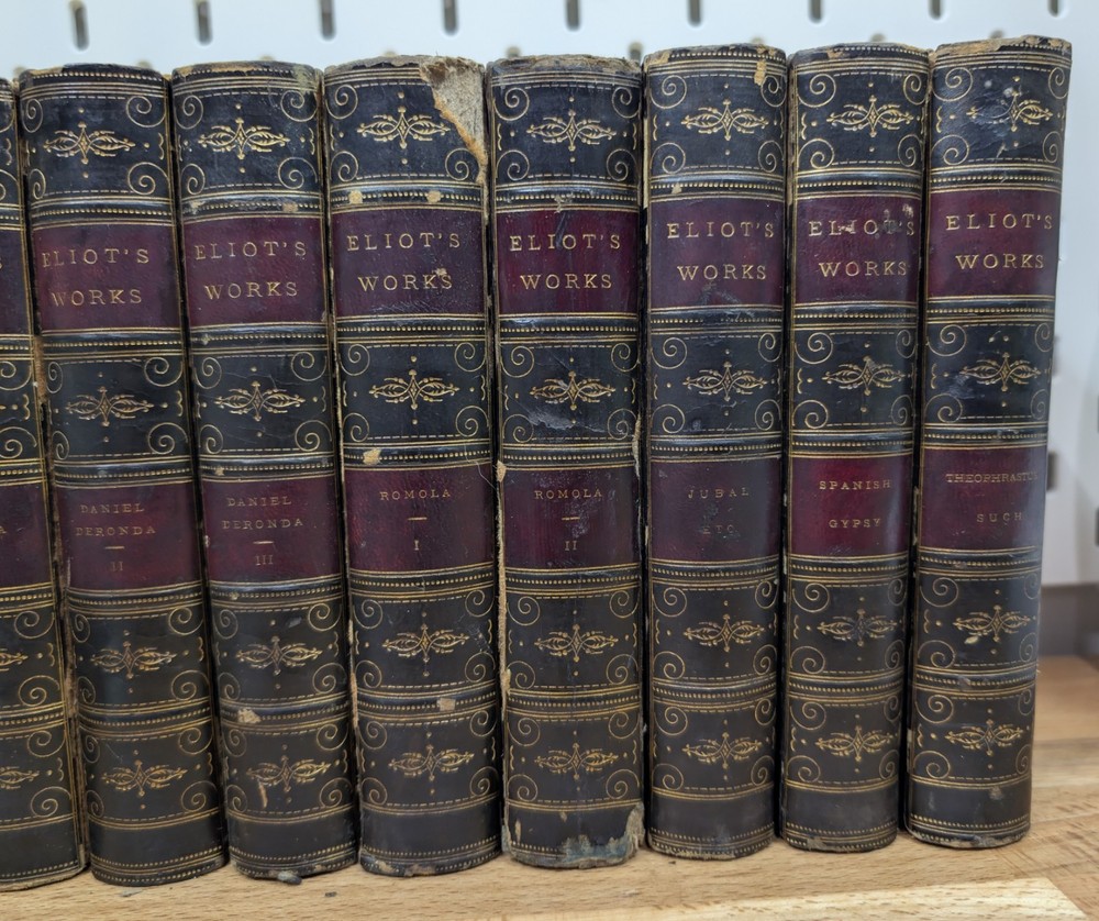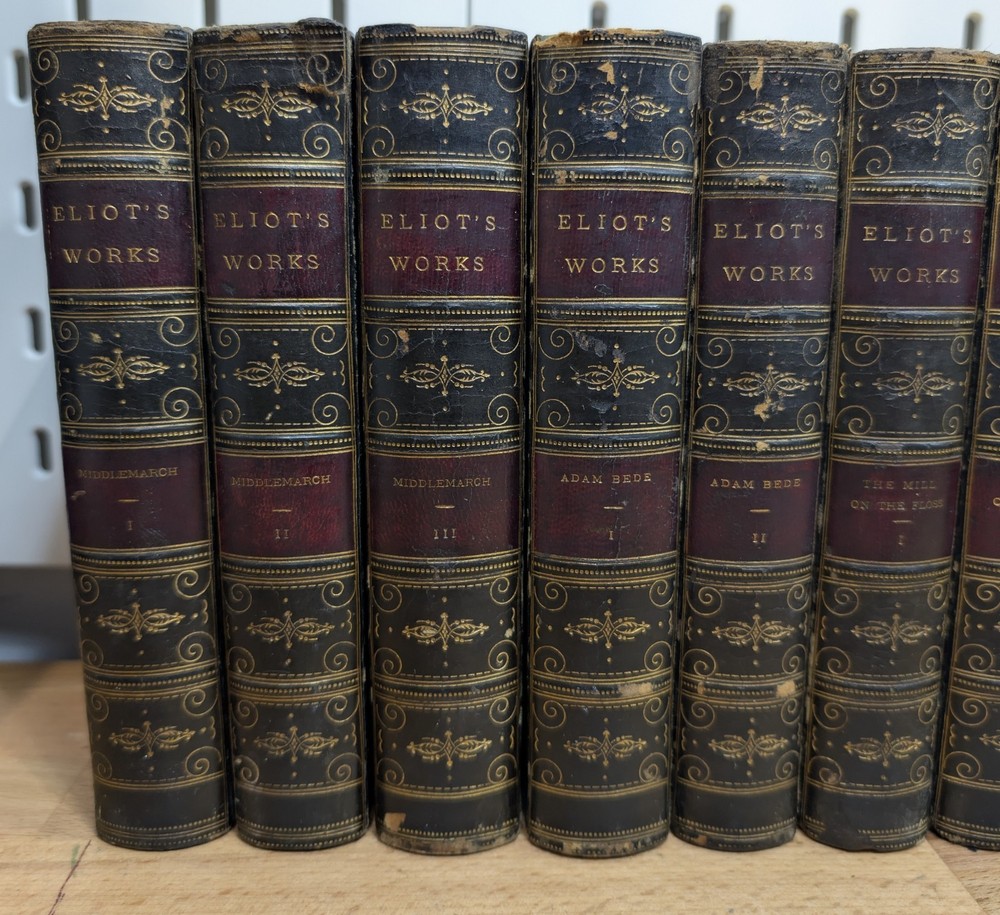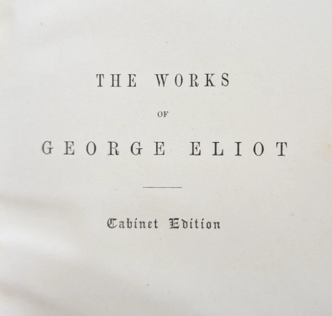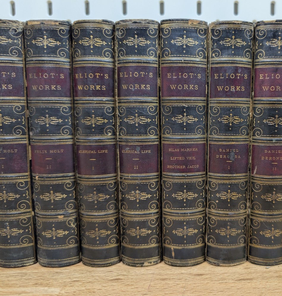 The Works of George Eliot. Cabinet Edition. William Blackwood and Sons. Edinburgh and London. No publication date, but likely published circa the 1880s. Books are 7 inches tall by 5 inches wide. A very handsome set in clean condition. The Cabinet edition was first published by William Blackwood and Sons in 1878. From the George Eliot Archive: "This complete collection, published two years before Eliot's death, represents the final corrected version of her works. Many subsequent editions have been published, with the Cabinet Edition as their foundation, which continues to be the scholarly standard for citing Eliot’s words." Half leather bindings with red marbled paper to front and rear boards. Raised bands and gilt stamping to spines. Matching red marbled endpapers. Top edges gilt. Leather is smooth and clean. Most volumes have wear/chipping along the edges and corners. Two volumes have detached front boards: Romola Vol. II and Daniel Deronda Vol. I (see last two pictures). Romola Vol. I has a large chip to the top of the spine. Some spots/foxing to page edges. A couple pages have tears/chips. Some heavy foxing to several endpapers. Pages are very clean overall, with several names or small notes pencilled inside the fronts of a couple volumes. Bindings are pretty firm. Check out my other books, movies, electronics, and other items for sale .