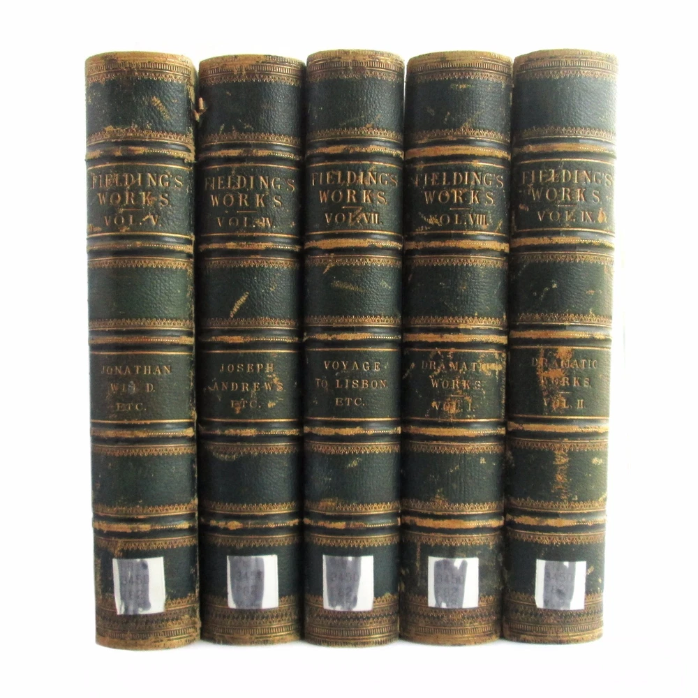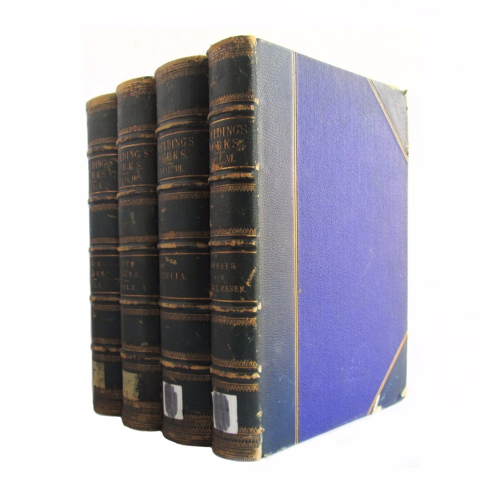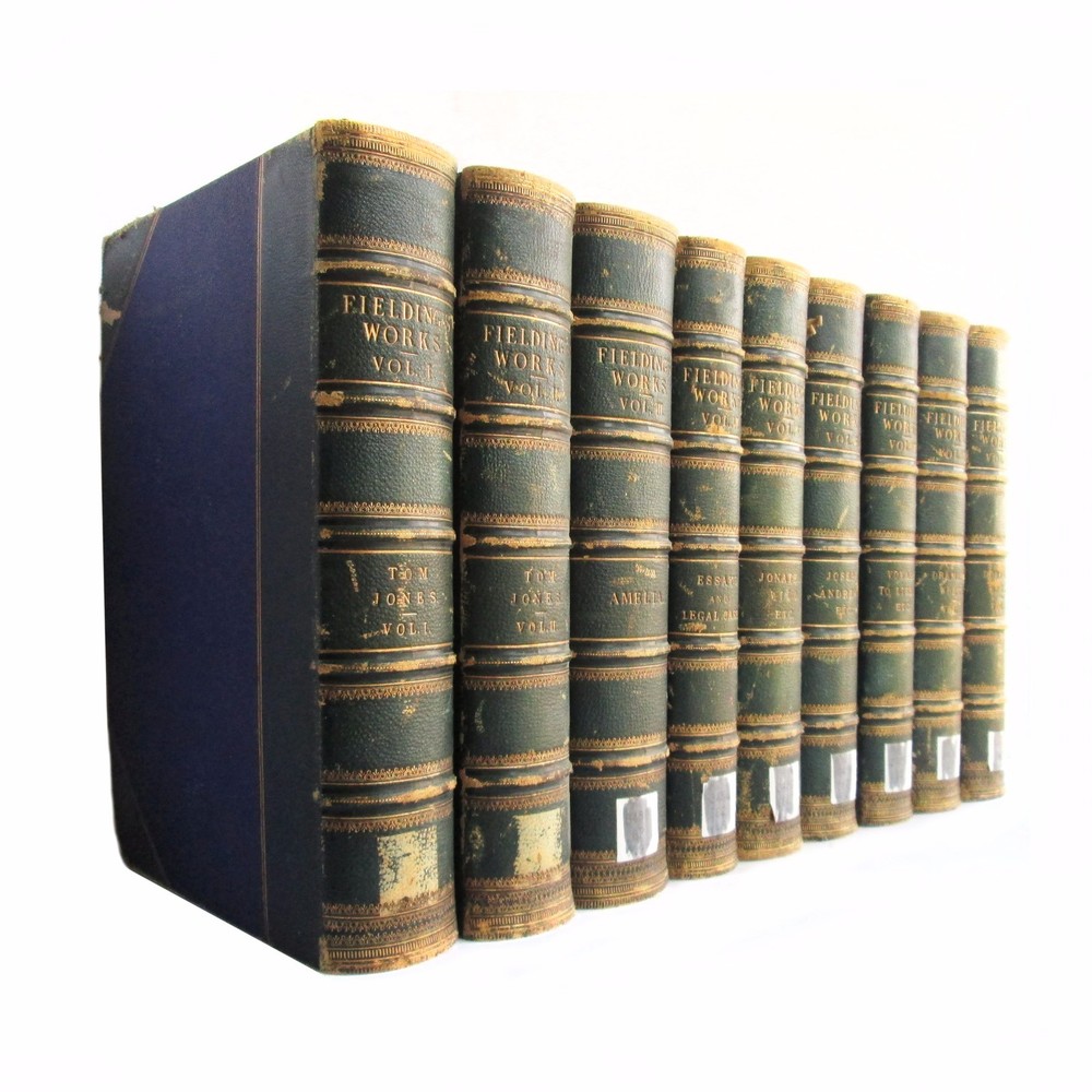 This antique hardcover set of Fielding is bound in royal-blue cloth boards with dark blue leather spines and corners. Spines have five raised bands trimmed in gilt, with gilt decoration and lettering. This is a complete, 10-volume set containing the works of Henry Fielding. It is an ex-library copy., with typical library markings: spine labels, stamps, etc. Spines have some wear, there is some cover soil, stamps within, etc., but most inner page are clean, bindings are tight. This is a limited edition, numbered #240 of 250. Each volume is approx., 500 pages, 7"x9" THE WORKS OF HENRY FIELDING ESQ. Smith, Elder & Co., 1882 Limited, Numbered Edition: #240 of 250