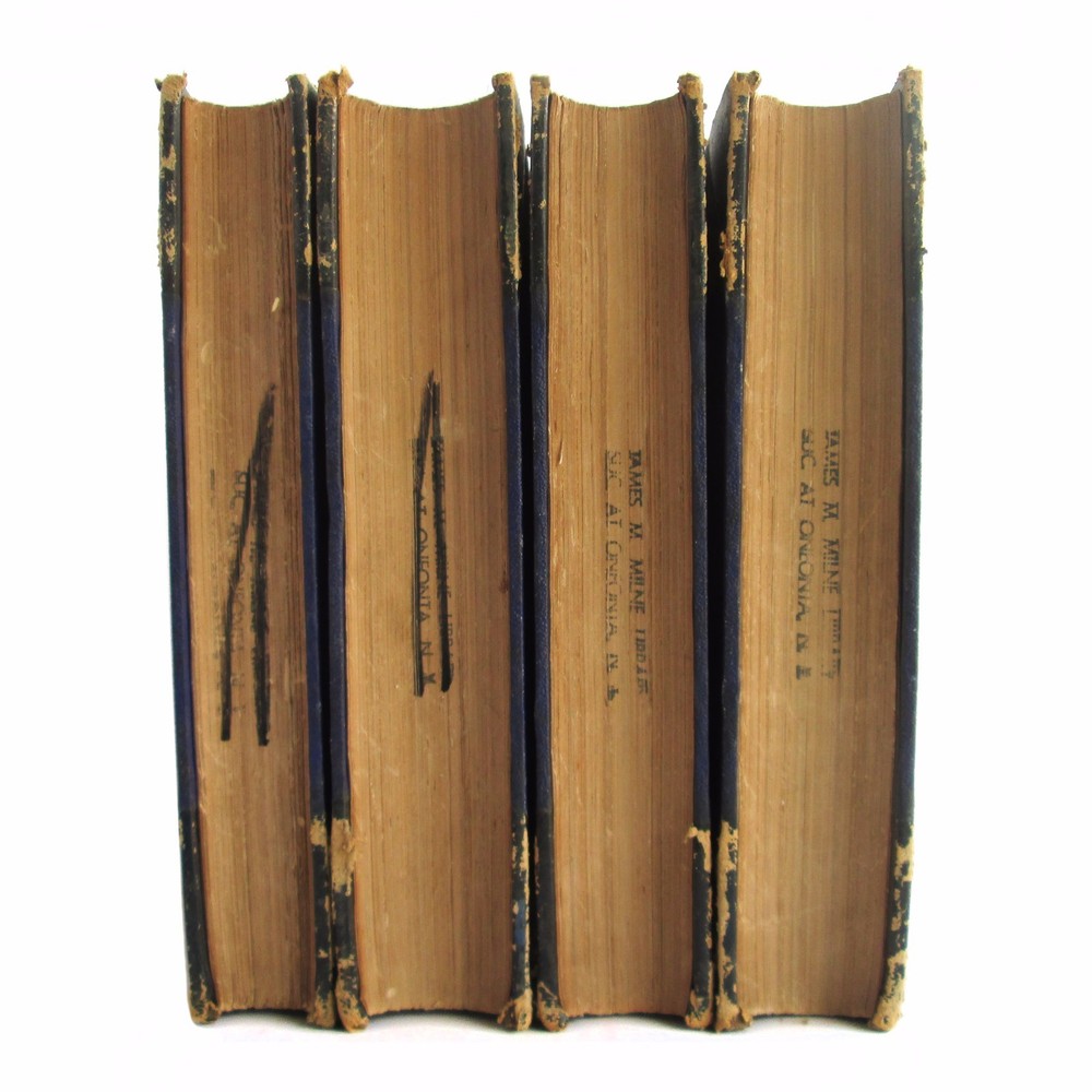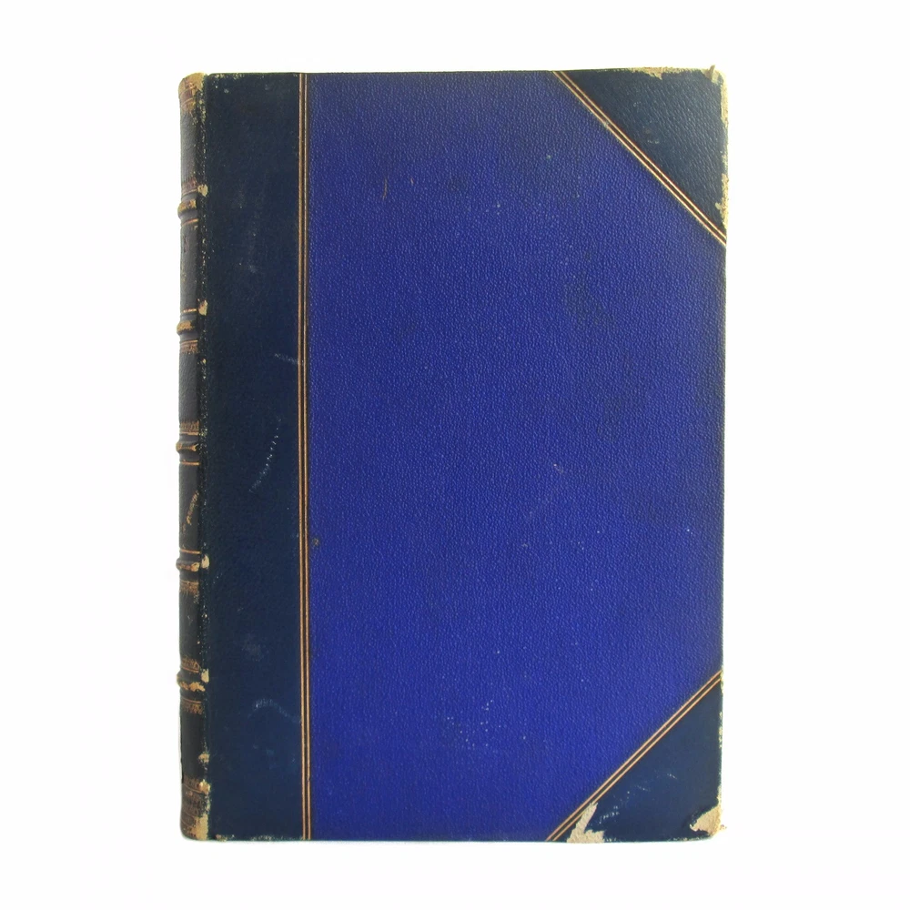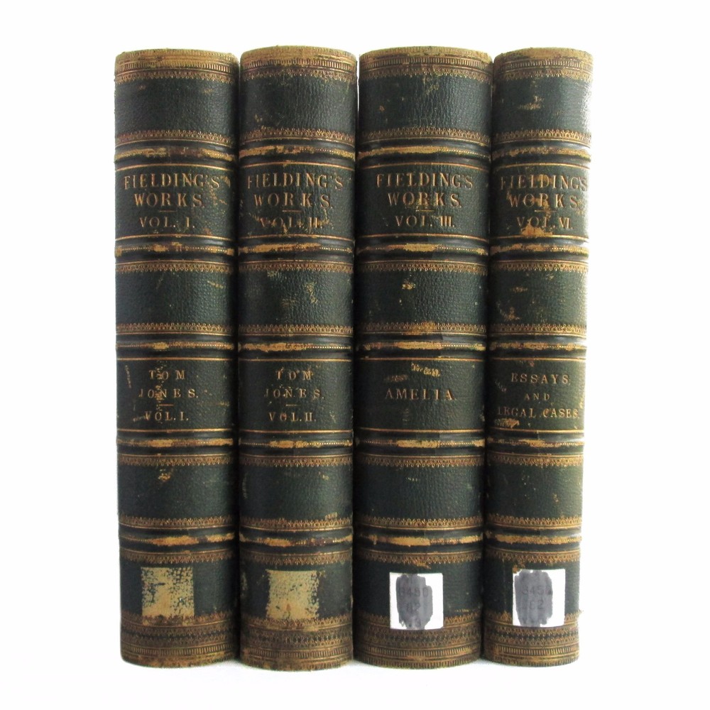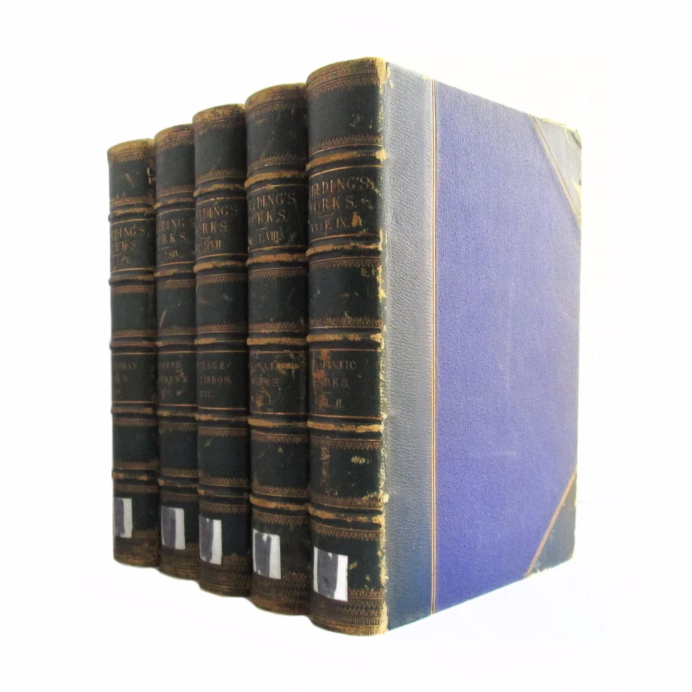 This antique hardcover set of Fielding is bound in royal-blue cloth boards with dark blue leather spines and corners. Spines have five raised bands trimmed in gilt, with gilt decoration and lettering. This is a complete, 10-volume set containing the works of Henry Fielding. It is an ex-library copy., with typical library markings: spine labels, stamps, etc. Spines have some wear, there is some cover soil, stamps within, etc., but most inner page are clean, bindings are tight. This is a limited edition, numbered #240 of 250. Each volume is approx., 500 pages, 7"x9" THE WORKS OF HENRY FIELDING ESQ. Smith, Elder & Co., 1882 Limited, Numbered Edition: #240 of 250