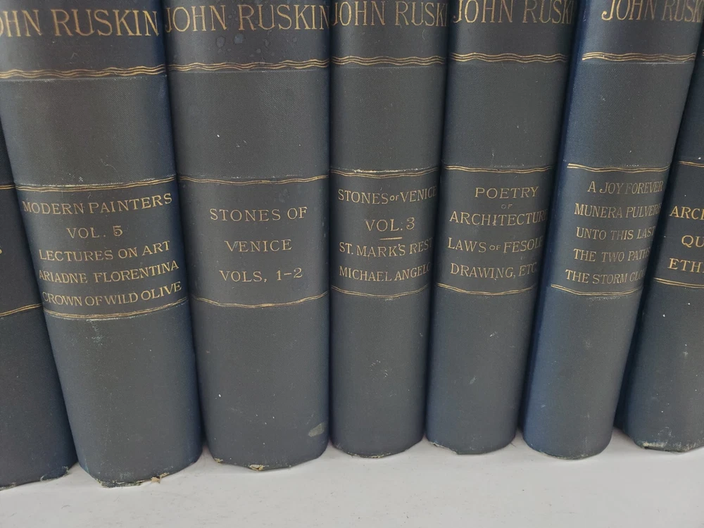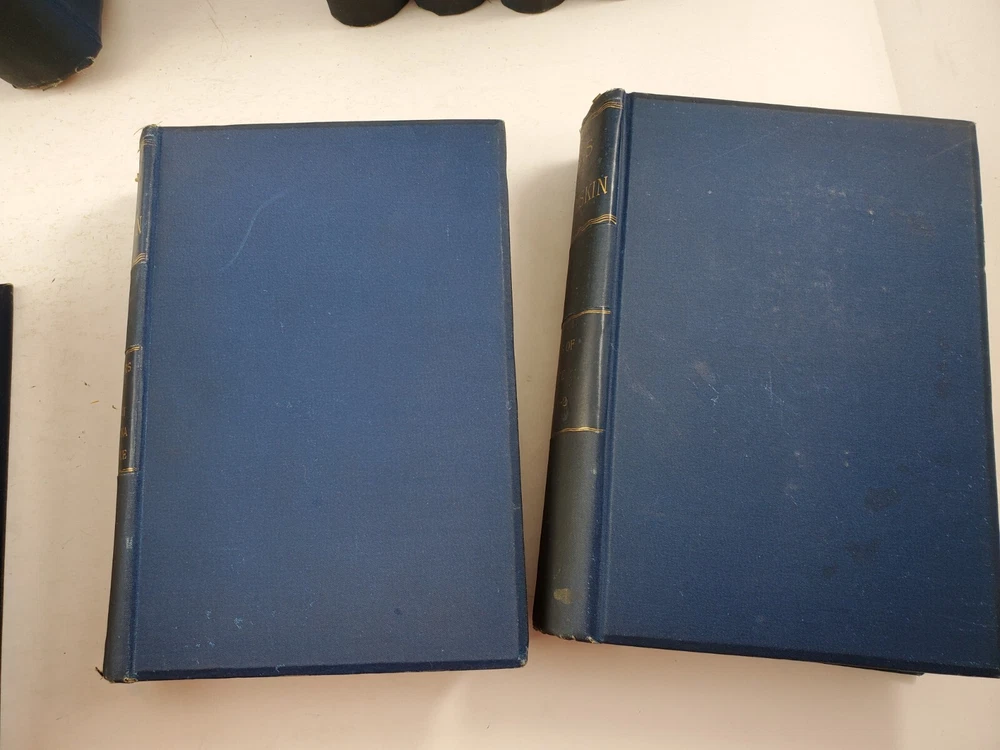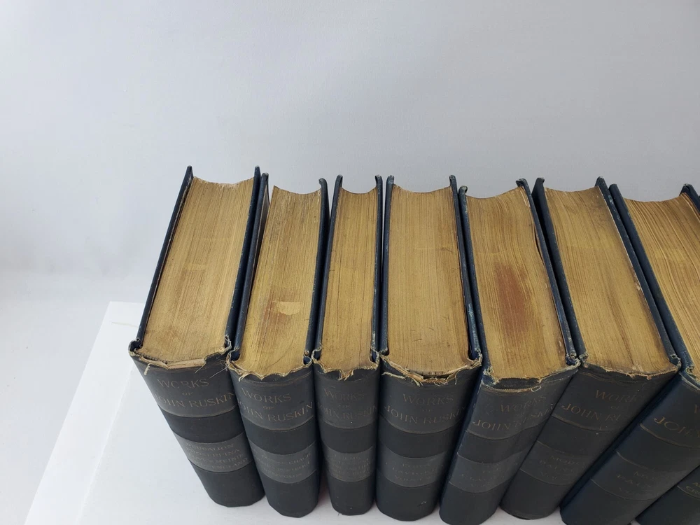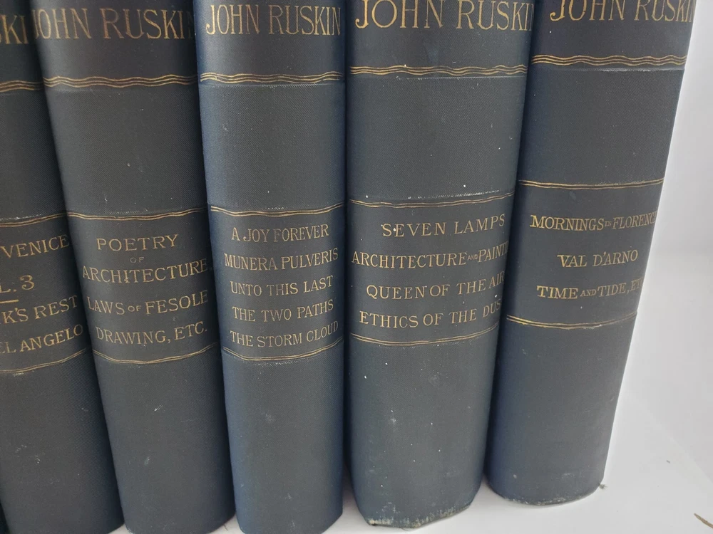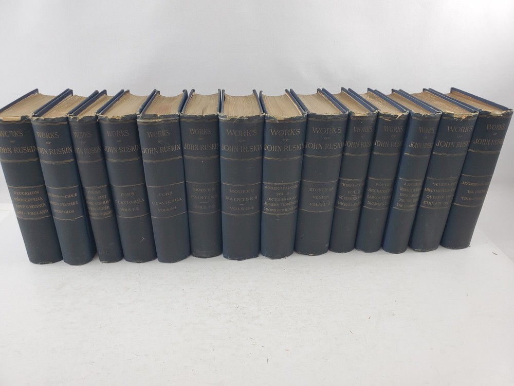 The Works of John Ruskin 14 Volumes 1885 Hardcover Set Lot See pictures for titles. Pages are very good some tanning, no writing noted. Spines have some fading. One has a cracked hinge.