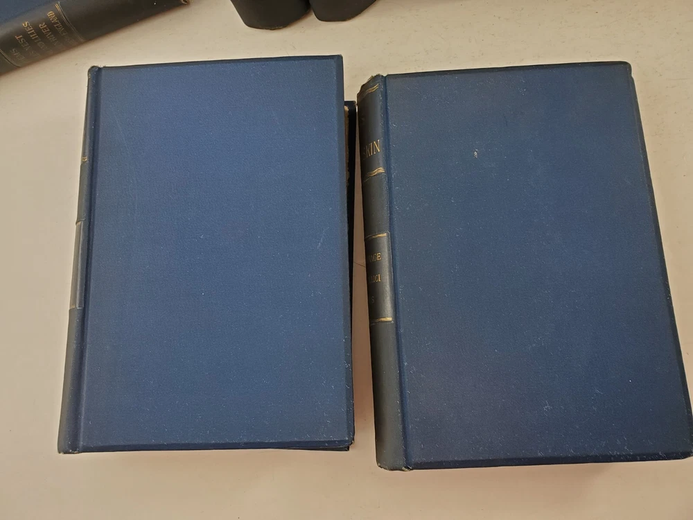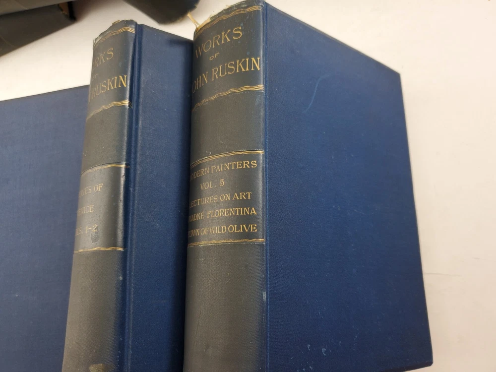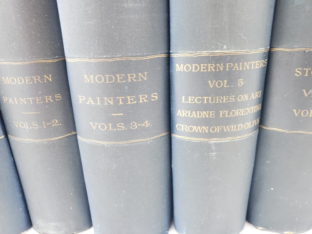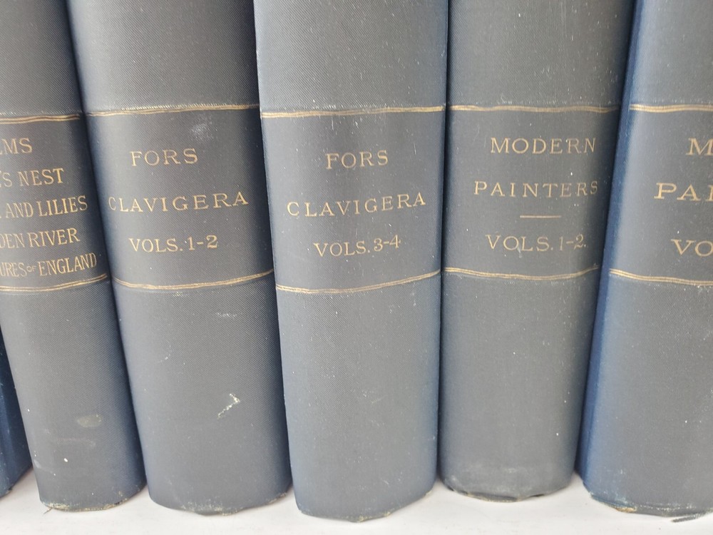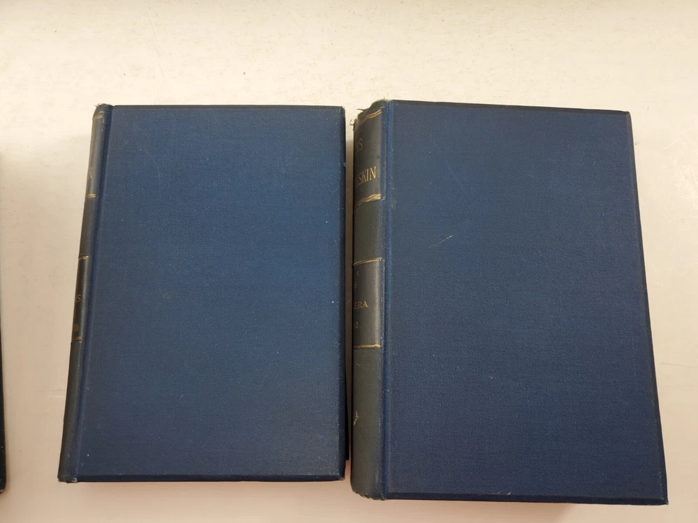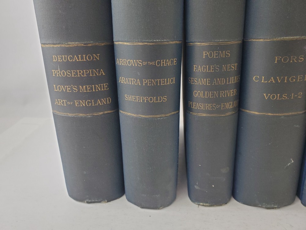 The Works of John Ruskin 14 Volumes 1885 Hardcover Set Lot See pictures for titles. Pages are very good some tanning, no writing noted. Spines have some fading. One has a cracked hinge.