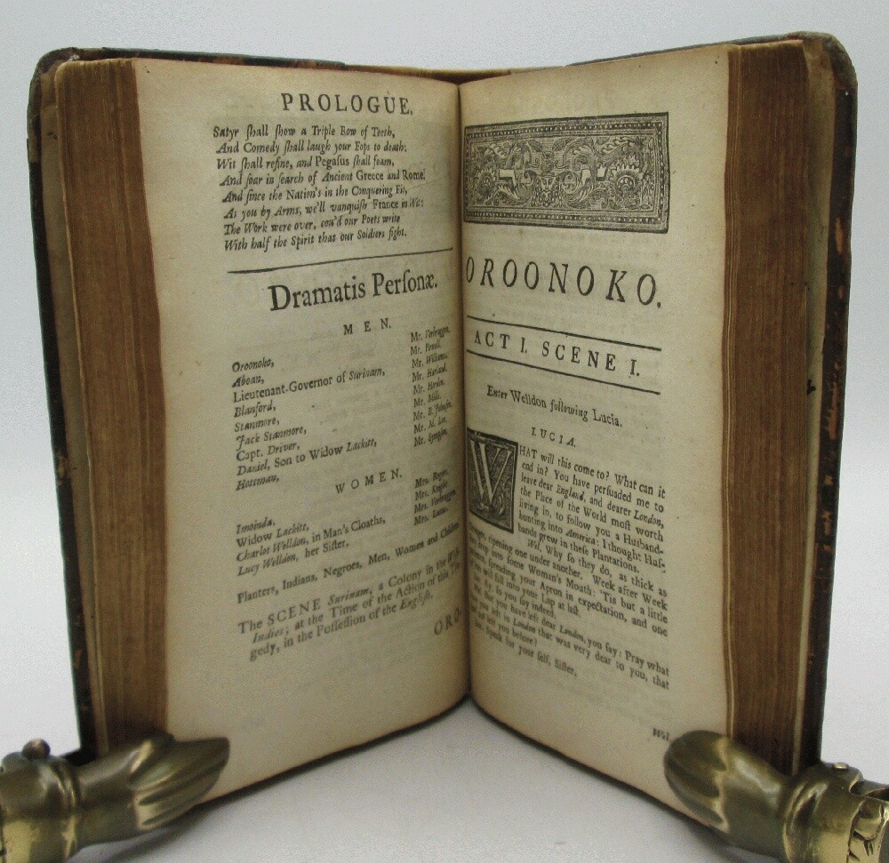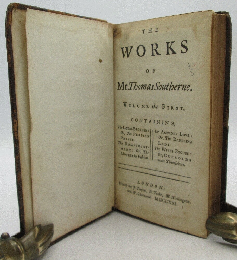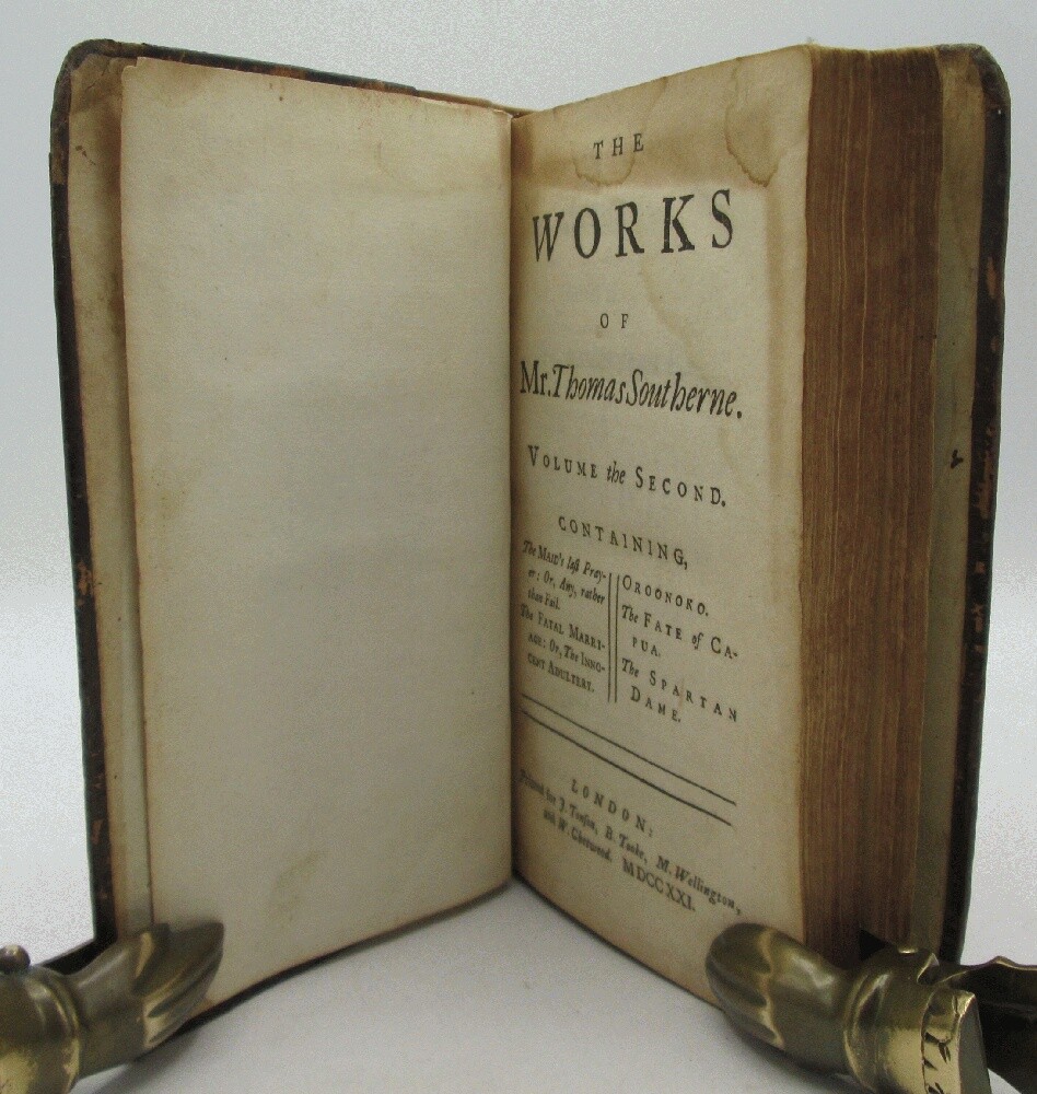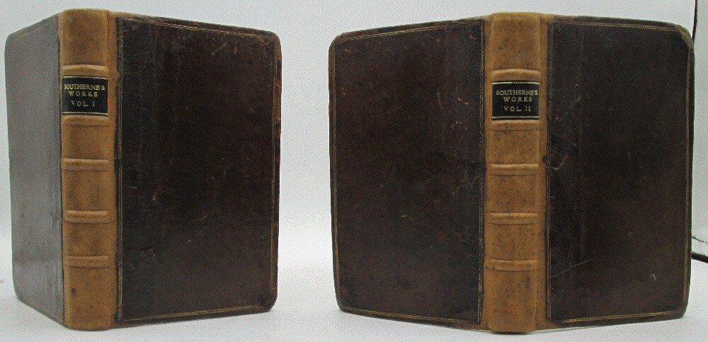 Ivy Ridge Books presents ... The Works of Mr. Thomas Southerne (2 Volume Set) Author: Thomas Southerne Publisher: J. Tonson, B. Tooke, M. Wellington, and W. Chetwood Release Date: 1721 Seller Category: Drama & Theater Qty Available: 1 Condition: Collectible: Very Good Sku: 10629 Notes: Re-backed set of plays includes Oroonoko, adapted from the novel by Aphra Behn (1688). This play tells the story of an African prince sold into slavery. Behn is considered the first female novelist, her novel one of the first published in English. New spines of lighter brown leather and black leather spine labels, boards are the original leather boards with corners rounded by wear. Some tanning and light stains in interior, armorial bookplates in both volumes of Thomas Merriman. Don't forget to check out other great deals in our eBay Store!!