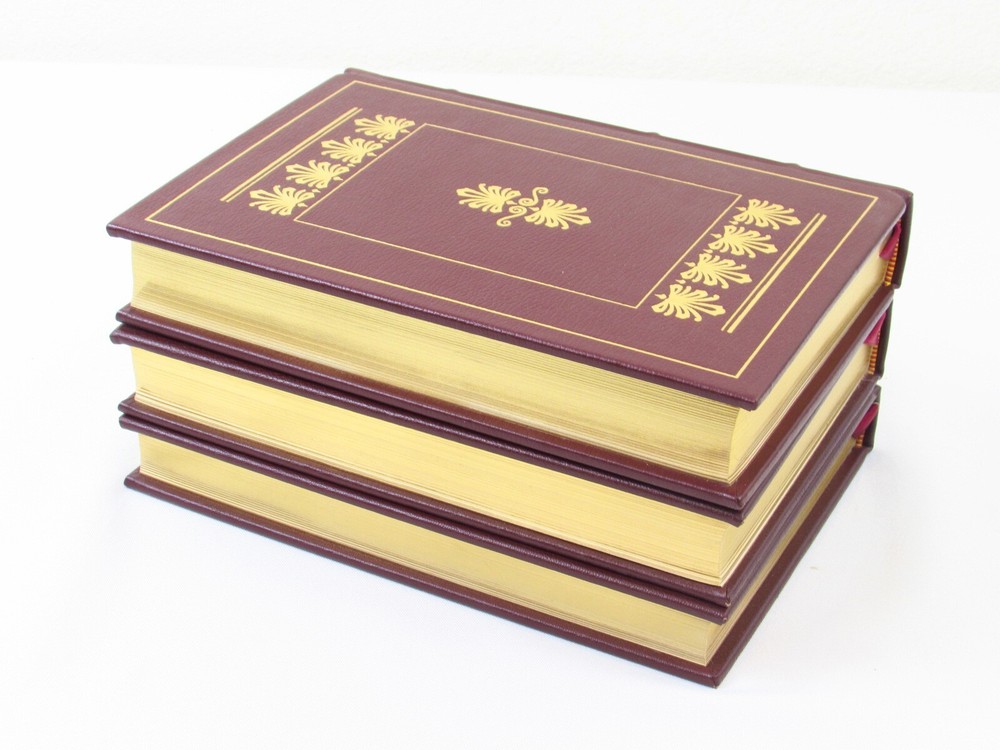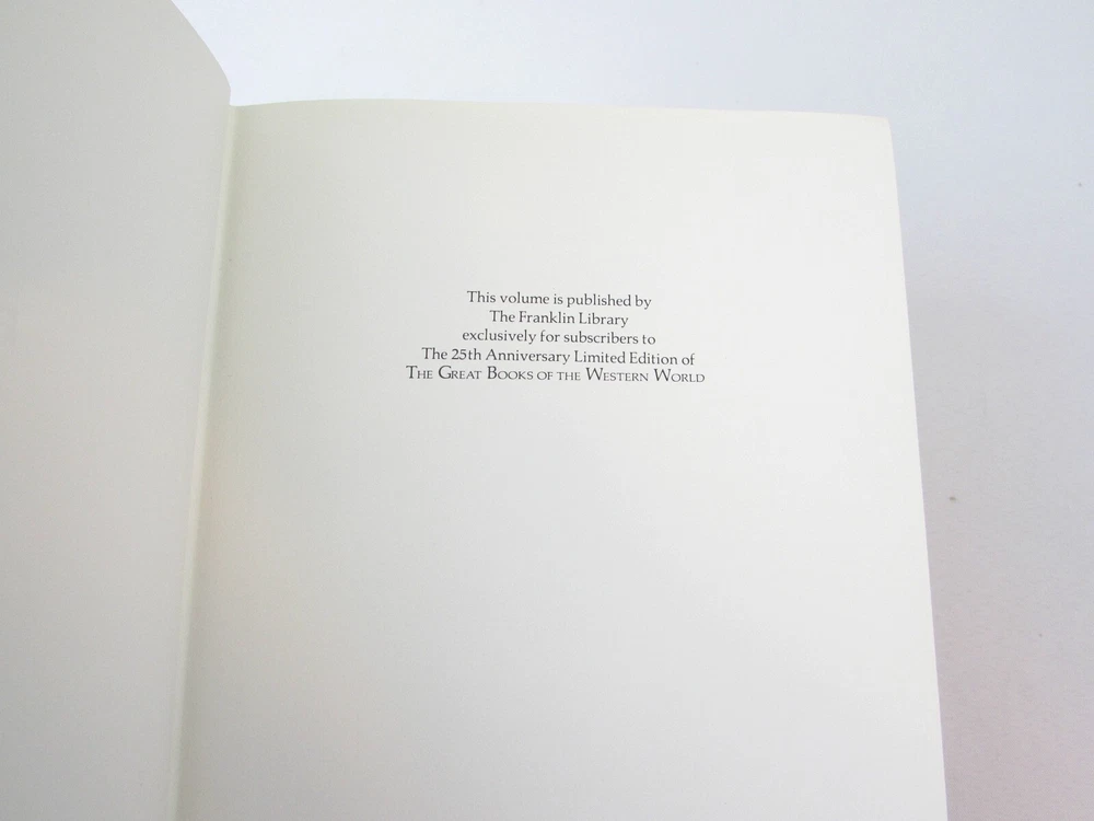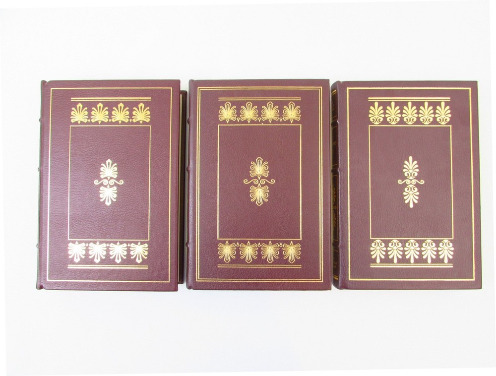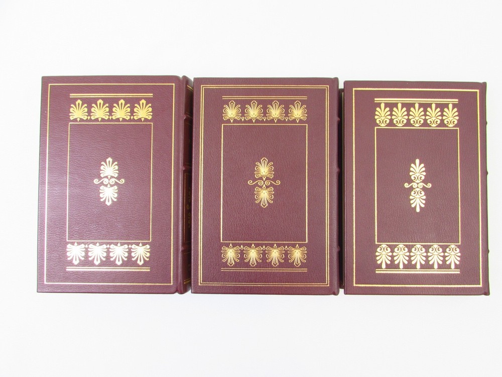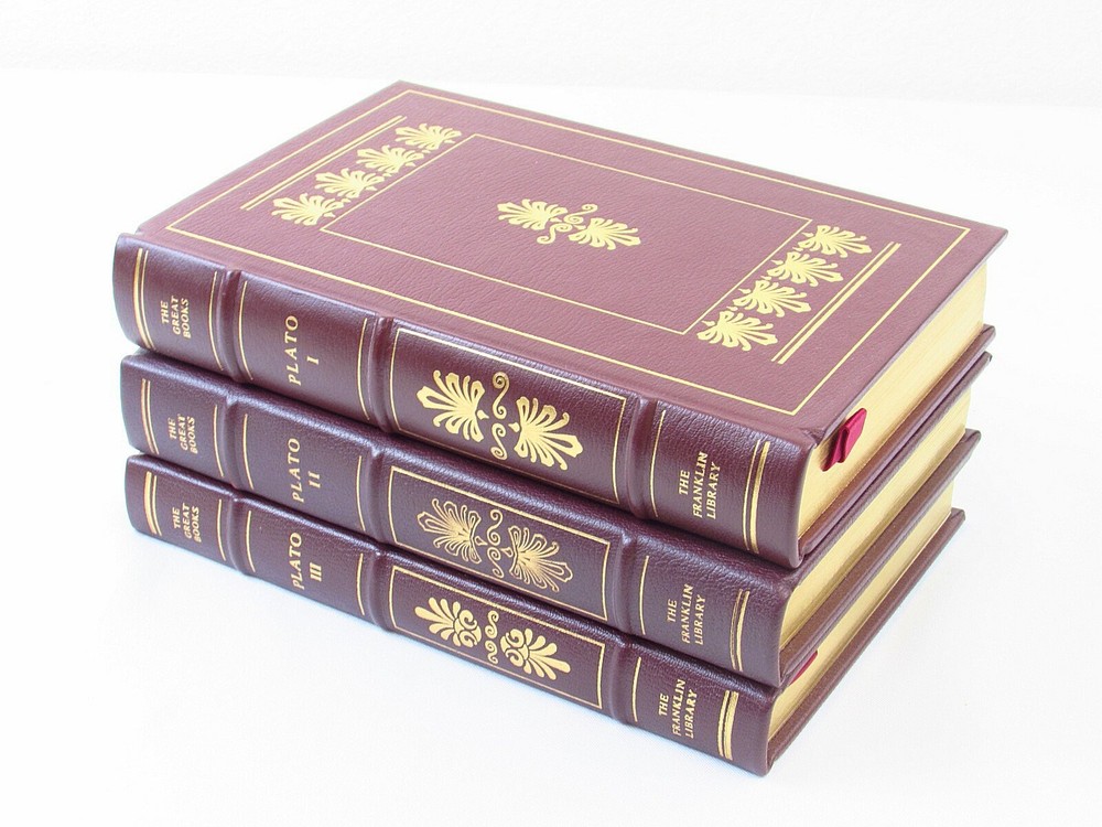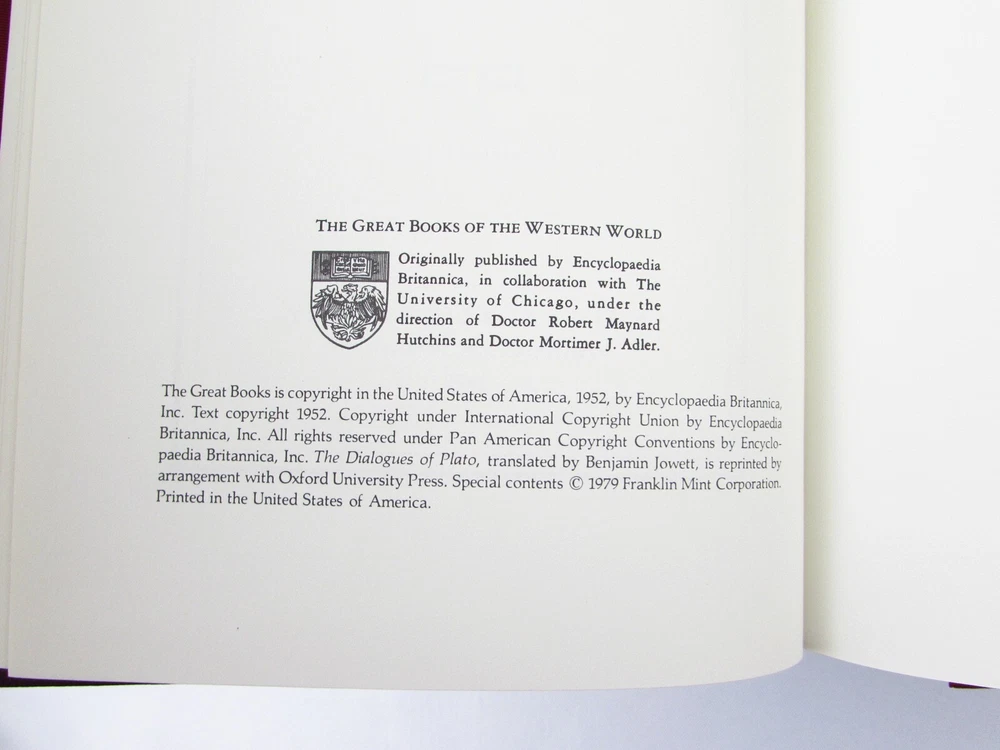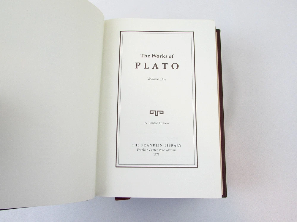 ______________________________________________________________________________________________ The Works of Plato (3-Volume Set) - Published by the Franklin Library - Copyright 1979 - Hardcovers (genuine leather over boards) - Gilt lettering and decoration - Gilt edges - Marker ribbon These volumes are part of the Franklin Library 25th Anniversary Limited Edition of "The Great Books of the Western World." *Very* faint tobacco smoke odor from former owner, fairly negligible in my opinion, but I still like to make note for those who might be sensitive. Otherwise clean/unmarked and in excellent, virtually as-new condition. See photos FREE Standard Shipping via USPS Media Mail Expedited and International shipping available Please let me know if you have any questions and I'll be glad to help