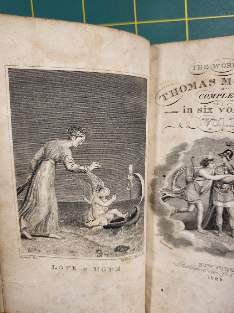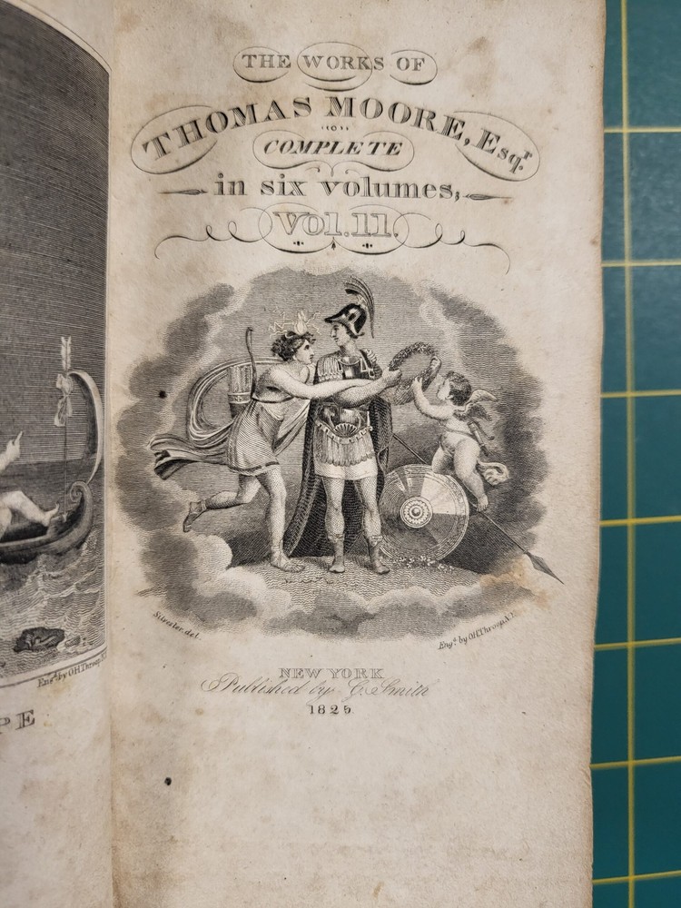 HGG Books presents ... The Works of Thomas Moore volume II of six volume set engravings Author: Thomas Moore Publisher: G Smith Release Date: 1825 Seller Category: Poetry Qty Available: 1 Condition: Collectible: Good Sku: thomasmooresmith Notes: The Complete Works of Thomas Moore, volume II of six volume set published in NY 1825. First American Edition with two front space engravings. This volume contains Epistles, Odes, and other Poems.Pages show light scattered foxing, binding tight to text block, front hinge weak and shows cracking to leather board, leather supple with bumping to edges and corners, spine bright Don't forget to check out other great deals in our eBay Store!!