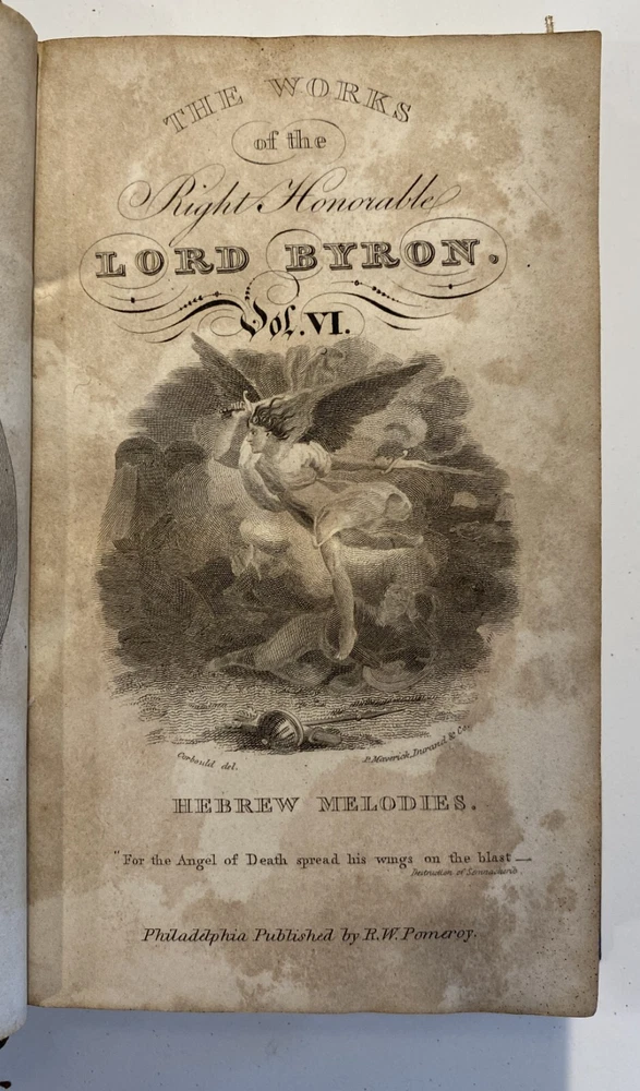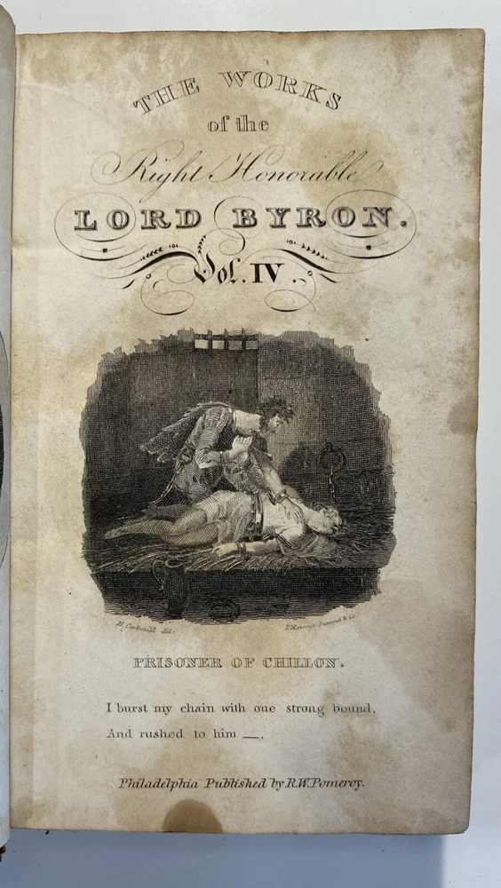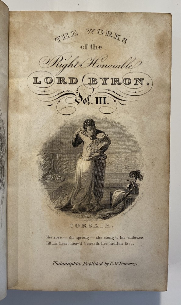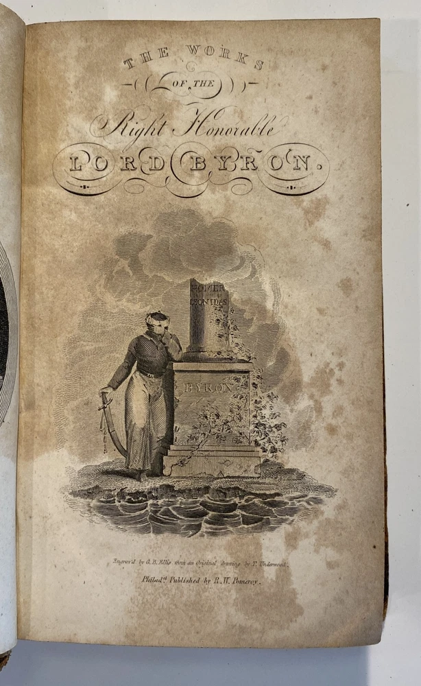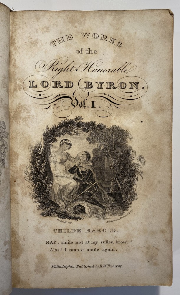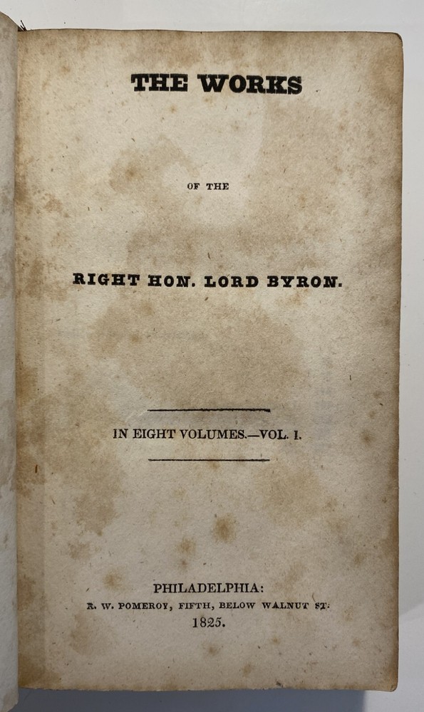 Title: The Works of the Right Hon. Lord Byron. In Eight Volumes. Author: Lord Byron Publisher: R.W. Pomeroy, Philadelphia, Fifth, Below Walnut St. Year: 1825 Details: In eight volumes. Contemporary leather boards with gilt rules to covers and gilt title and decorations to spine. 6 x 3.5 in.