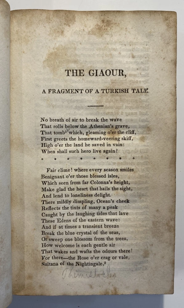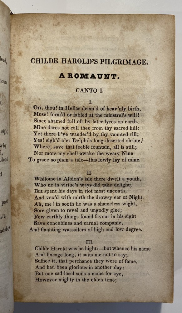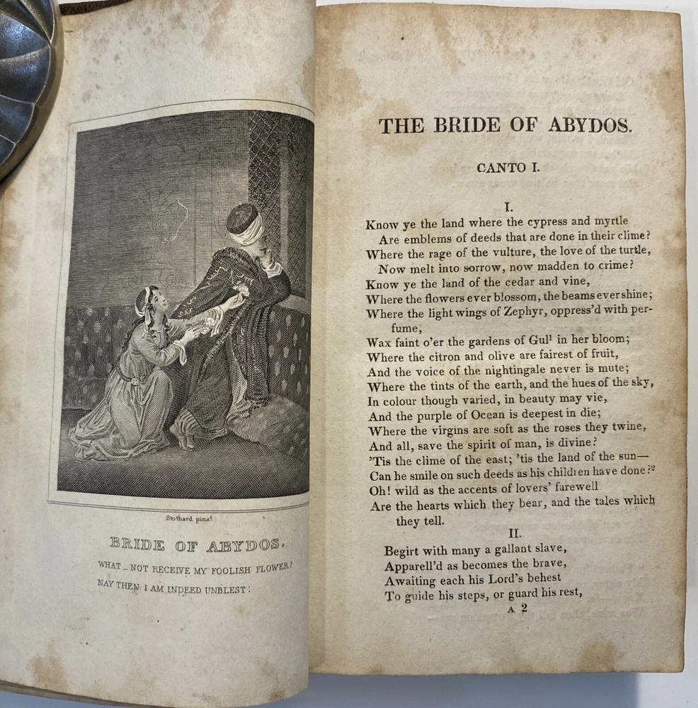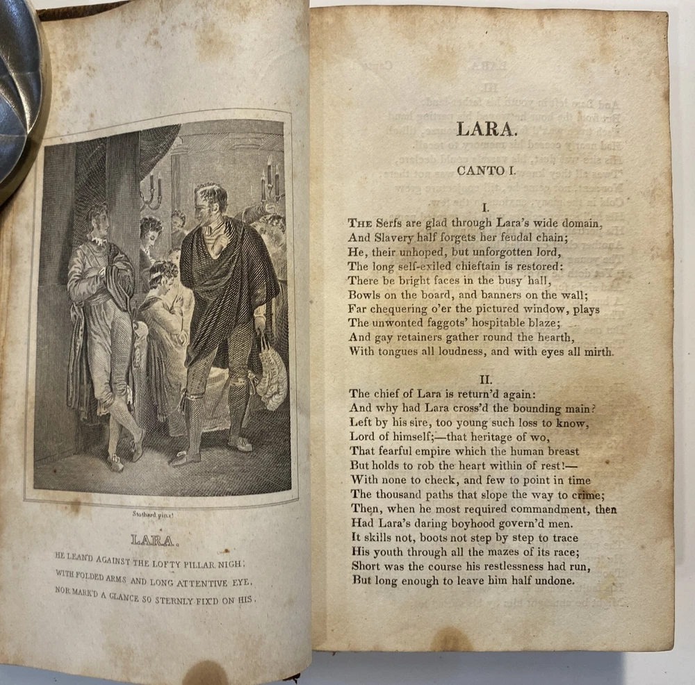 Title: The Works of the Right Hon. Lord Byron. In Eight Volumes. Author: Lord Byron Publisher: R.W. Pomeroy, Philadelphia, Fifth, Below Walnut St. Year: 1825 Details: In eight volumes. Contemporary leather boards with gilt rules to covers and gilt title and decorations to spine. 6 x 3.5 in.