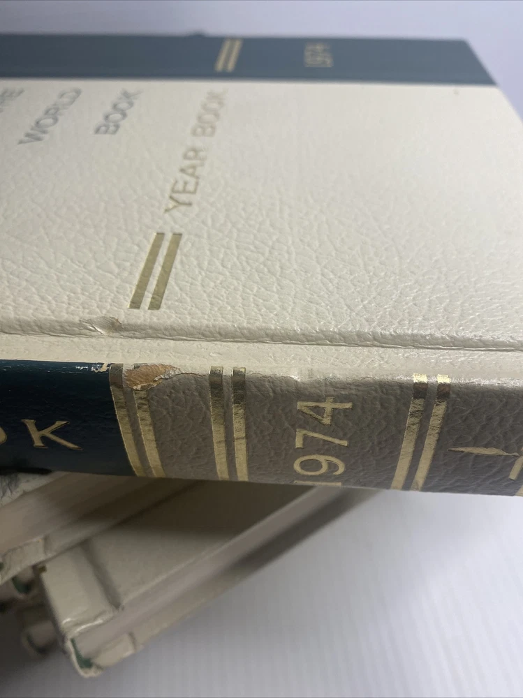 Discover the fascinating world with this comprehensive 10-volume set of The World Book Year Book! Delve into various topics, from history to science, and explore the world through rich illustrations and engaging narratives. This illustrated book set features a faux leather bound cover, making it a great addition to any book collection. This reference encyclopedia is perfect for young adults, ages 9-12, and adults alike, and it is published by Field Enterprises Educational Corporation. Whether you are a fan of historical books, nonfiction, or just want to explore the world, this set has something for everyone. Get lost in the pages of The World Book Year Book and expand your knowledge without worrying about the condition of the books. Books are in very good condition. The book for 1974 has an area of damage on the spine. Please see pictures.
