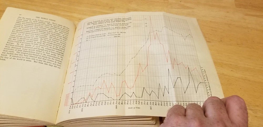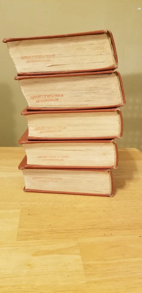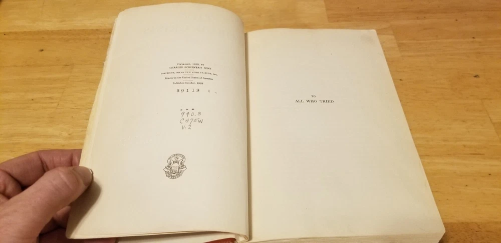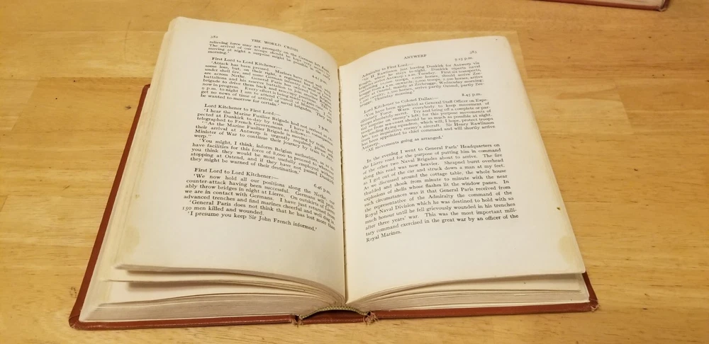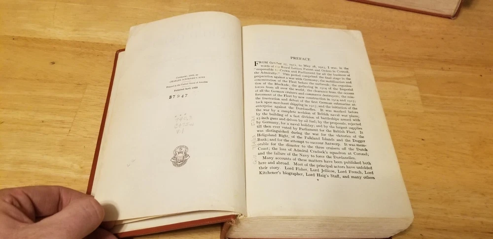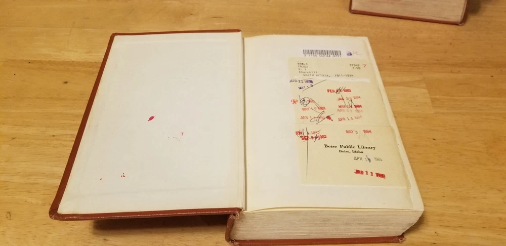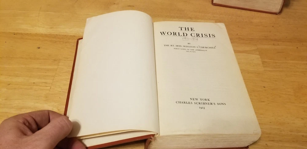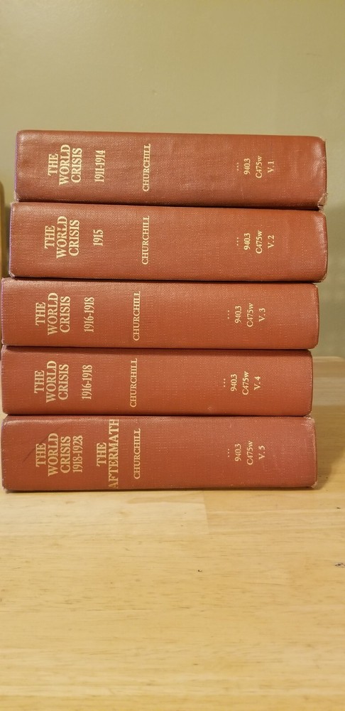 5 out of the 6 volumes of The World Crisis from Winston Churchill Theres are ex Boise Public Library Copies with tags and stamps, embossed stamps, you would associated with it There are some stains, slightly loose pages, ect. The books do not have any musty/wet smells The Books have maps Published by Charles Scribner's Sons in New York Comes with: 1911-1914 Published April 1923 1915- Published Oct 1923 1916-1918- Published 1927 1916-1918 Part 2, Published 1927 The AfterMath- Reprint Published April 1929