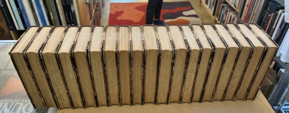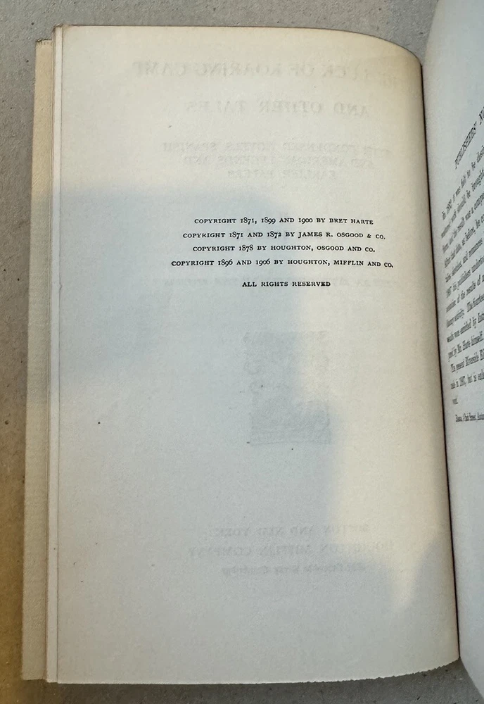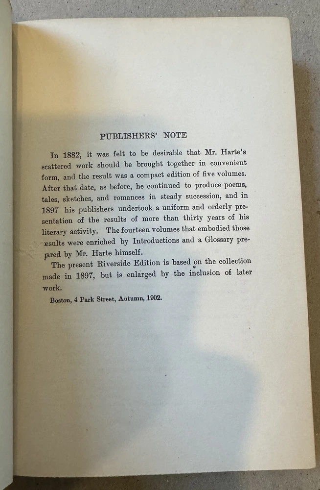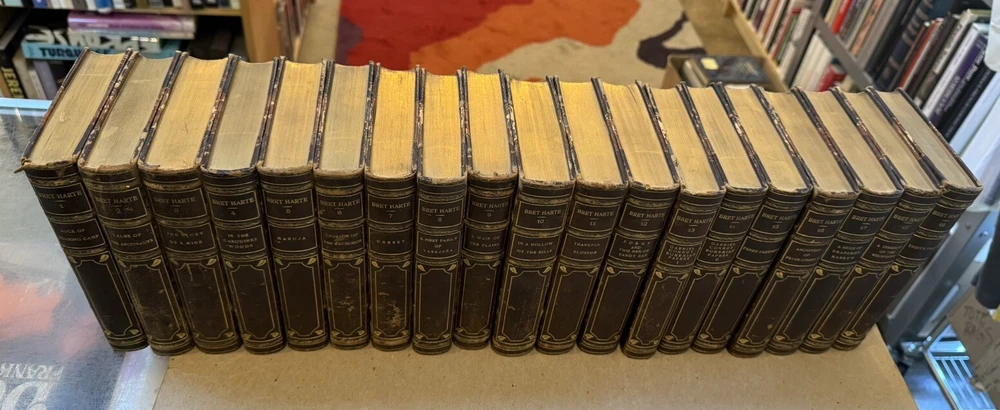 The Writings of Bret Harte [Riverside Edition] Houghton Mifflin Company 1902 19 volumes bound in 3/4 leather with raised bands over marbled boards. Gilt title and decoration to spine edge. VG-- Boards show some wear with rubbing to edges, bumping to corners, and soft hinges; otherwise very good. Rubbing is particularly significant at head of spine edges. Offsetting to title page in Volume I only and interior of all volumes show minor age toning, otherwise very good. * Please see photos.