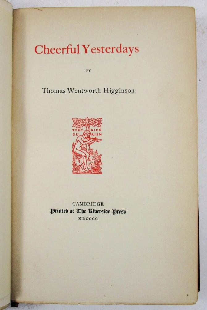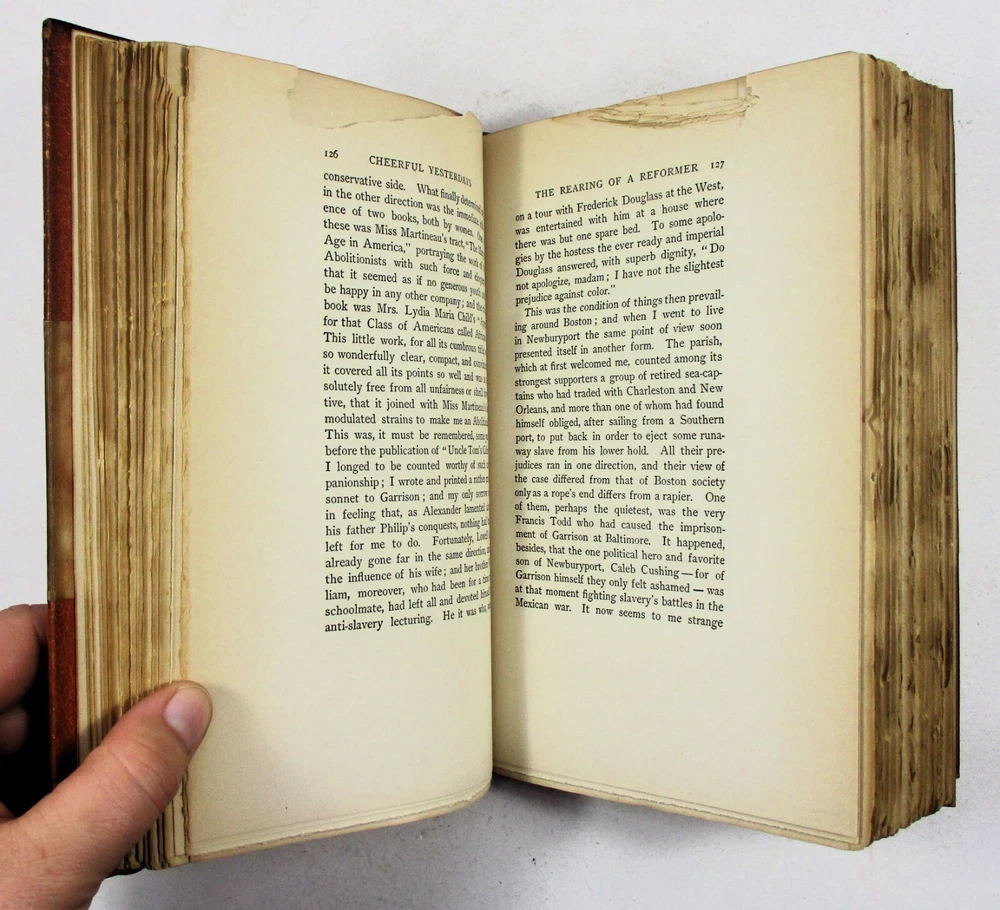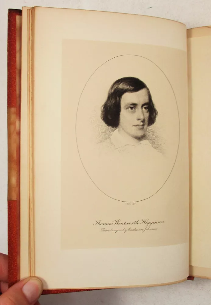 Very Good+ condition quarter-bound hardcover 7 volume set of The Writings of Thomas Wentworth Higginson, including titles Cheerful Yesterdays, Contemporaries, Army Life in A Black Regiment, Women and The Alphabet, Studies in Romance, Outdoor Studies, and Studies in History and Letters . Bound in rust orange leather quarter-binding and printed paper, with banded spine, gold foil lettering, and gilding on head fore edge of textblock. Published 1900 by The Riverside Press in Cambridge, MA. Bindings are sound and pages are unmarked, with the exception of minor chipping, closed tears, and creasing to head fore edge of p.82-150 on Cheerful Yesterdays . Boards are clean and square with faint sunning to spine, very minor rubbing to corners, and minor shelf wear. Please see photos for condition detail. L-1120