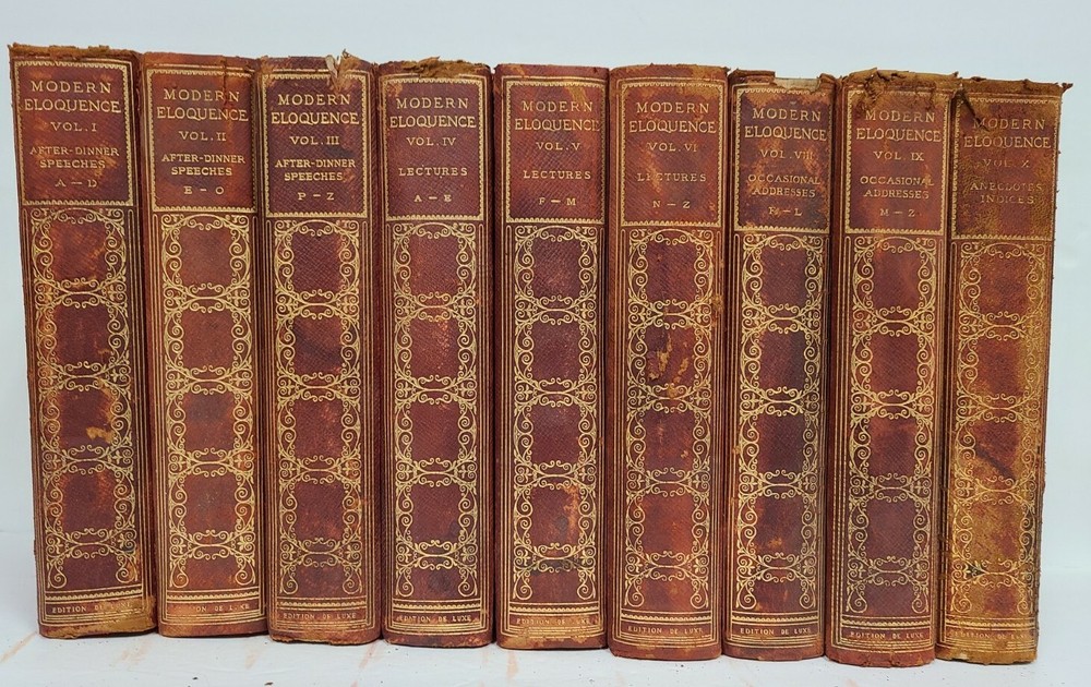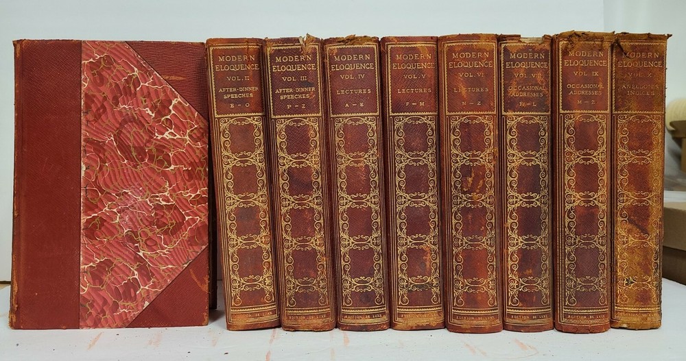 John Morris,1900. Complete 10 volume set. Very good hardcover with red marbled boards and endpapers. Half-bound, red-leather. Each volume has been read, or at least viewed, but remains intact and solid. There are scuffs, light staining, rub marks, bumping and other moderate wear as would be expected, given the age. Straight, secure spine and overall clean interiors. Each has a tissue covered frontispiece. Volume I: After-Dinner Speeches, A - D; Volume II: After-Dinner Speeches, E - O; Volume III: After-Dinner Speeches, P - Z; Volume IV: Lectures A - E; Volume V: Lectures F - M; Volume VI: Lectures N - Z; Volume VII: Occasional Addresses A - D; Volume VIII: Occasional Addresses E - L; Volume IX: Occasional Addresses M- Z; Volume X: Anecdotes Indices. Lovely decorator sewed