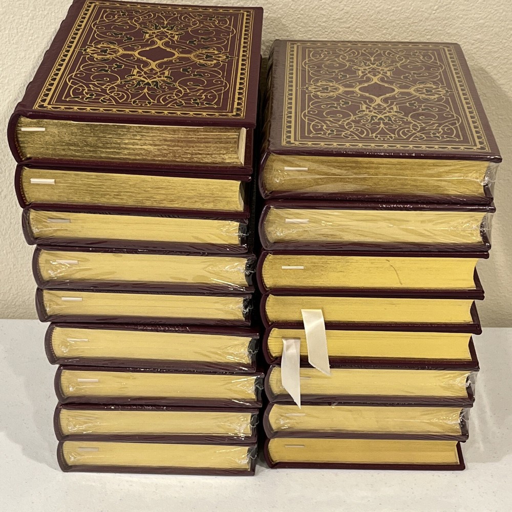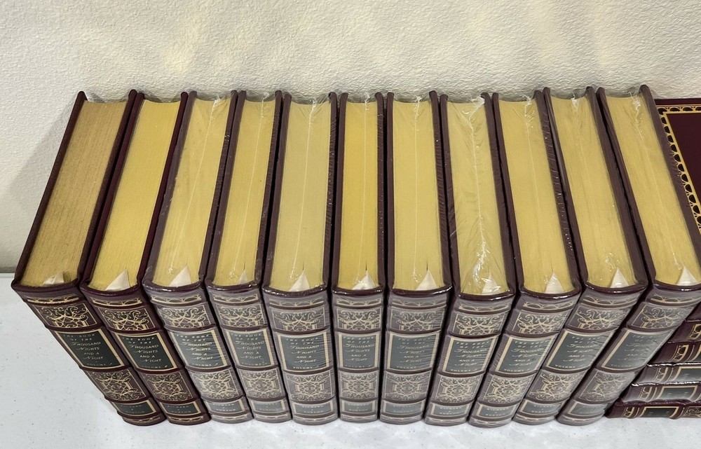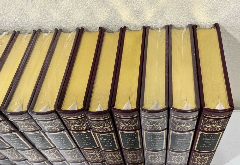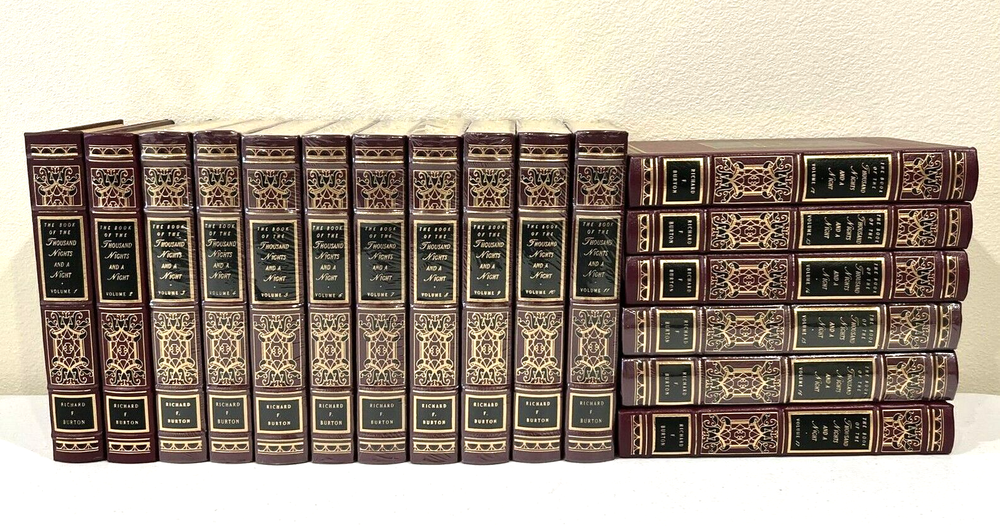 For sale is an Easton Press leather bound 17 volume book set, The Book of The Thousand Nights and a Night, by Richard Burton. Eleven of the volumes are still in the shrink wrap. The other six volumes are in very good condition. A couple of books have a minor mark on the gold gilt end pages.
