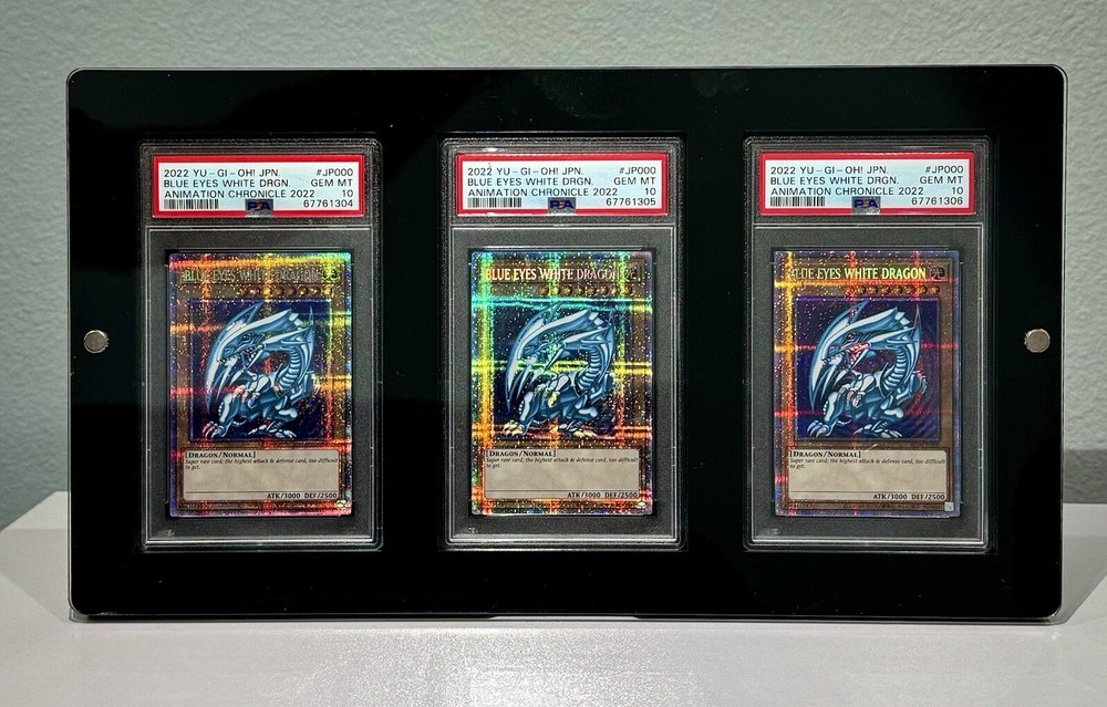 Three PSA 10 Blue-Eyes White Dragon’s (Starlight Rares). PSA card display included with purchase. Condition is New. All cards were graded in the same lot which adds to the uniqueness. Blue eyes White Dragon is the most iconic card in Yugioh so these are must haves for any collector looking to bring awe to those who view their collection.