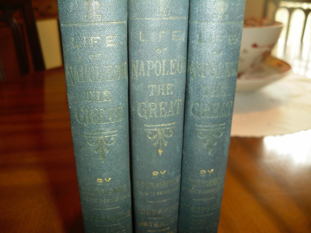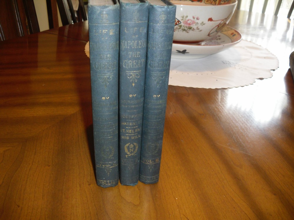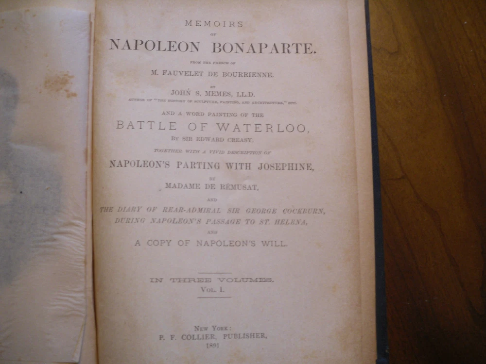 This is a fine three- volume set of the Memoirs of Napoleon Bonaparte , from the French of M. Fauvelet De Bourrienne, by John S. Memes, LLD. These also include "A Word Painting of the Battle of Waterloo", by Sir Edward Creasy, together with "A Vivid Description of Napoleon's Parting With Josephine", by Madame De Remusat, and "The Diary of Rear-Admiral Sir George Cockburn During Napoleon's Passage to St. Helena", and a Copy of Napoleon's Will. The set includes sixteen engraved illustrations. The Frontispieces are: Vol. I: " Napoleon", Vol. II: "Josephine, Empress of France", Vol. III: "The Last Earthly Moments of Napoleon". The printed title on the front covers and spines show "Life of Napoleon the Great". The gold print on the fronts and spines are faded as expected in books of this age, but the books are tight and sound. They are string-tied and embossed on front and back. Inside each cover is the owner's stamp "Private Library of L.H. Charbonnier" The translator's preface to the First Edition is dated July, 1830. Vol. I is 472 pp., Vol. II - 429 pp., and Vol. III - 448 pp. This set is a great primary source for historians and lovers of this important time in the history of western civilization. Shipping and handling in the U.S. is FREE. All other destinations would be adjusted.