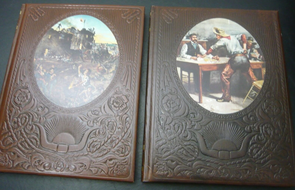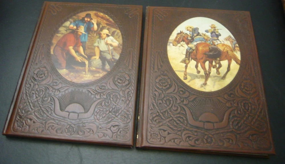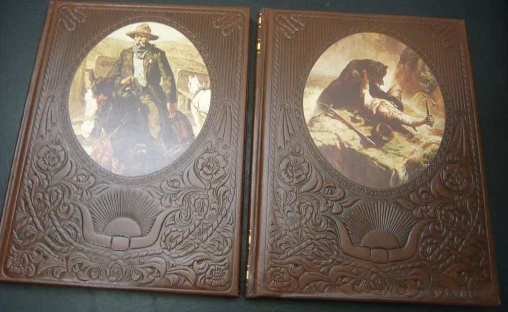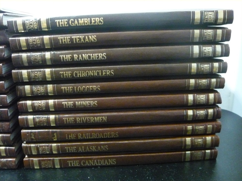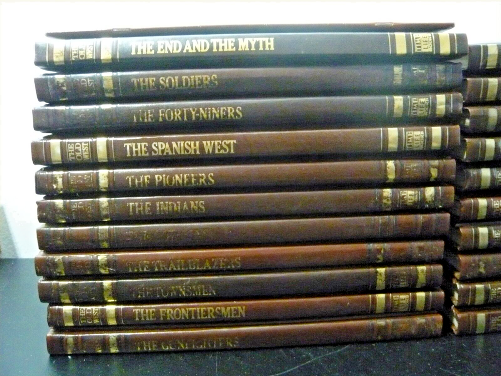 This is a set of 21 of 26 total volumes of Old West Time Life series. They have been stored in a SoCal bedroom since they were purchased. Not sure why the series is not complete, but this is all the volumes I could find. Some of "gold" embossing is wearing off or oxidizing. All pages are very crisp, and I doubt they were read. This set had been stored stacked upon one another for years and some of the flexible leather binding has impressions from the books stacked on top, as I have shown in several pictures.